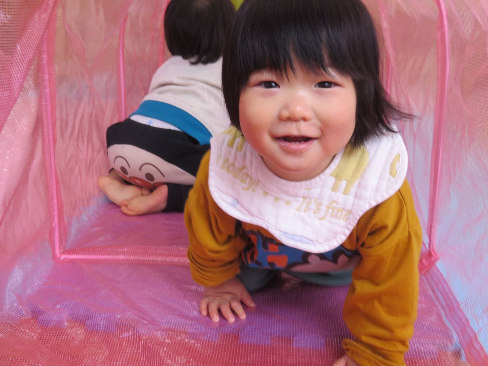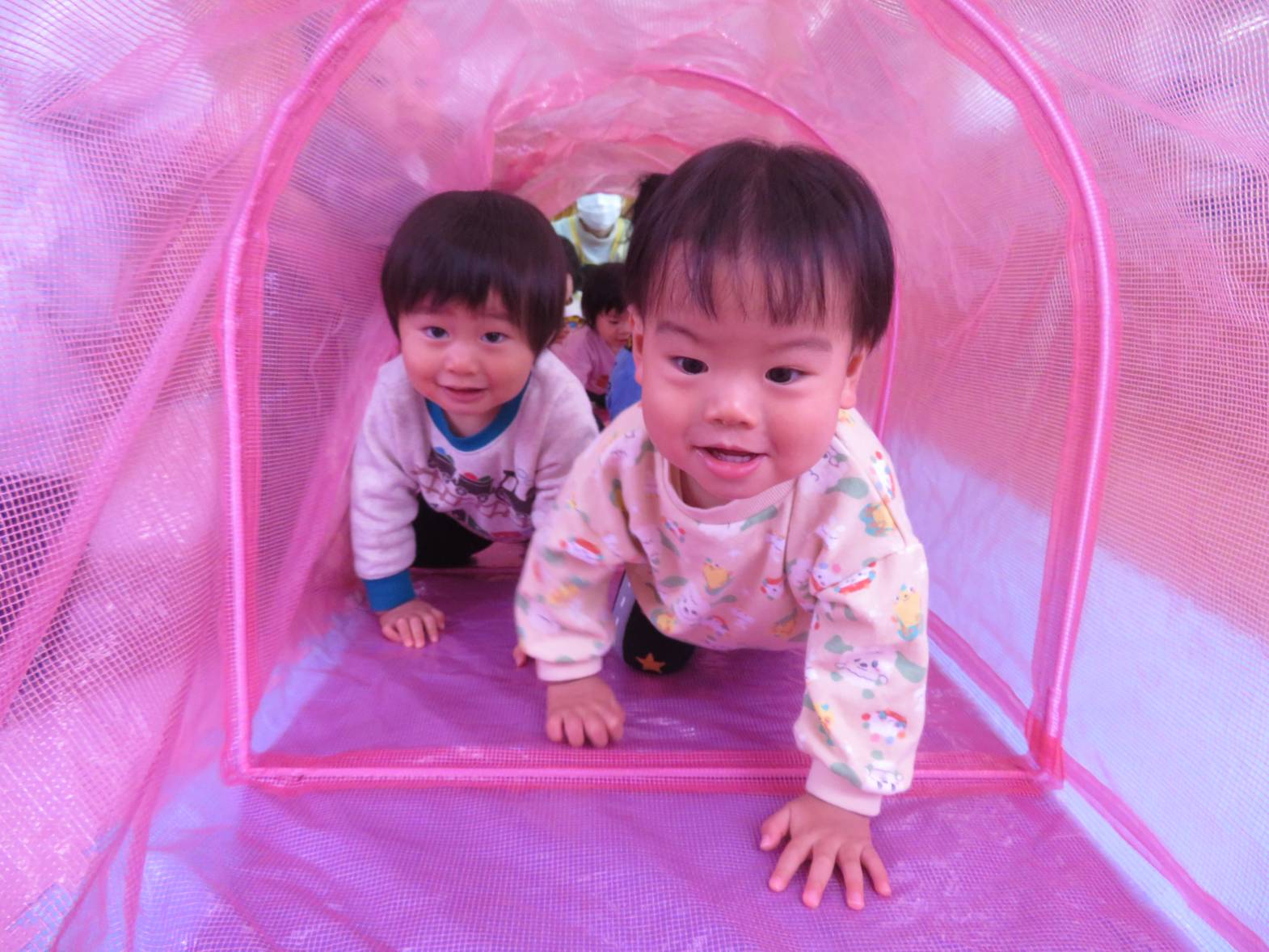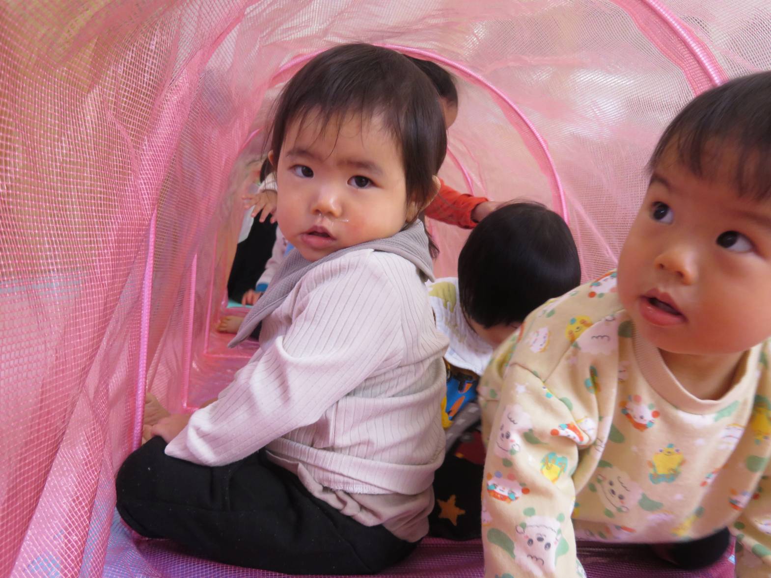 今日の天気はあいにくの雨… ということで、ひよこ組さんはお部屋でトンネルを使って遊びました! トンネルの中に入ると、「わー!」「きゃー!」と楽しそうな声が♪ なかなか出てきたくないのか、中では大渋滞なご様子。 それでも、出てきては「ばぁ!」とかわいらしい表情をするひよこ組さんでした!