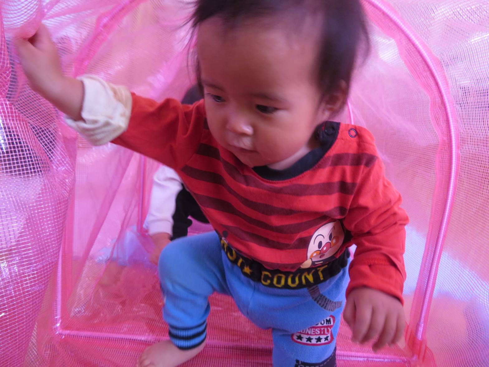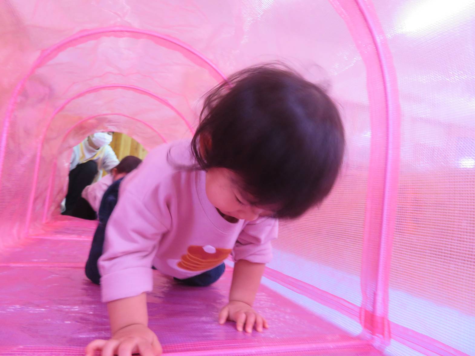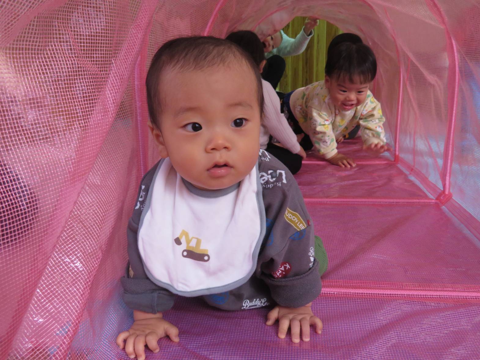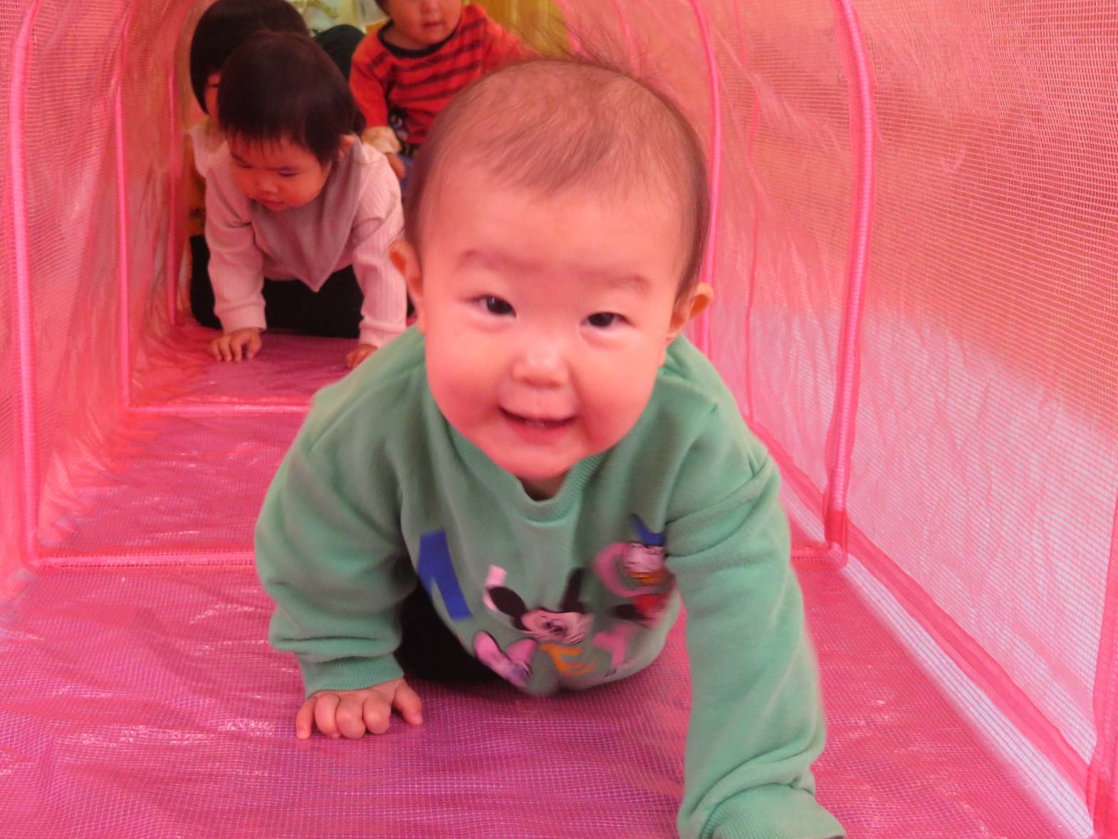 今日の天気はあいにくの雨… ということで、ひよこ組さんはお部屋でトンネルを使って遊びました! トンネルの中に入ると、「わー!」「きゃー!」と楽しそうな声が♪ なかなか出てきたくないのか、中では大渋滞なご様子。 それでも、出てきては「ばぁ!」とかわいらしい表情をするひよこ組さんでした!