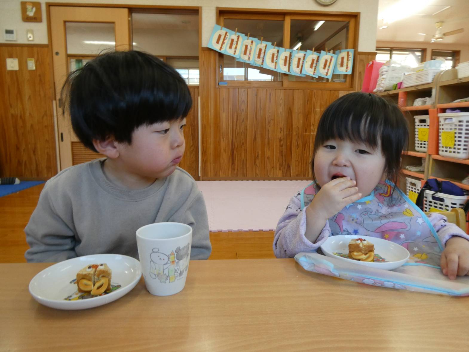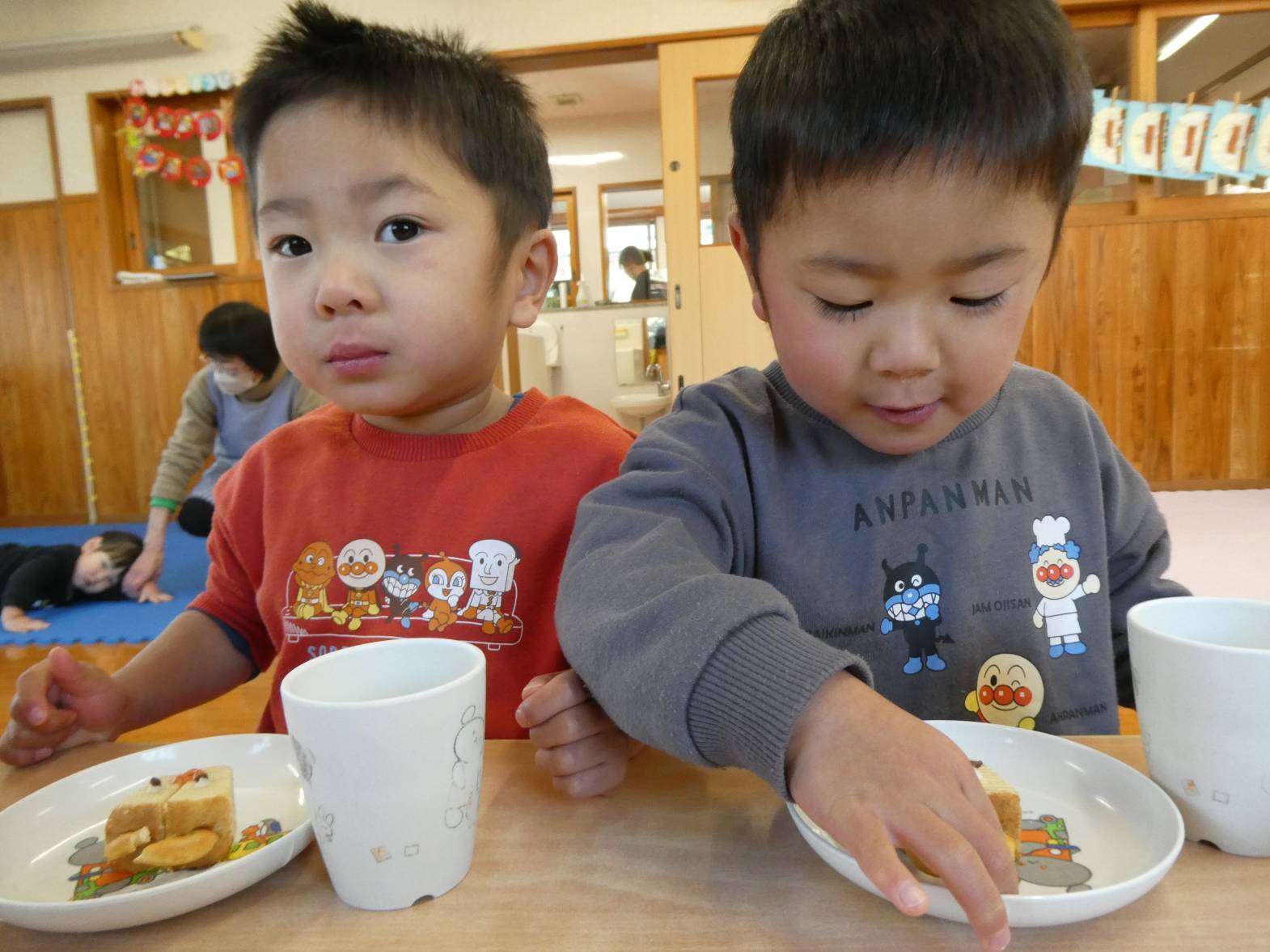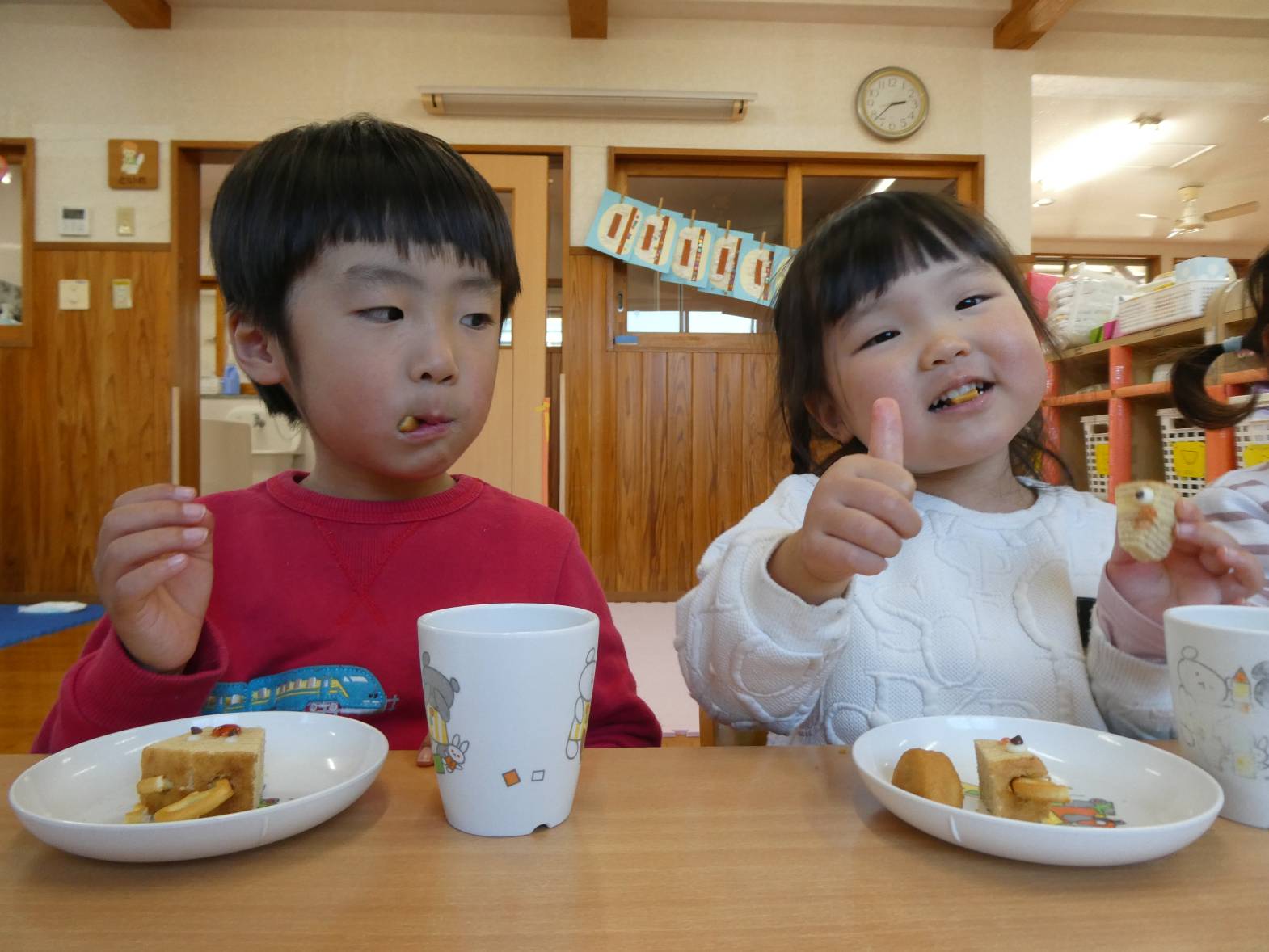 今日は、月に一度のわくわくメニューの日! 配膳されると、「うわ~、美味しそう!」ときらきらした笑顔のぱんだ組さん。 食べ進めていくと、「人参が星の形になってるー!」と発見した子どもたち。 嬉しそうに食べる姿が見られました。 おやつでは、トナカイバームクーヘンでした。 「かわいい♡」と子どもたちに大人気です。 お腹も満たされて大満足なぱんだ組さんでした!