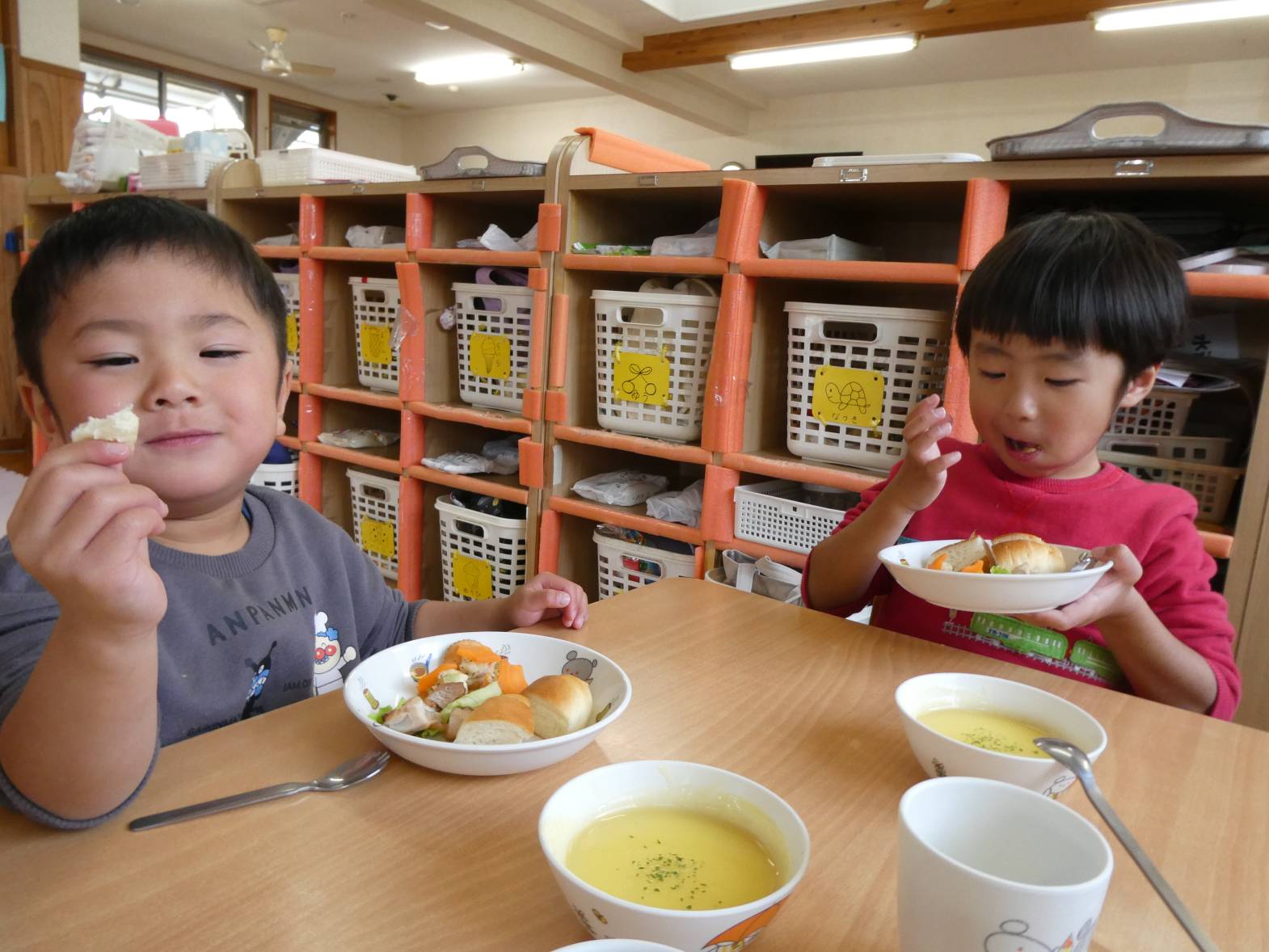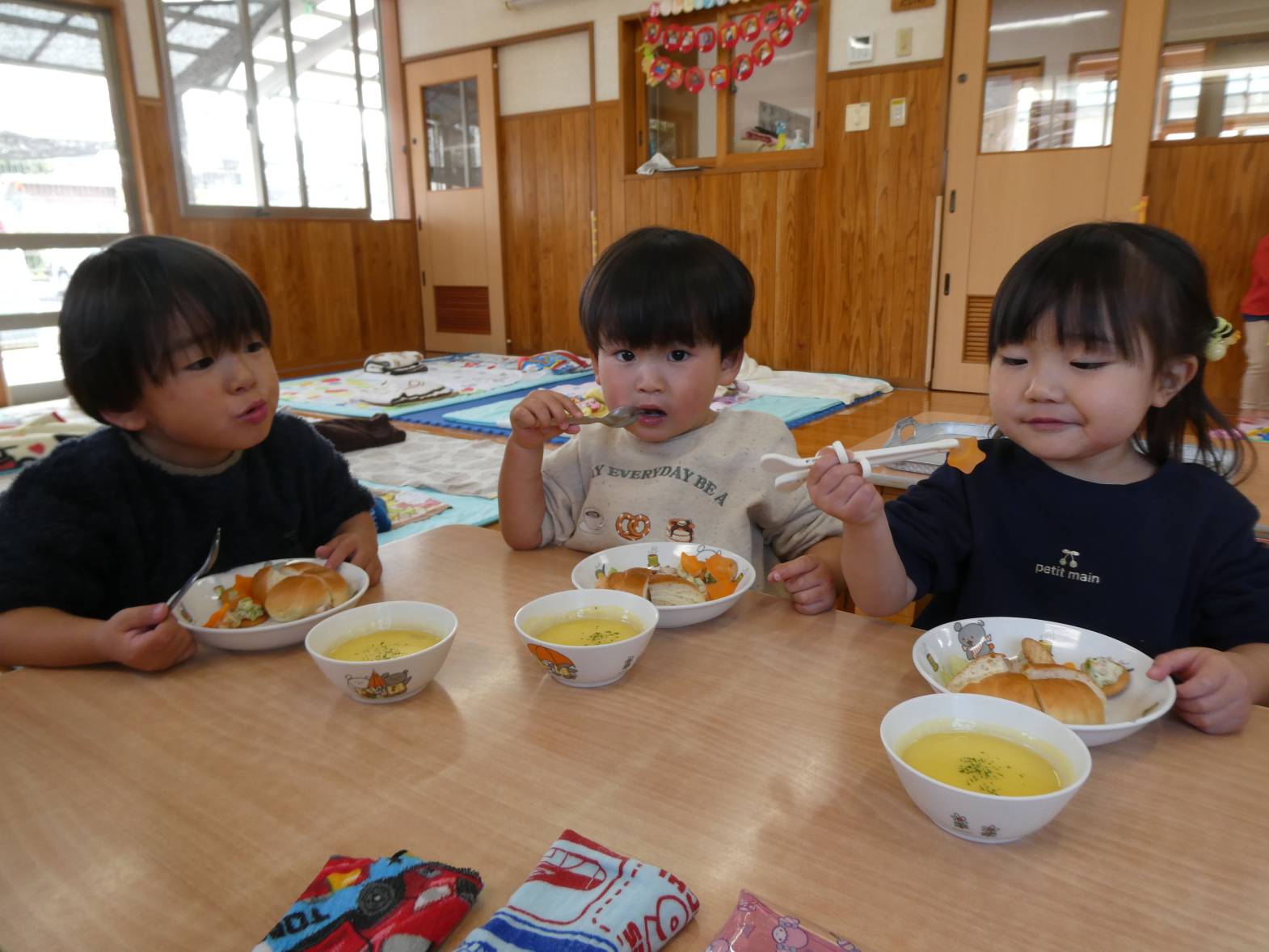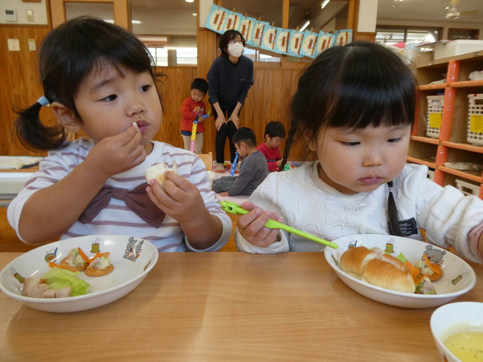 今日は、月に一度のわくわくメニューの日! 配膳されると、「うわ~、美味しそう!」ときらきらした笑顔のぱんだ組さん。 食べ進めていくと、「人参が星の形になってるー!」と発見した子どもたち。 嬉しそうに食べる姿が見られました。 おやつでは、トナカイバームクーヘンでした。 「かわいい♡」と子どもたちに大人気です。 お腹も満たされて大満足なぱんだ組さんでした!