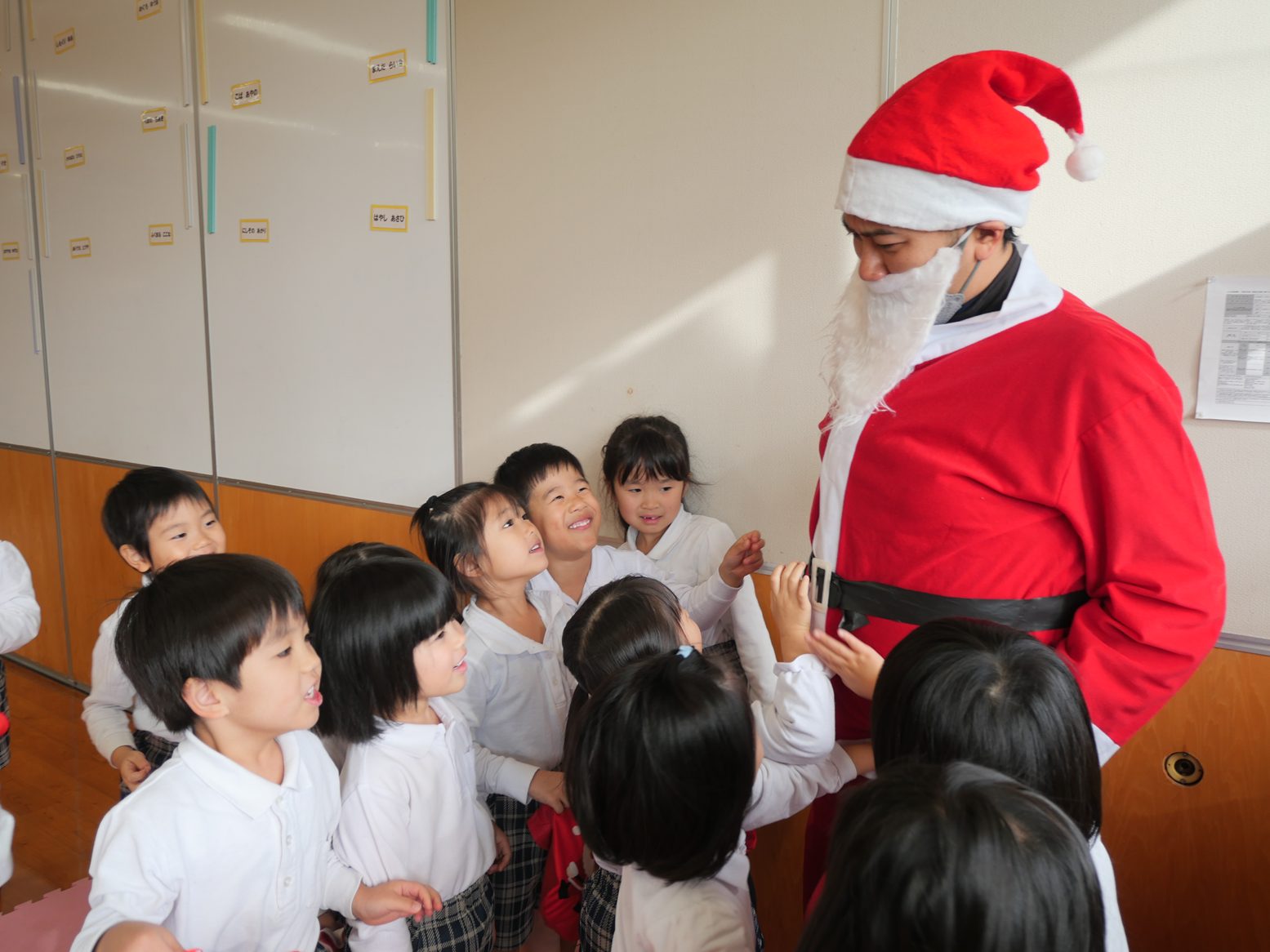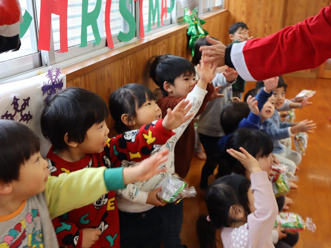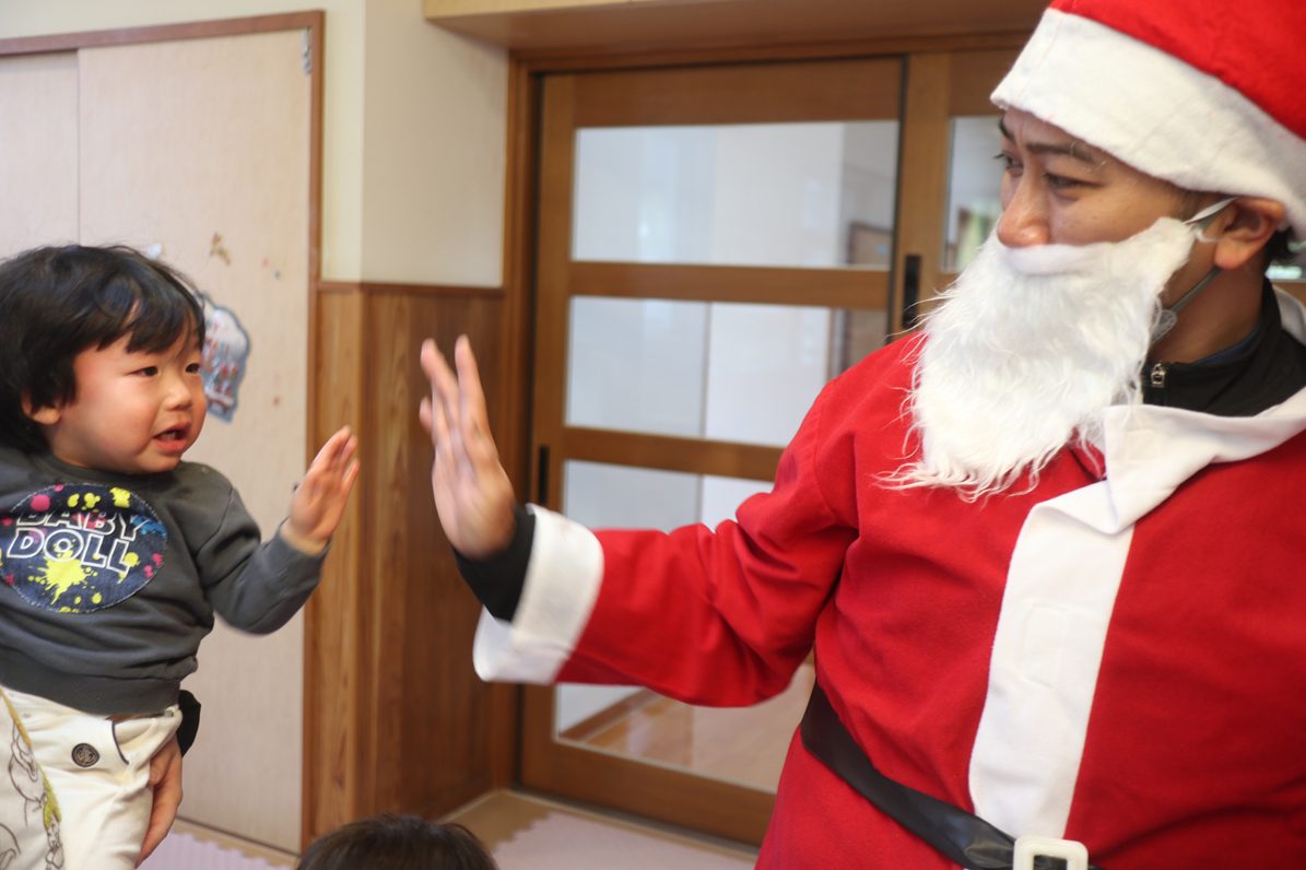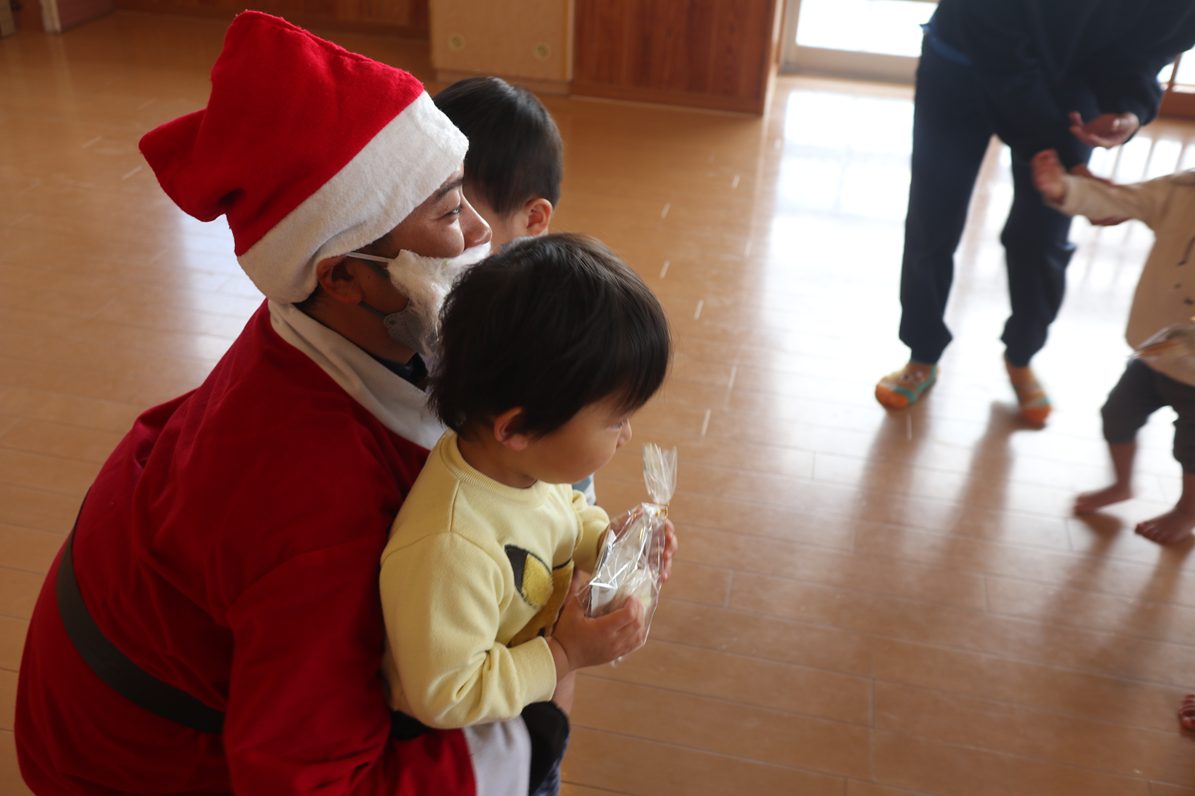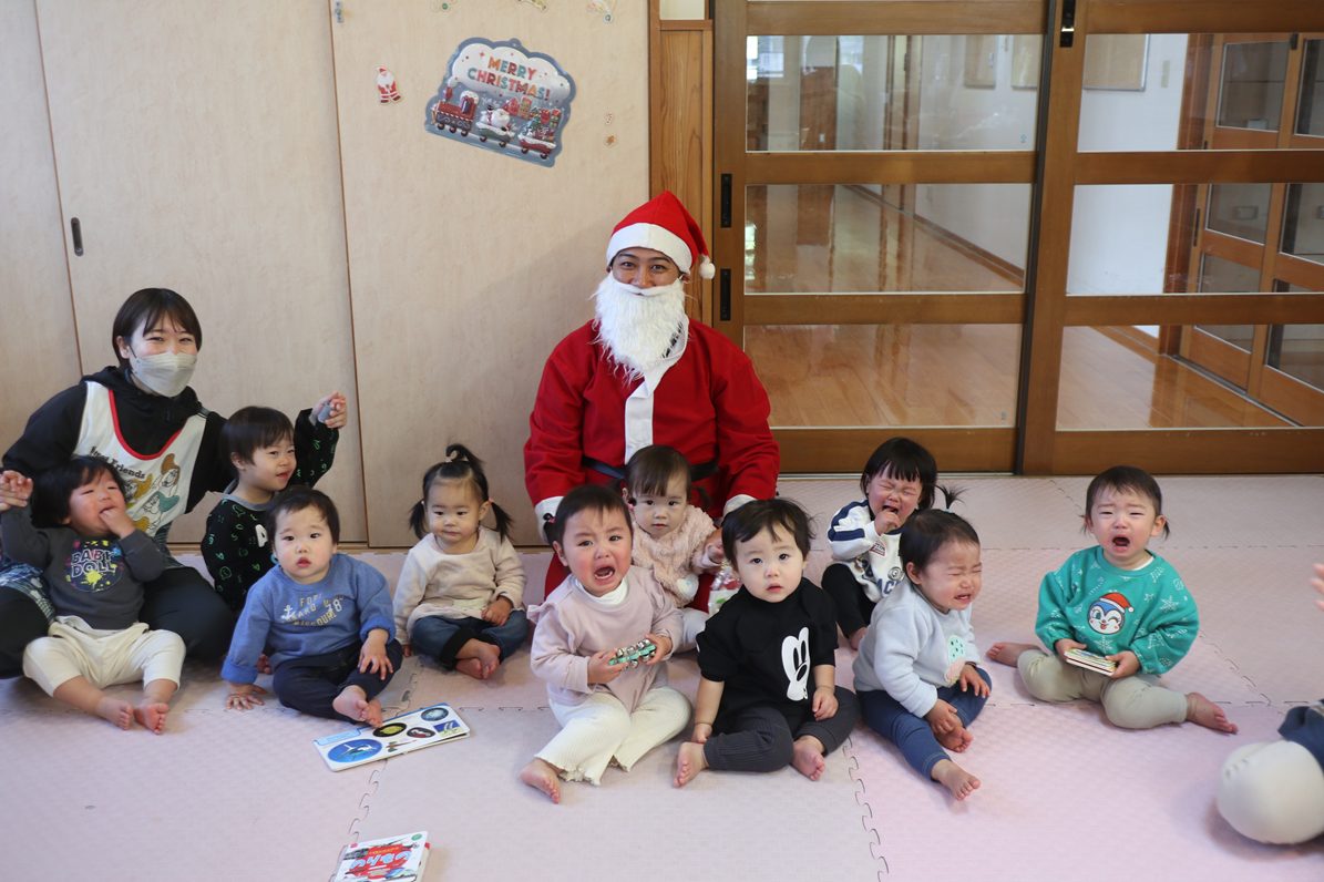 今日は、クリスマスです! 登園してくると、「朝起きたらサンタさん来てたよ!」「おもちゃもらったよ!」と嬉しそうに話してくれた子どもたち。「保育園にも来てくれるかな~?」とソワソワしている様子が見られました。 お部屋で過ごしていると、待ちに待ったサンタさんの登場! 驚いて泣いてしまったり、「サンタさんだー!」と喜んだりと反応はそれぞれでしたが、プレゼントを貰うと「やったー!」と嬉しそうな姿が見られました。 「サンタさんまた来てね!」と楽しい時間を過ごすことができたようです。