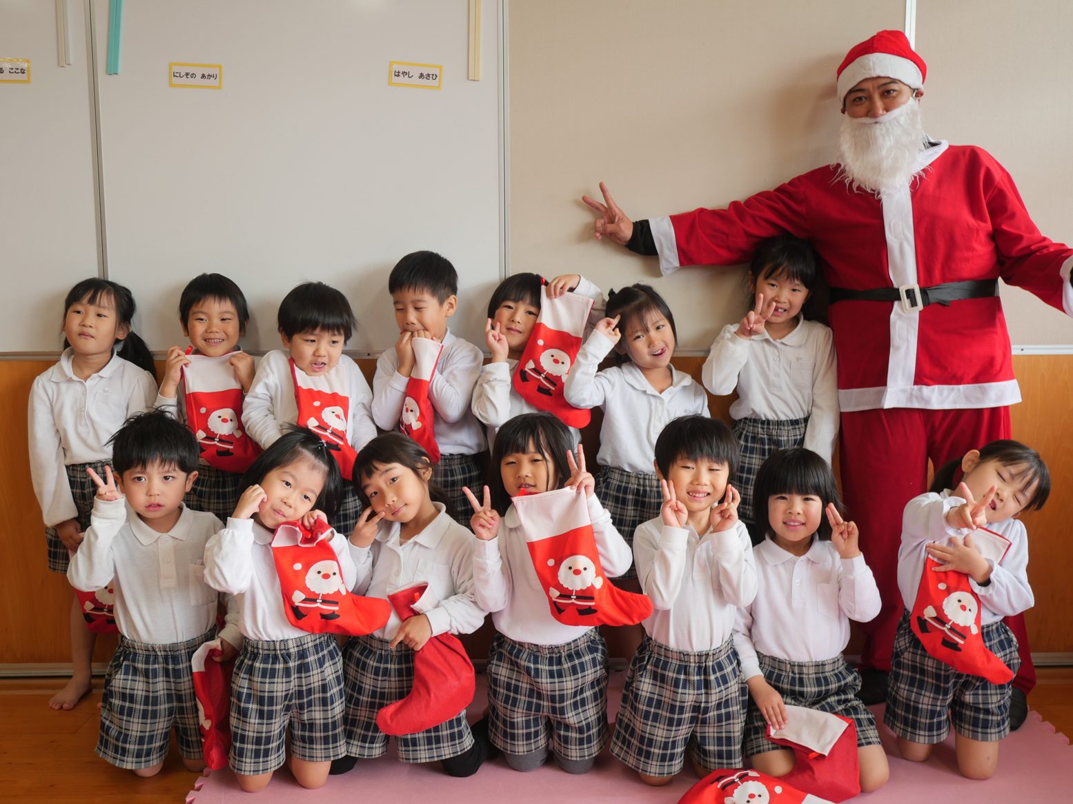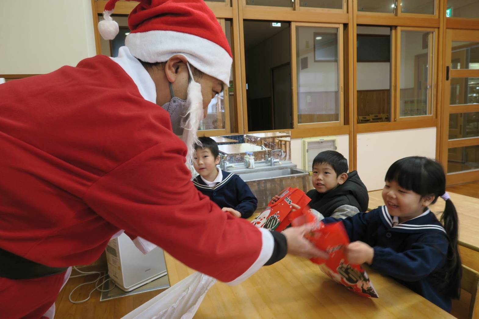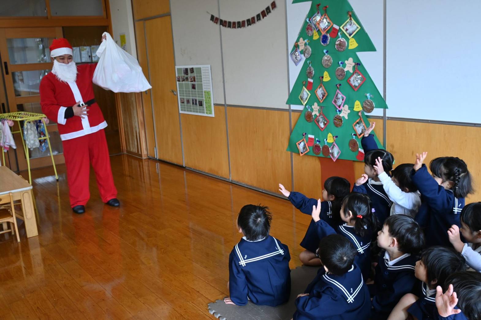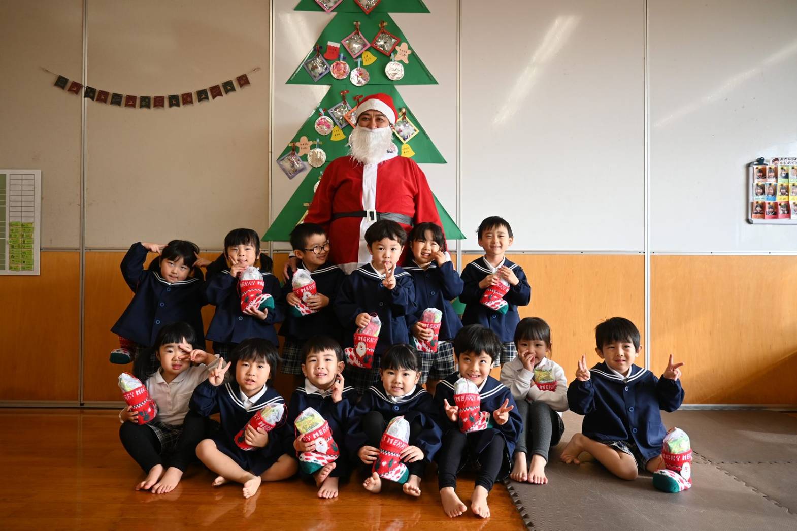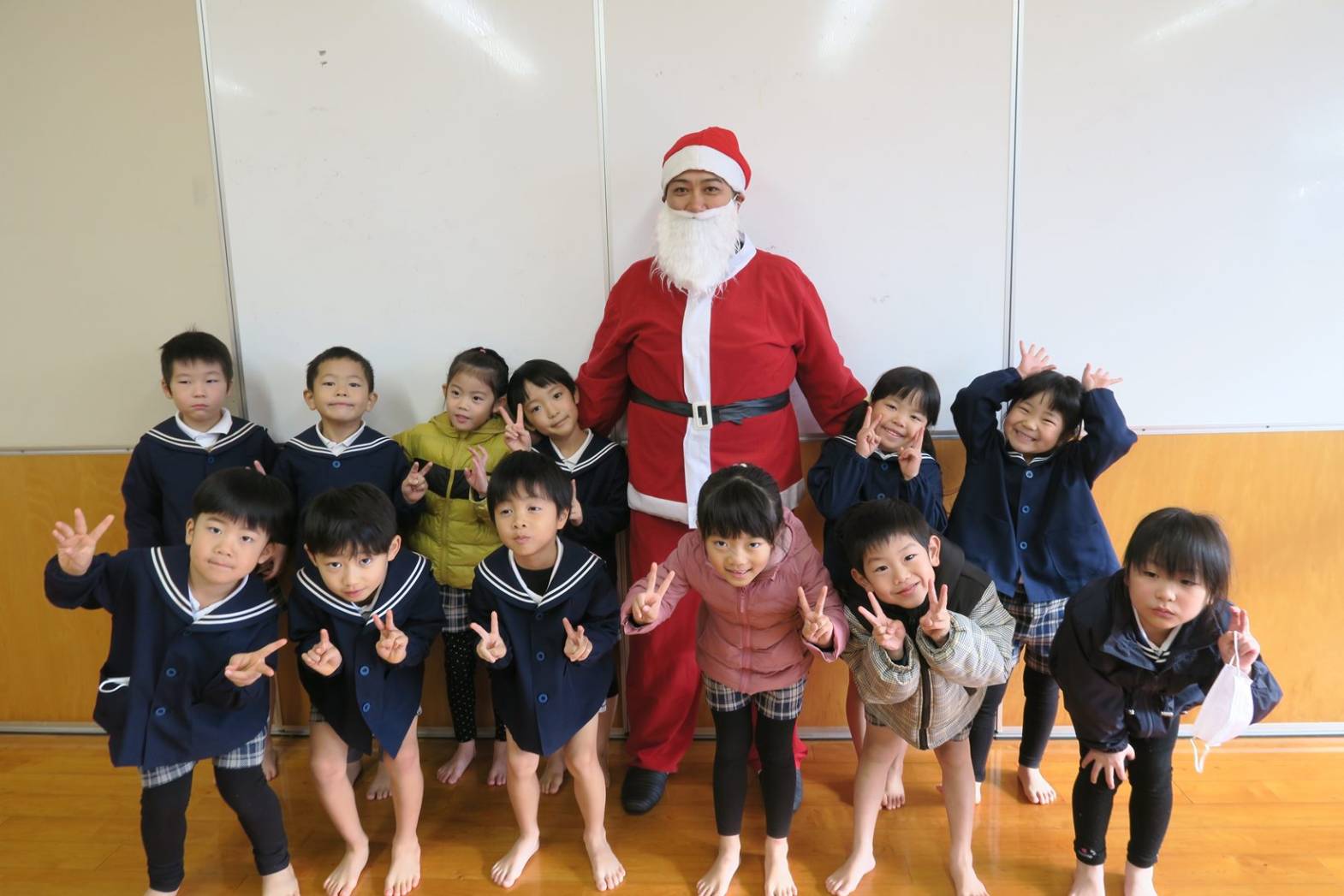 今日は、クリスマスです! 登園してくると、「朝起きたらサンタさん来てたよ!」「おもちゃもらったよ!」と嬉しそうに話してくれた子どもたち。「保育園にも来てくれるかな~?」とソワソワしている様子が見られました。 お部屋で過ごしていると、待ちに待ったサンタさんの登場! 驚いて泣いてしまったり、「サンタさんだー!」と喜んだりと反応はそれぞれでしたが、プレゼントを貰うと「やったー!」と嬉しそうな姿が見られました。 「サンタさんまた来てね!」と楽しい時間を過ごすことができたようです。
