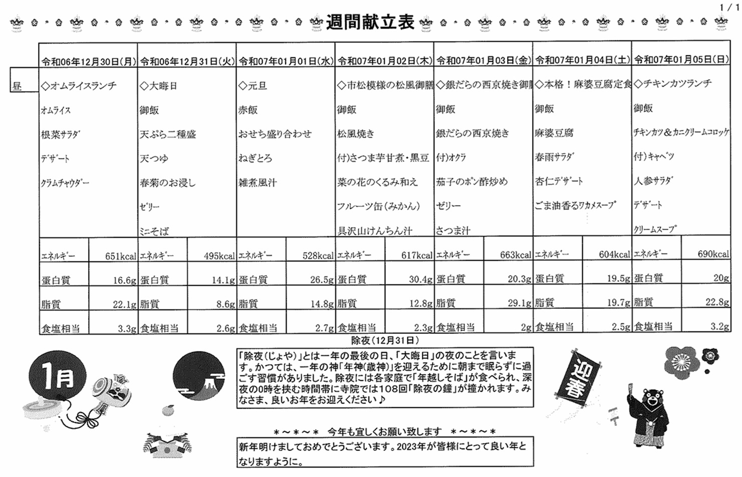 12月30日(月)~1月5日(日)の献立表になります。ぜひご覧ください。