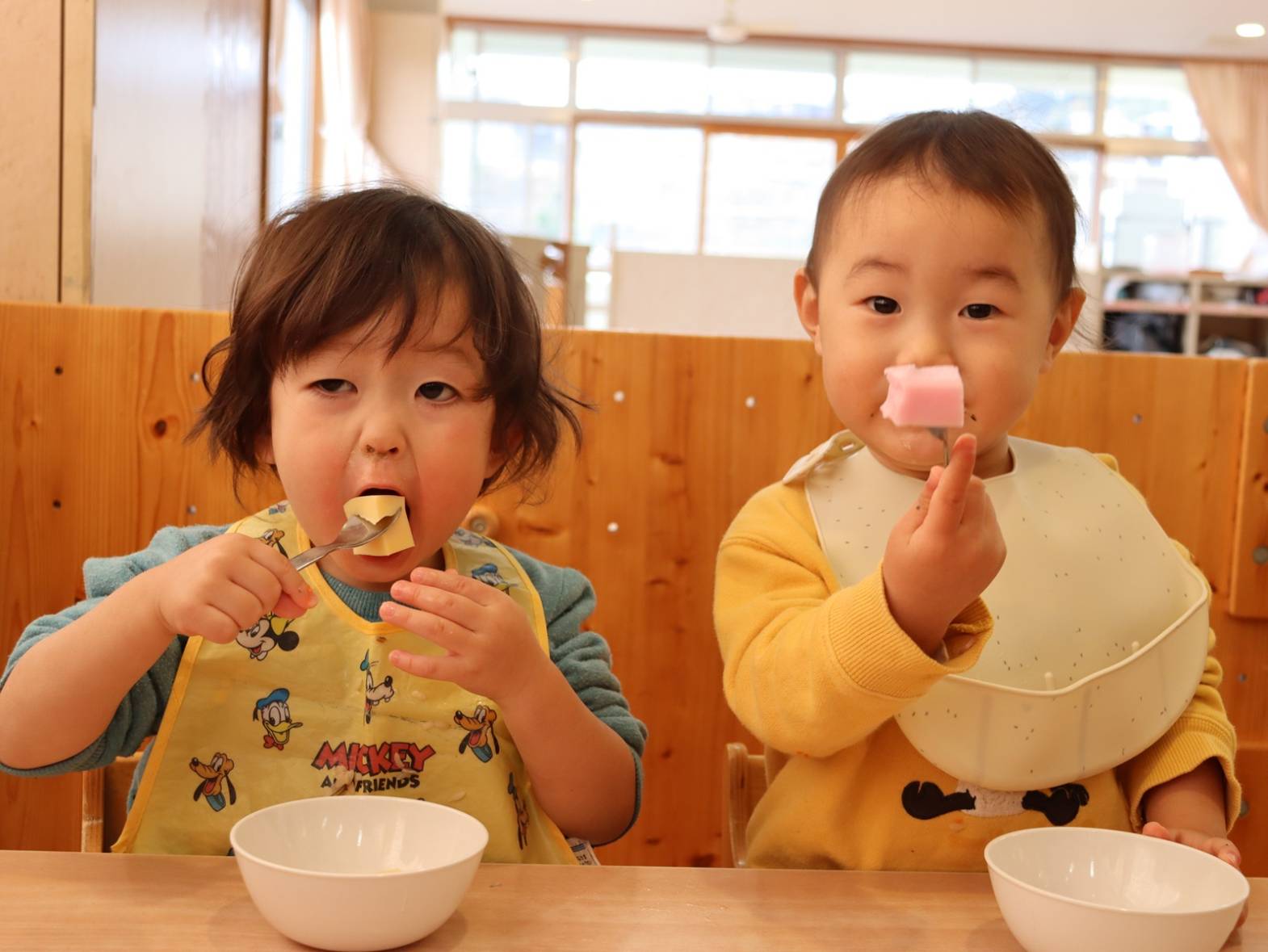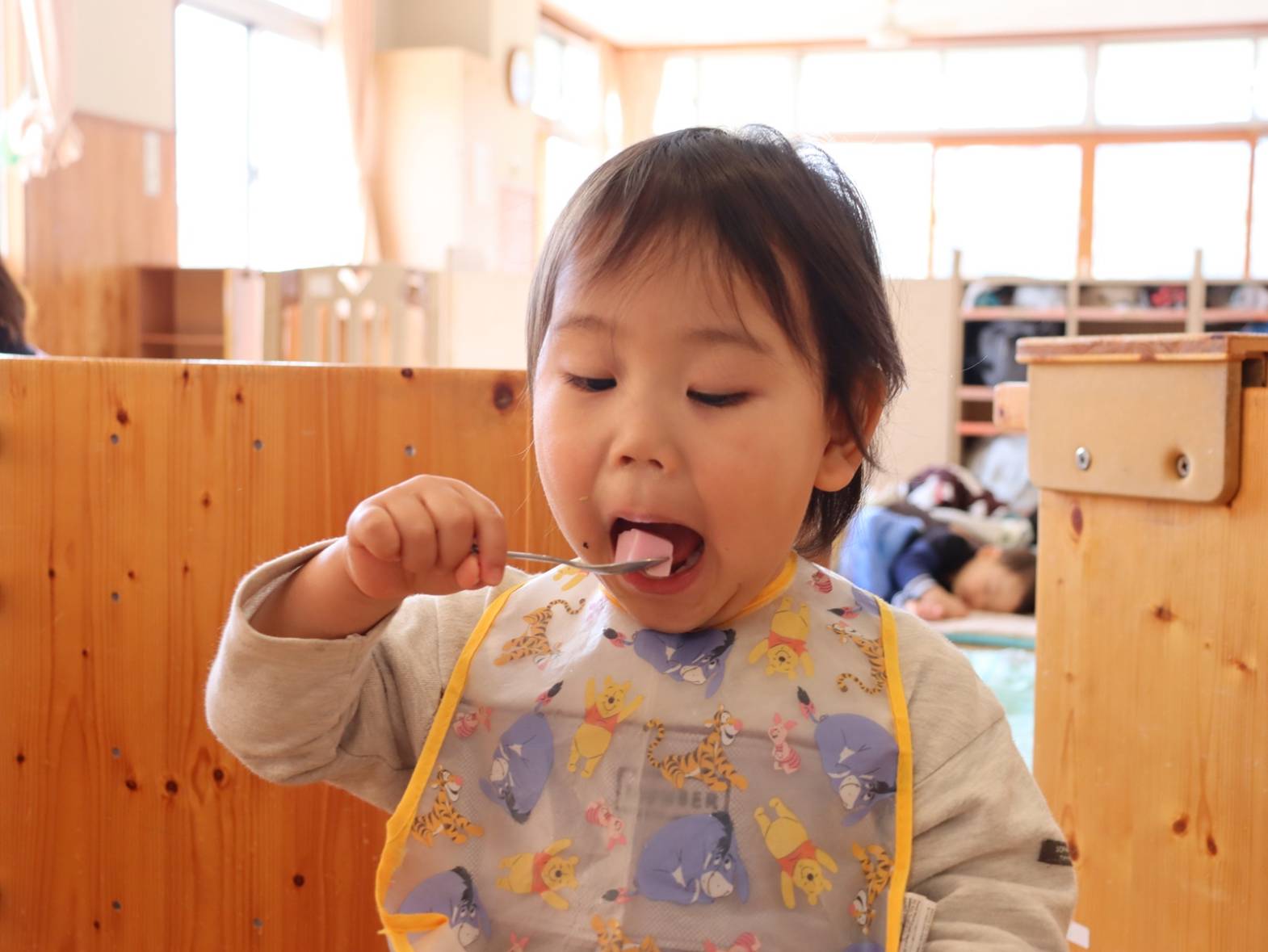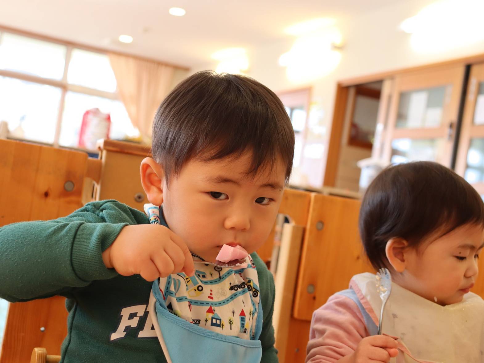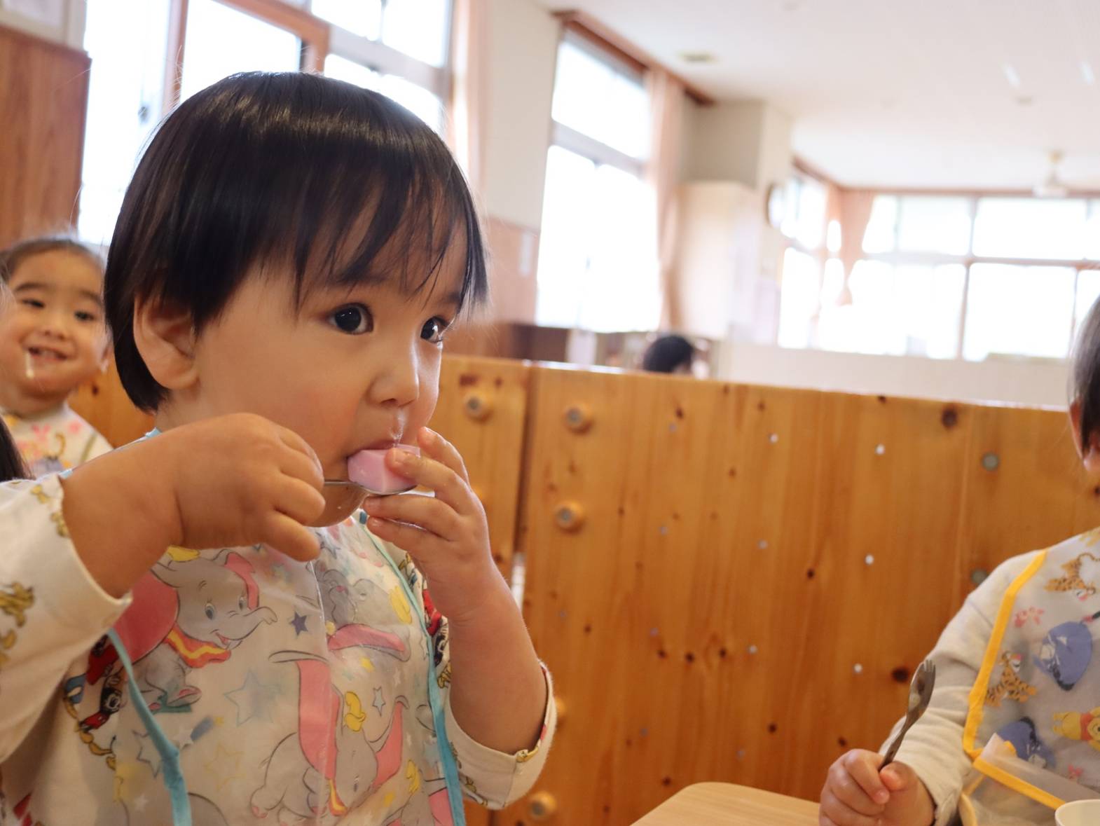 新年が明けて更に元気いっぱいな姿が見られている、こあら組さん。 今年最初のわくわくメニューは、食後にババロアが出ました! 「ピンクだ!」「かわいいね!」とおいしそうなデザートに楽しみな様子が見られます。 大きな口でパクっと食べると「おいしいね!」「あまーいね!」 とニコニコ笑顔がたくさん見られました。 ババロアのおかわりまでして「おいしかった!」「まだおかわりしたかった!」と 大満足な様子の子どもたちでした。