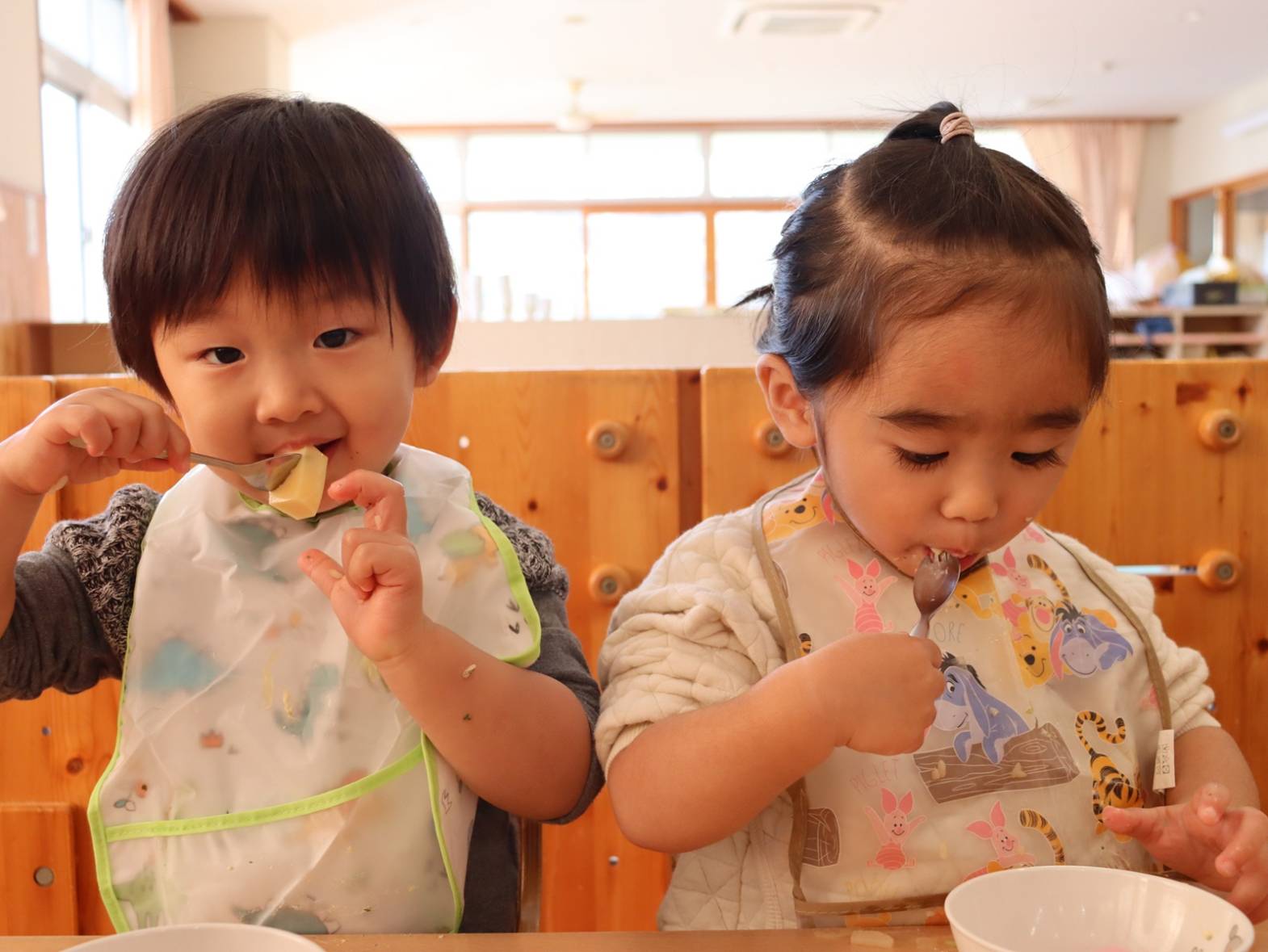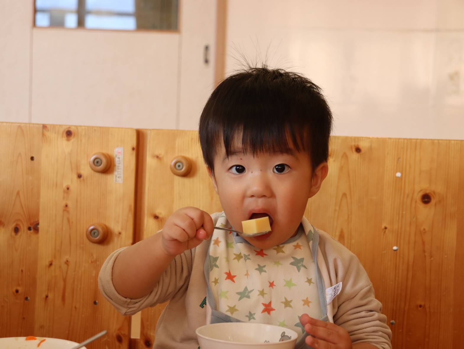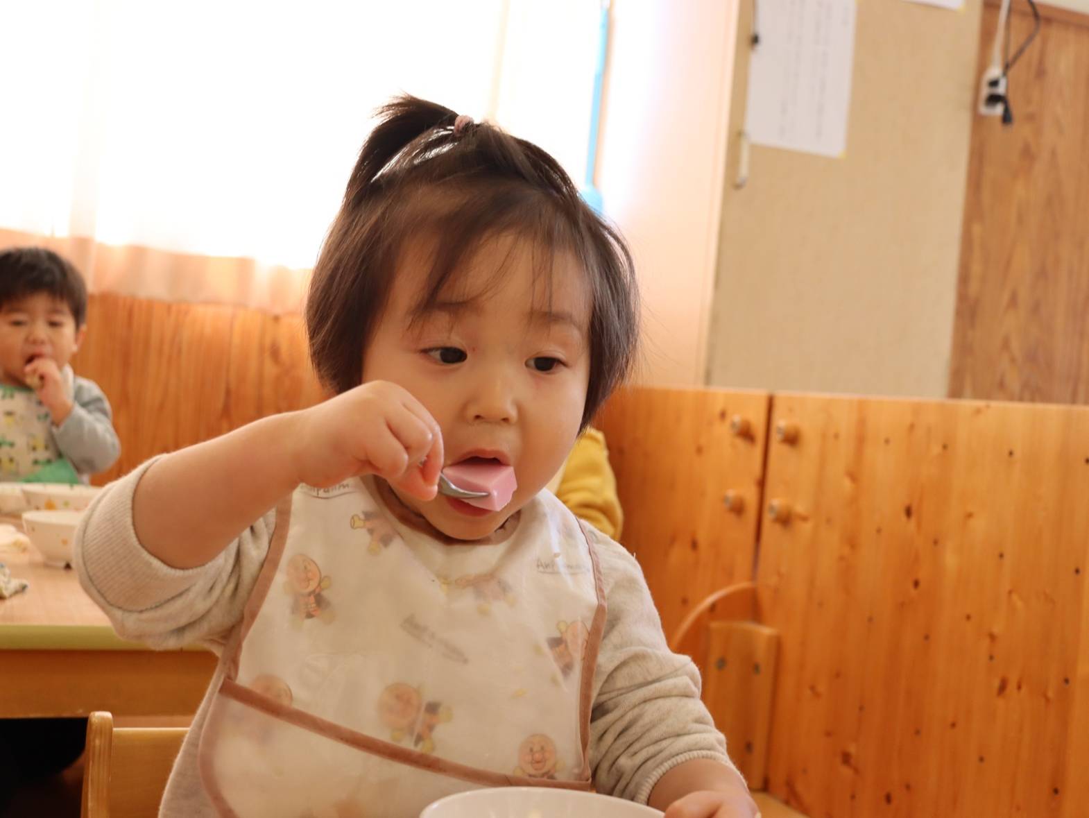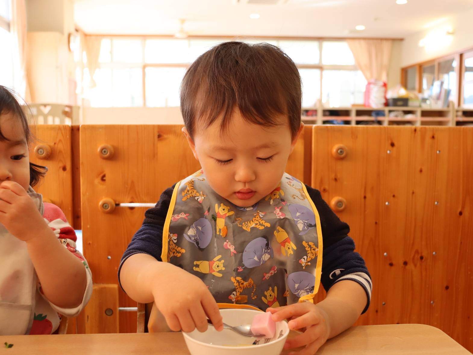 新年が明けて更に元気いっぱいな姿が見られている、こあら組さん。 今年最初のわくわくメニューは、食後にババロアが出ました! 「ピンクだ!」「かわいいね!」とおいしそうなデザートに楽しみな様子が見られます。 大きな口でパクっと食べると「おいしいね!」「あまーいね!」 とニコニコ笑顔がたくさん見られました。 ババロアのおかわりまでして「おいしかった!」「まだおかわりしたかった!」と 大満足な様子の子どもたちでした。