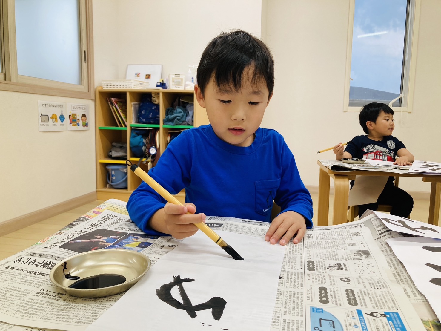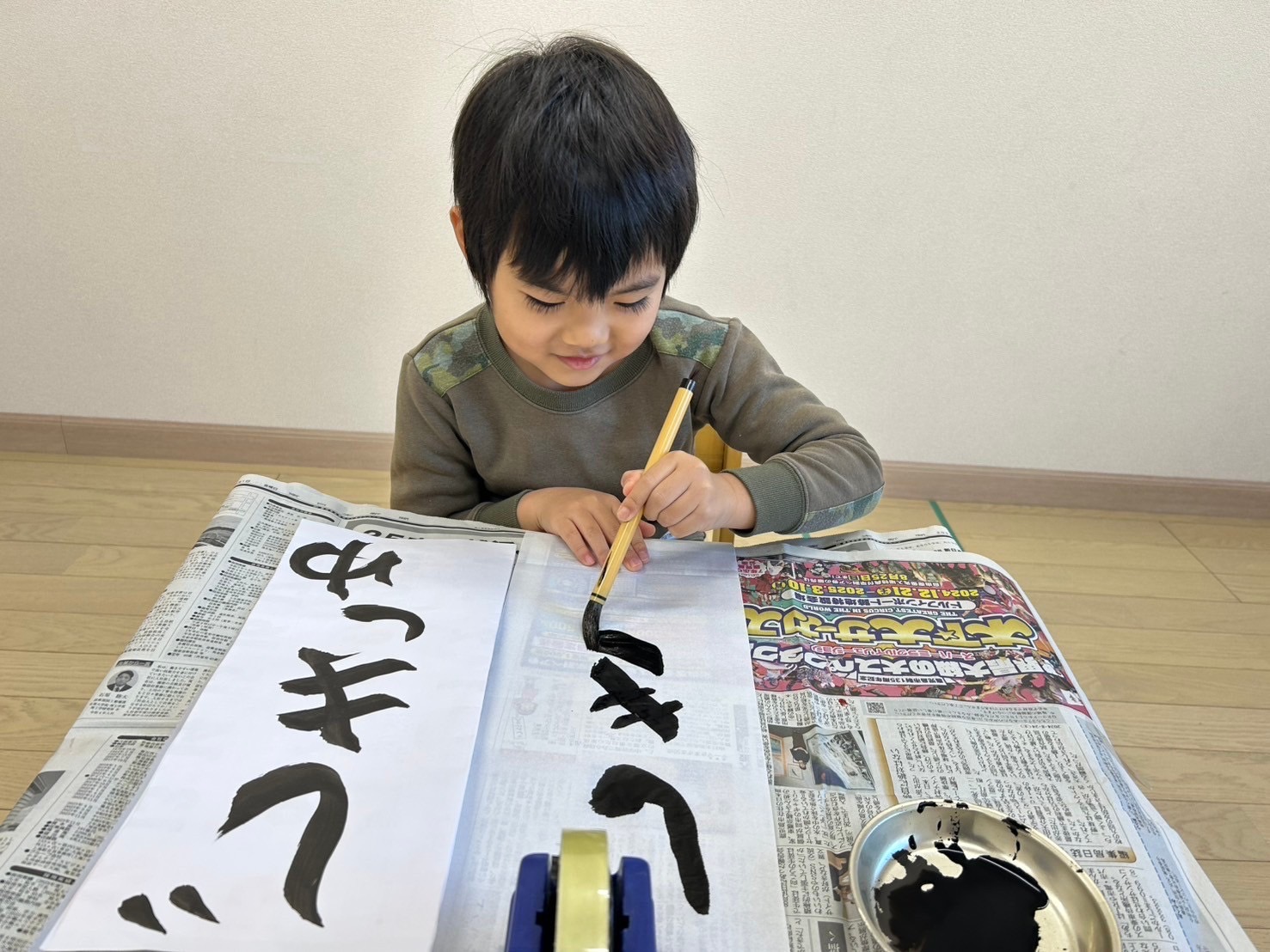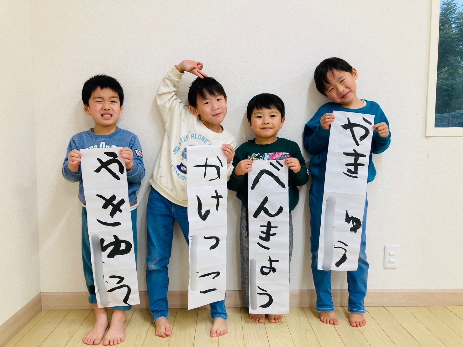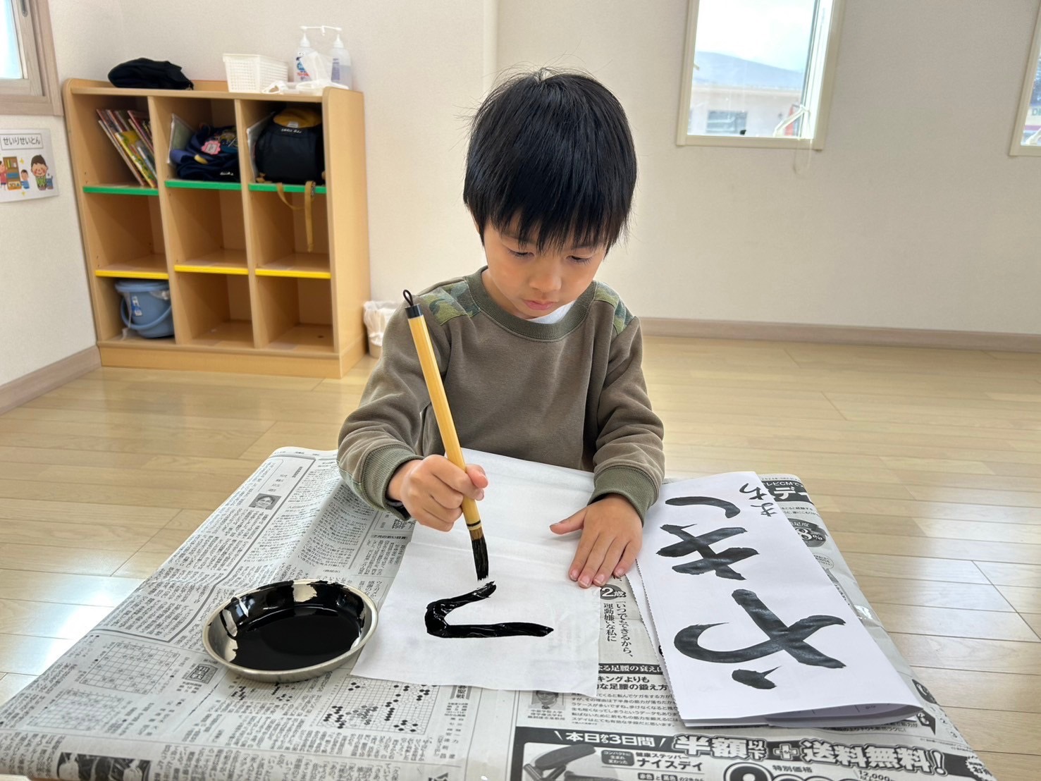 年長さんの子どもたちで、書き初めに挑戦しました! 「小学校で頑張りたいこと」をテーマに考え、「勉強も、運動も、宿題もある!」と頑張りたいことが沢山あり、小学校生活を楽しみにしている姿が見られました! お手本を見ながら、真剣に練習する姿が見られ、1文字1文字丁寧に書くことが出来ていました! 完成した書き初めを見て、「綺麗に書けた!」と大満足な様子な子どもたちでした!