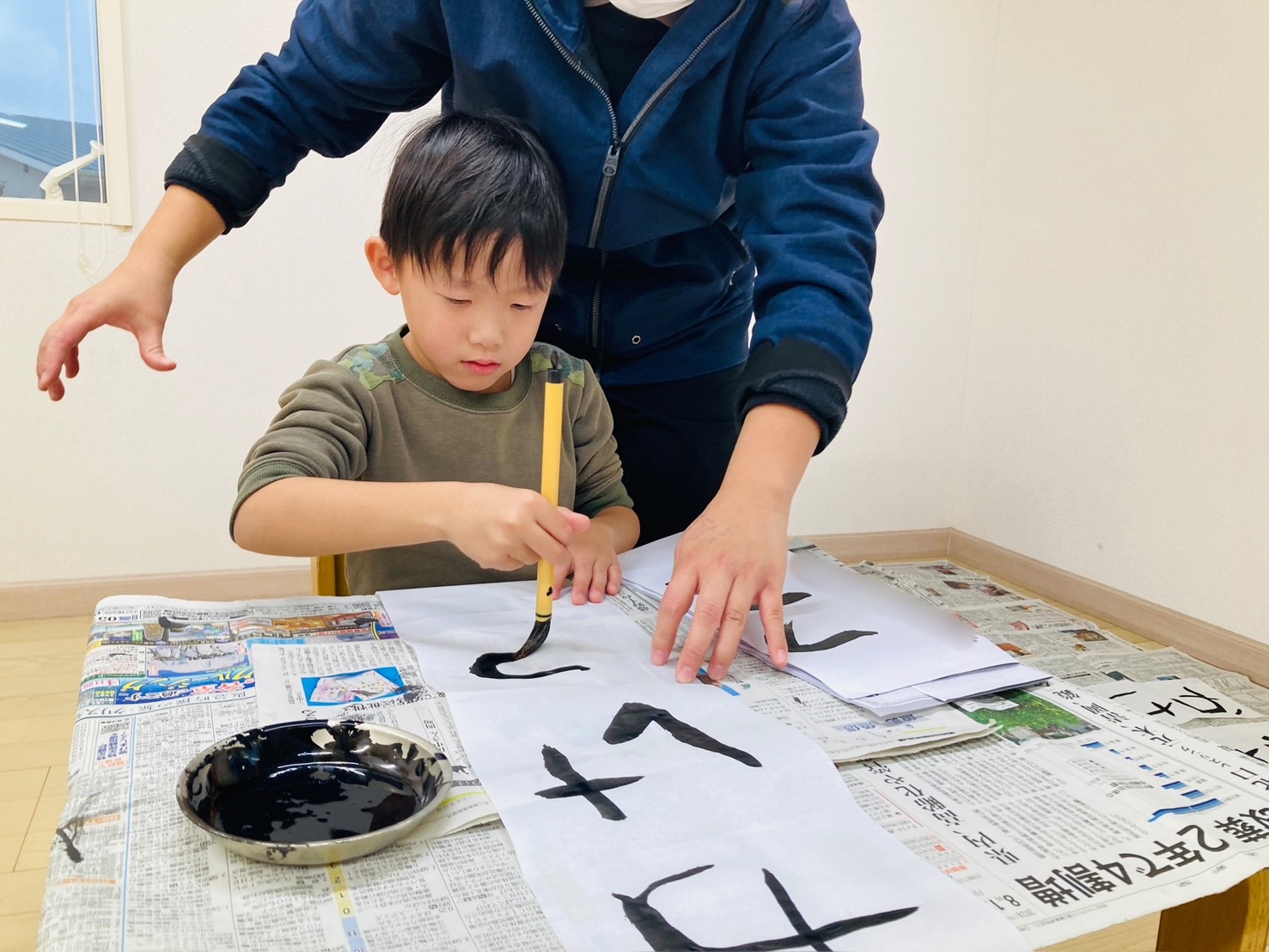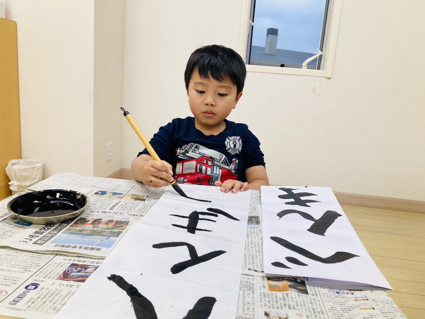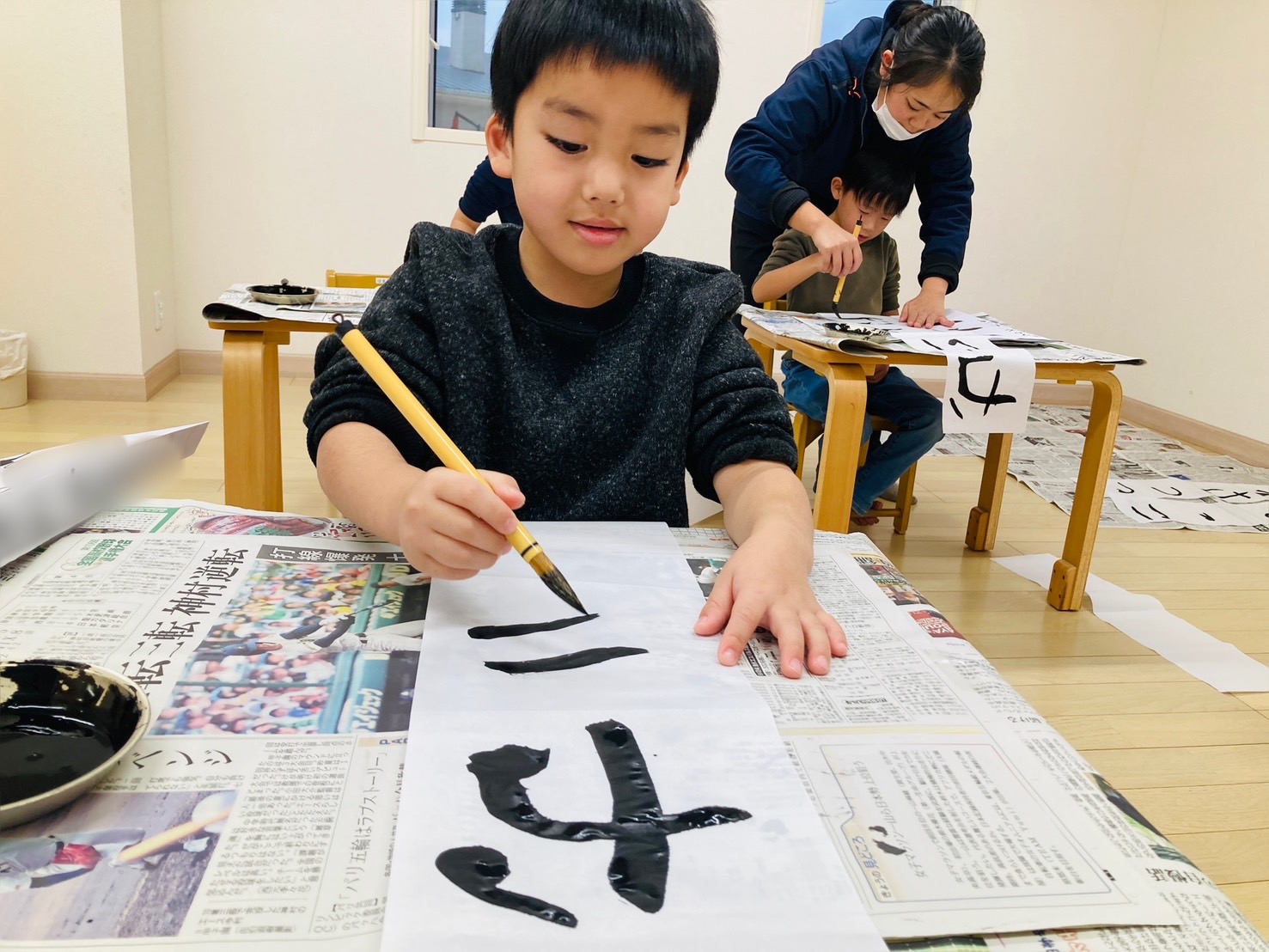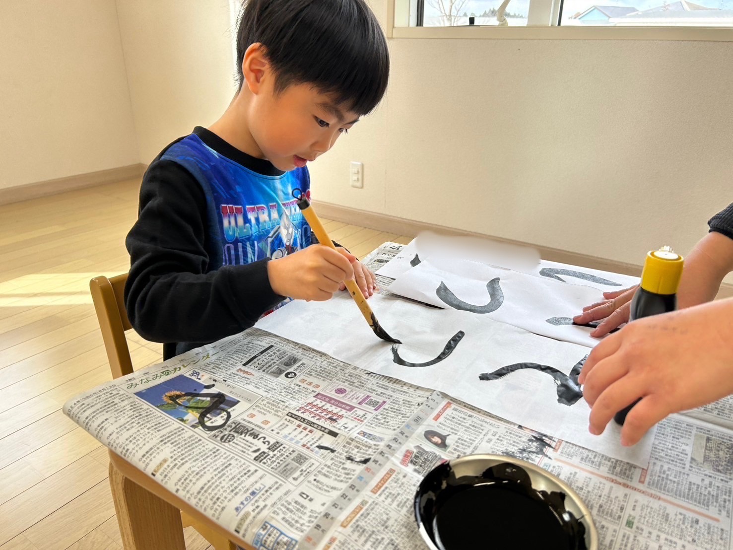 年長さんの子どもたちで、書き初めに挑戦しました! 「小学校で頑張りたいこと」をテーマに考え、「勉強も、運動も、宿題もある!」と頑張りたいことが沢山あり、小学校生活を楽しみにしている姿が見られました! お手本を見ながら、真剣に練習する姿が見られ、1文字1文字丁寧に書くことが出来ていました! 完成した書き初めを見て、「綺麗に書けた!」と大満足な様子な子どもたちでした!
