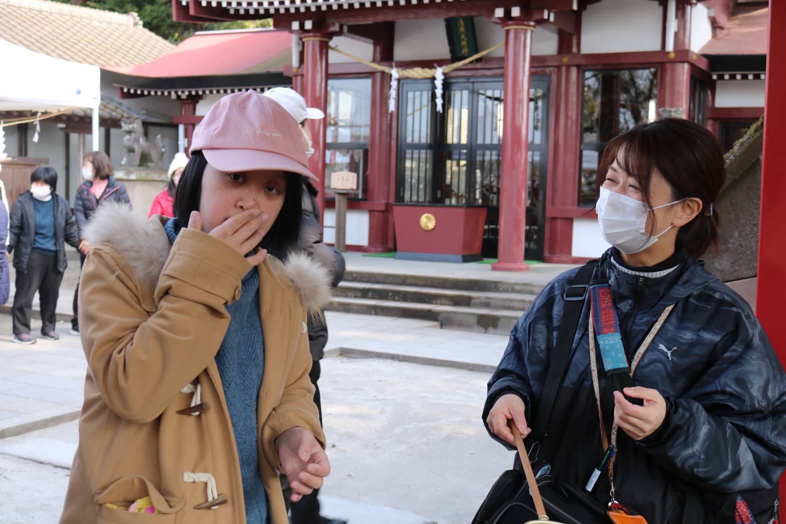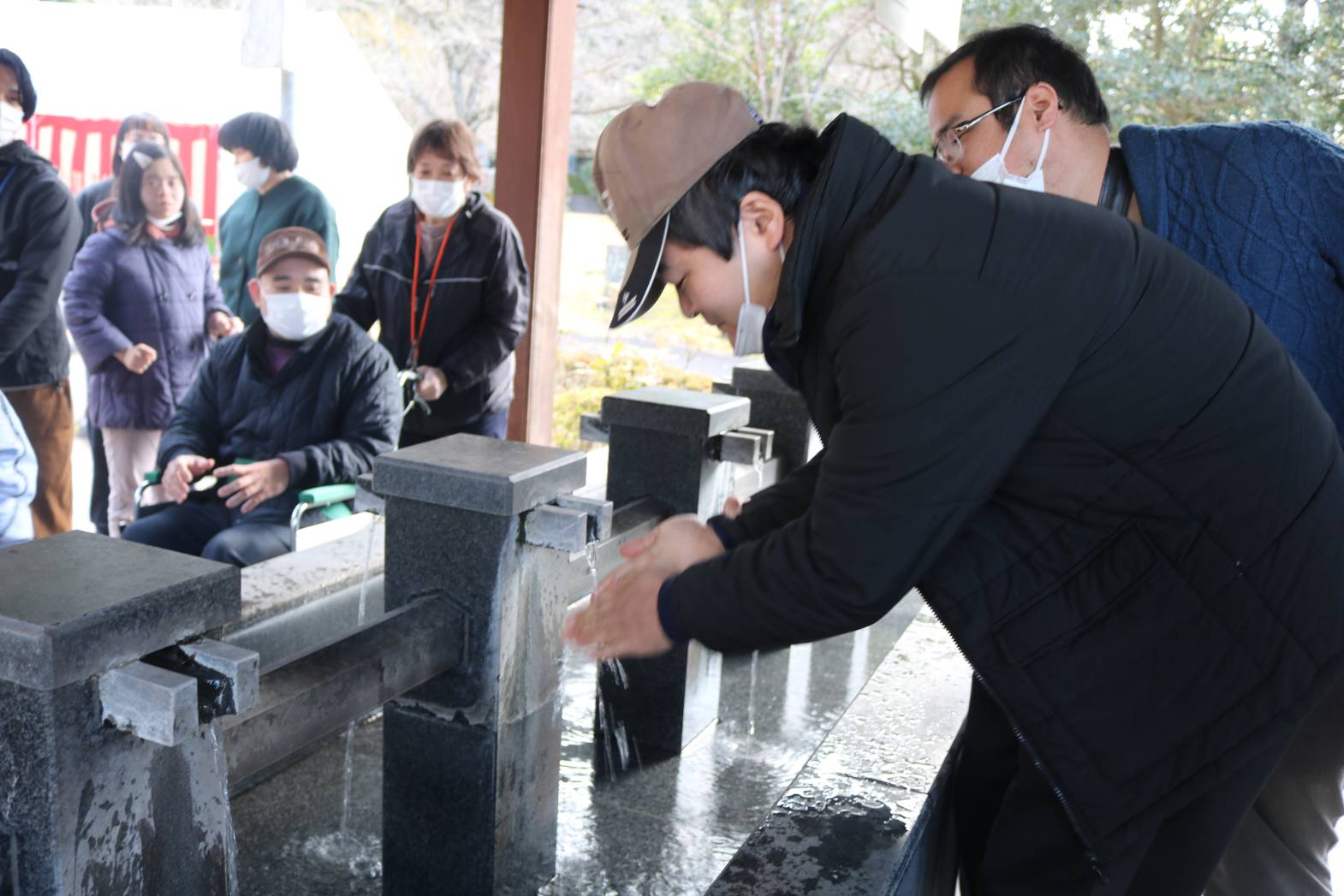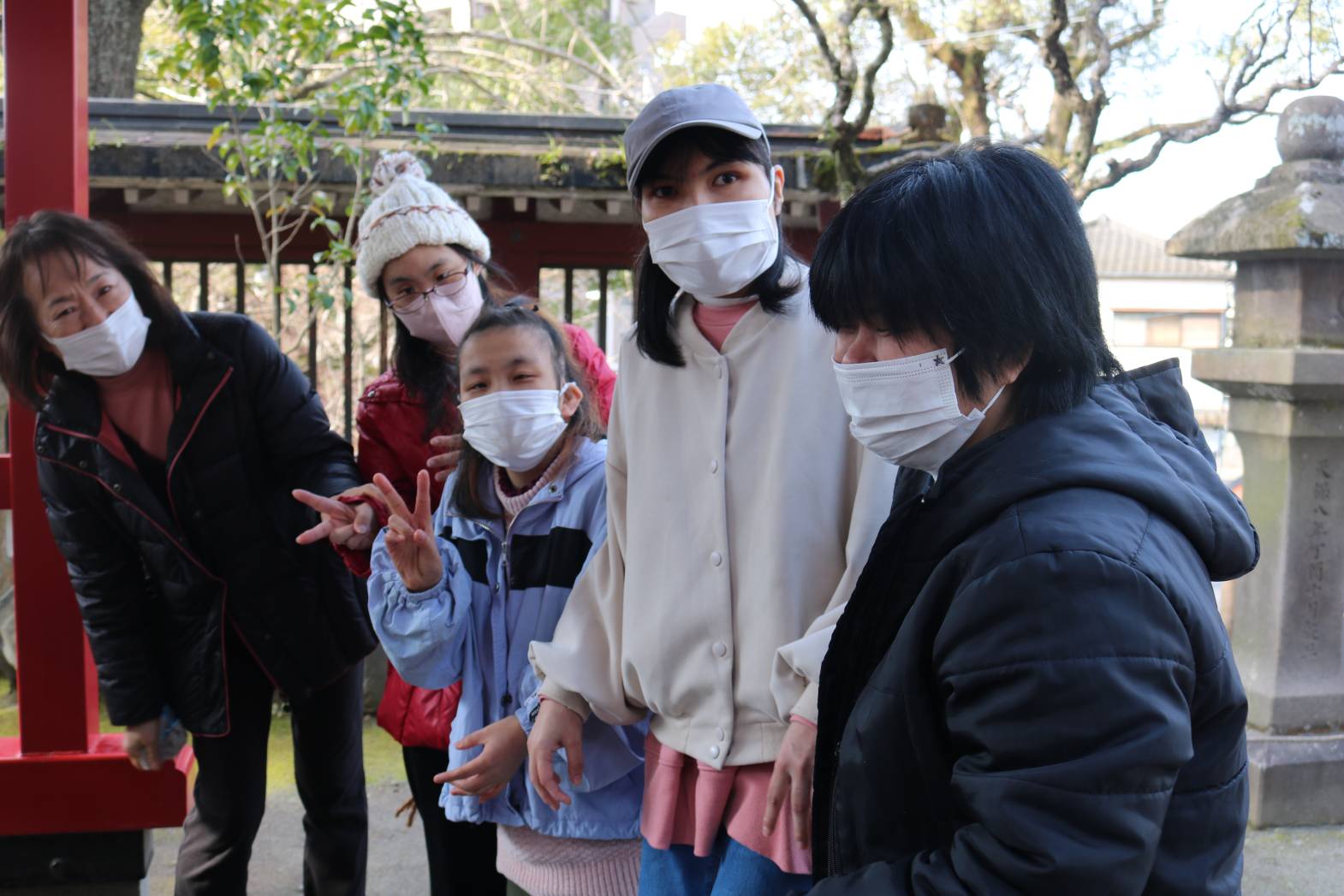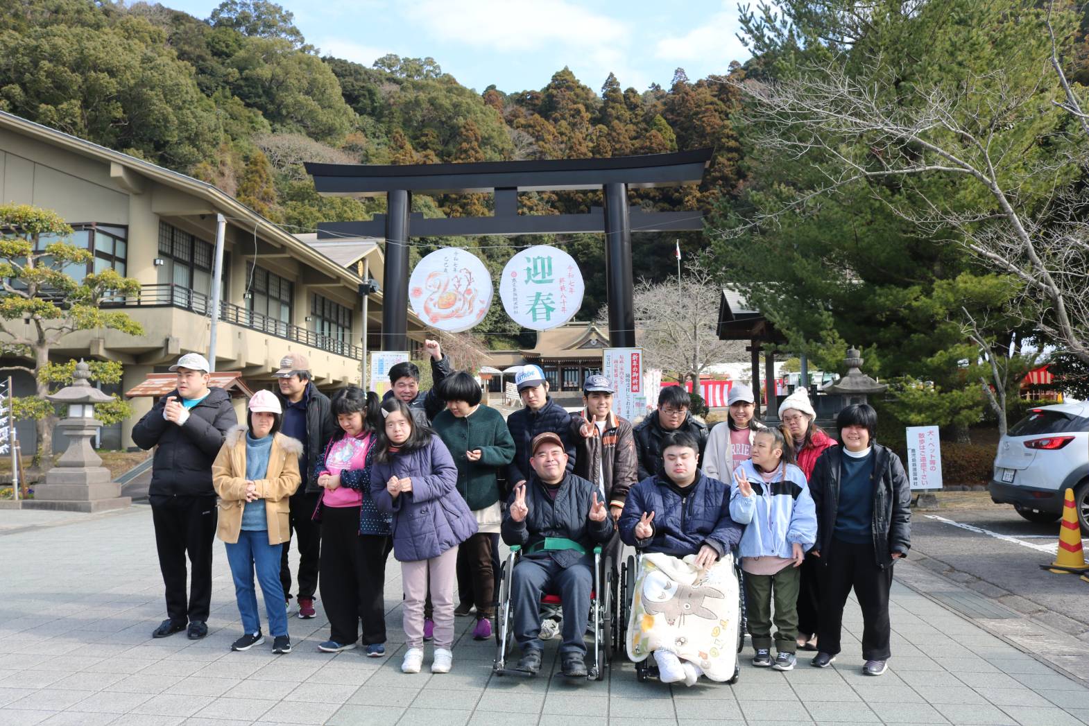 本日、「初詣」にいってきました。 護国神社と鹿児島神社へ参拝に行きました。 支援員と一緒に、二礼二拍手一礼をしながら、神様へ健康祈願をしました。 天候にも恵まれ、皆さん笑顔で楽しまれているご様子でした。 お散歩も兼ねて、神社間を歩いて移動 そして帰園後は、注文していたお弁当を皆さんで頂きました。 チキン南蛮や野菜のナムル、煮物などボリュームたっぷりのお弁当にみなさん 一段と表情が明るくなっていました。 外出活動と美味しいご飯の両方を 楽しんでもらえた一日になりました。