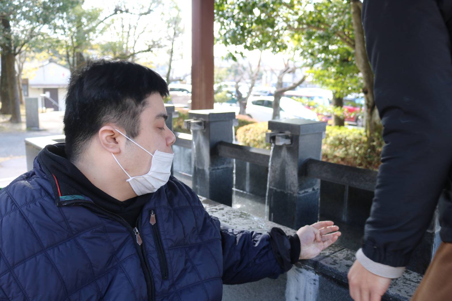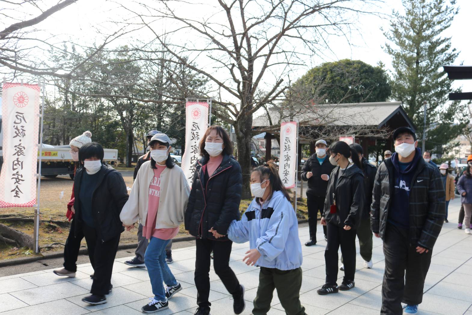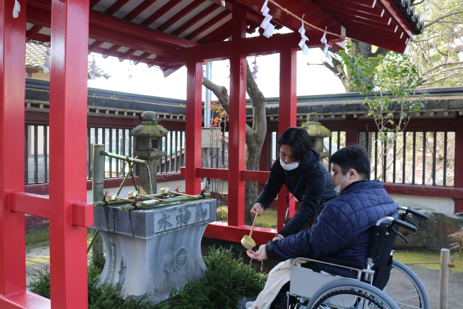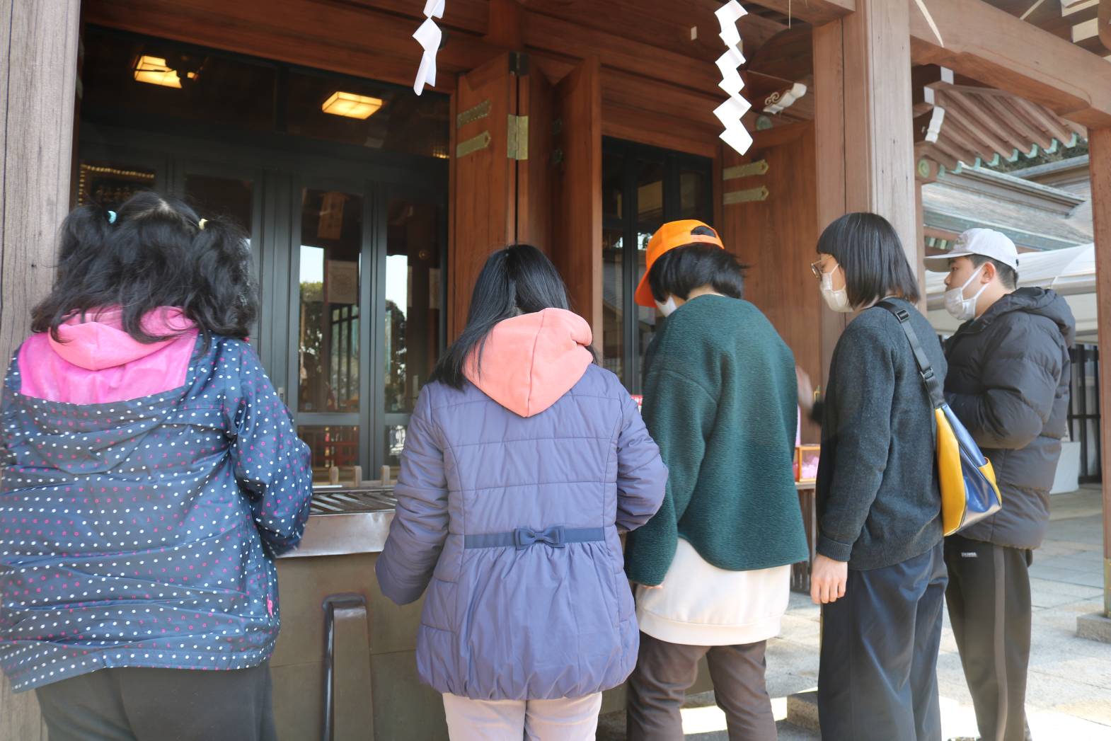 本日、「初詣」にいってきました。 護国神社と鹿児島神社へ参拝に行きました。 支援員と一緒に、二礼二拍手一礼をしながら、神様へ健康祈願をしました。 天候にも恵まれ、皆さん笑顔で楽しまれているご様子でした。 お散歩も兼ねて、神社間を歩いて移動 そして帰園後は、注文していたお弁当を皆さんで頂きました。 チキン南蛮や野菜のナムル、煮物などボリュームたっぷりのお弁当にみなさん 一段と表情が明るくなっていました。 外出活動と美味しいご飯の両方を 楽しんでもらえた一日になりました。