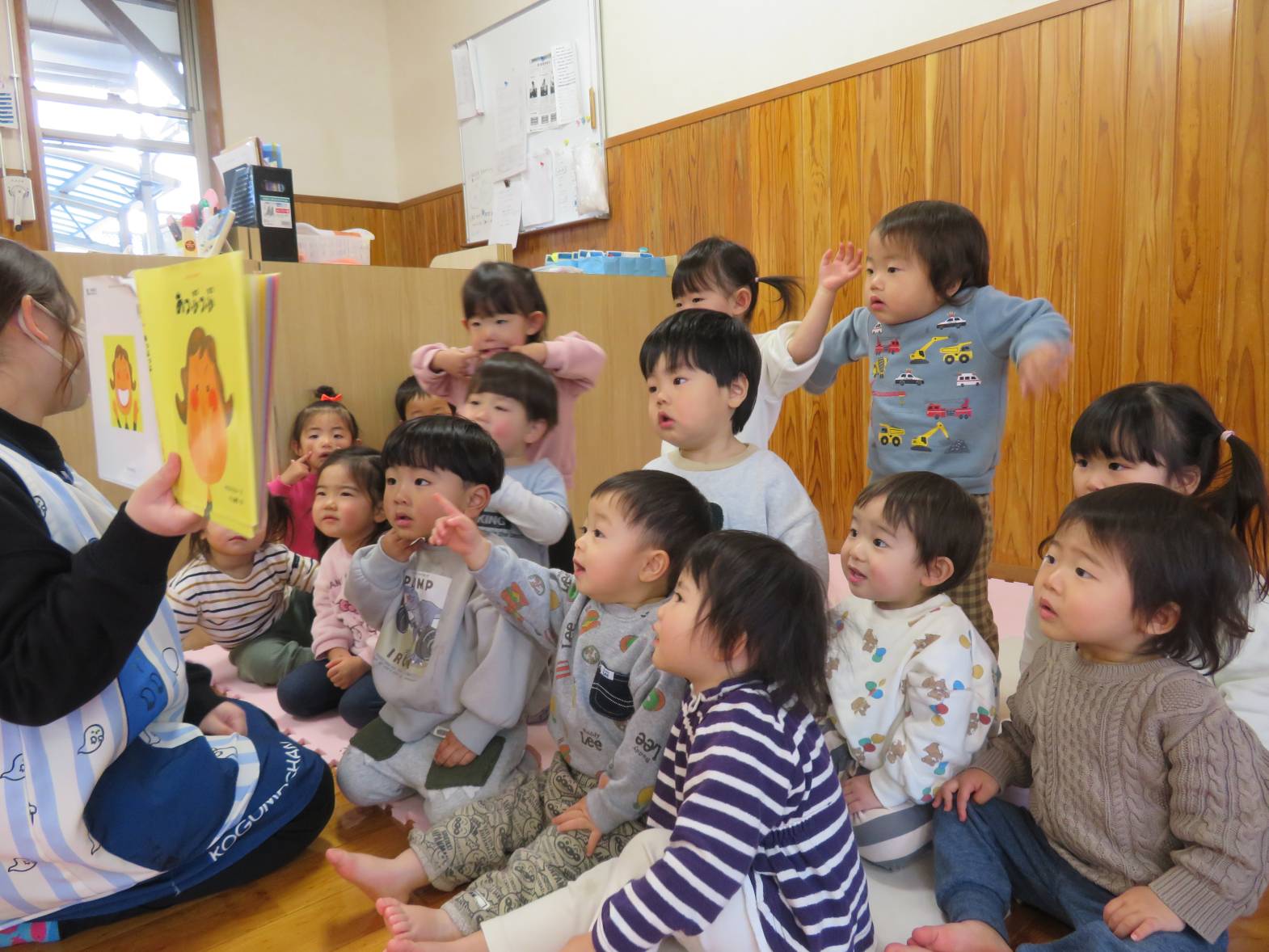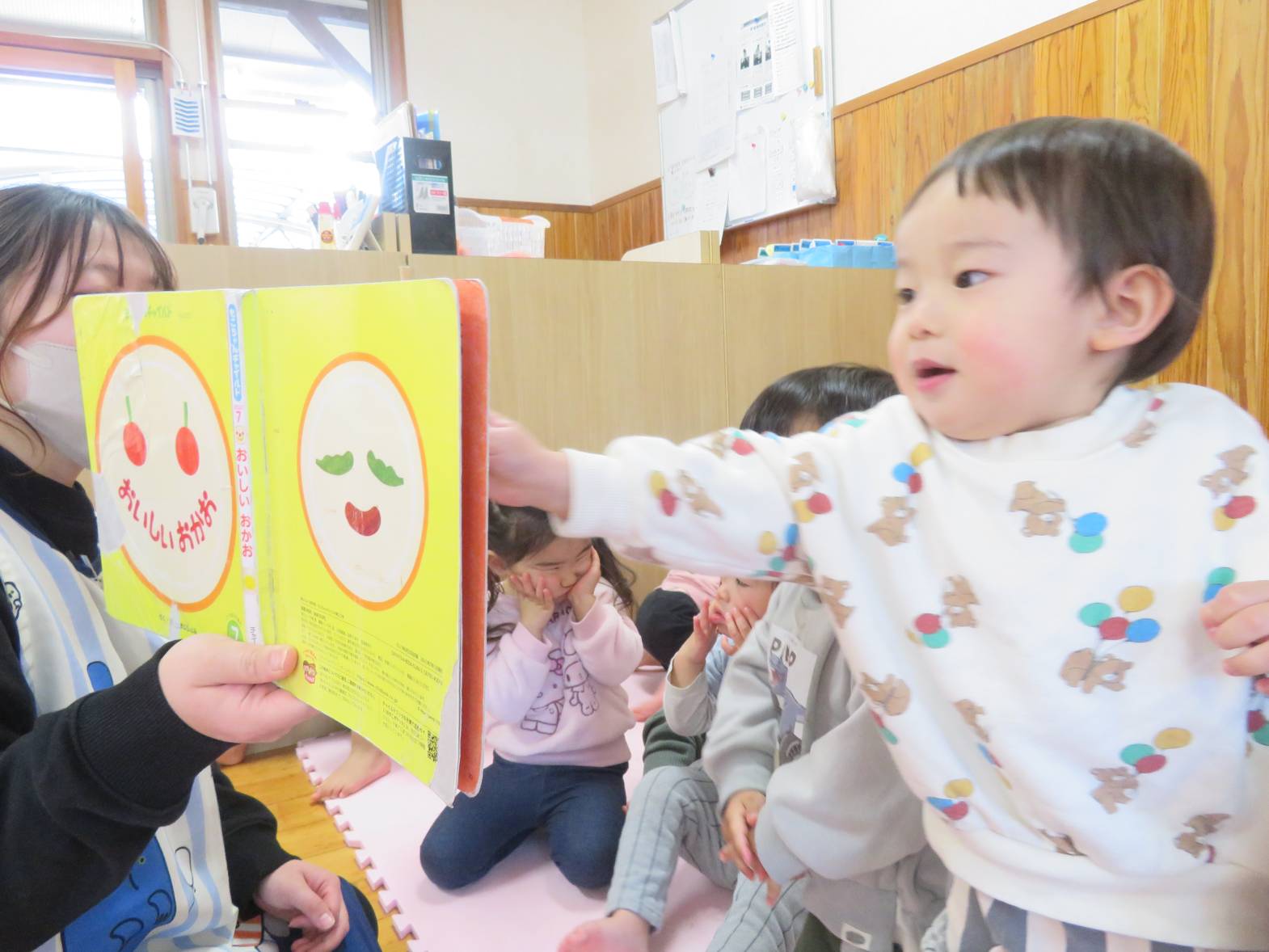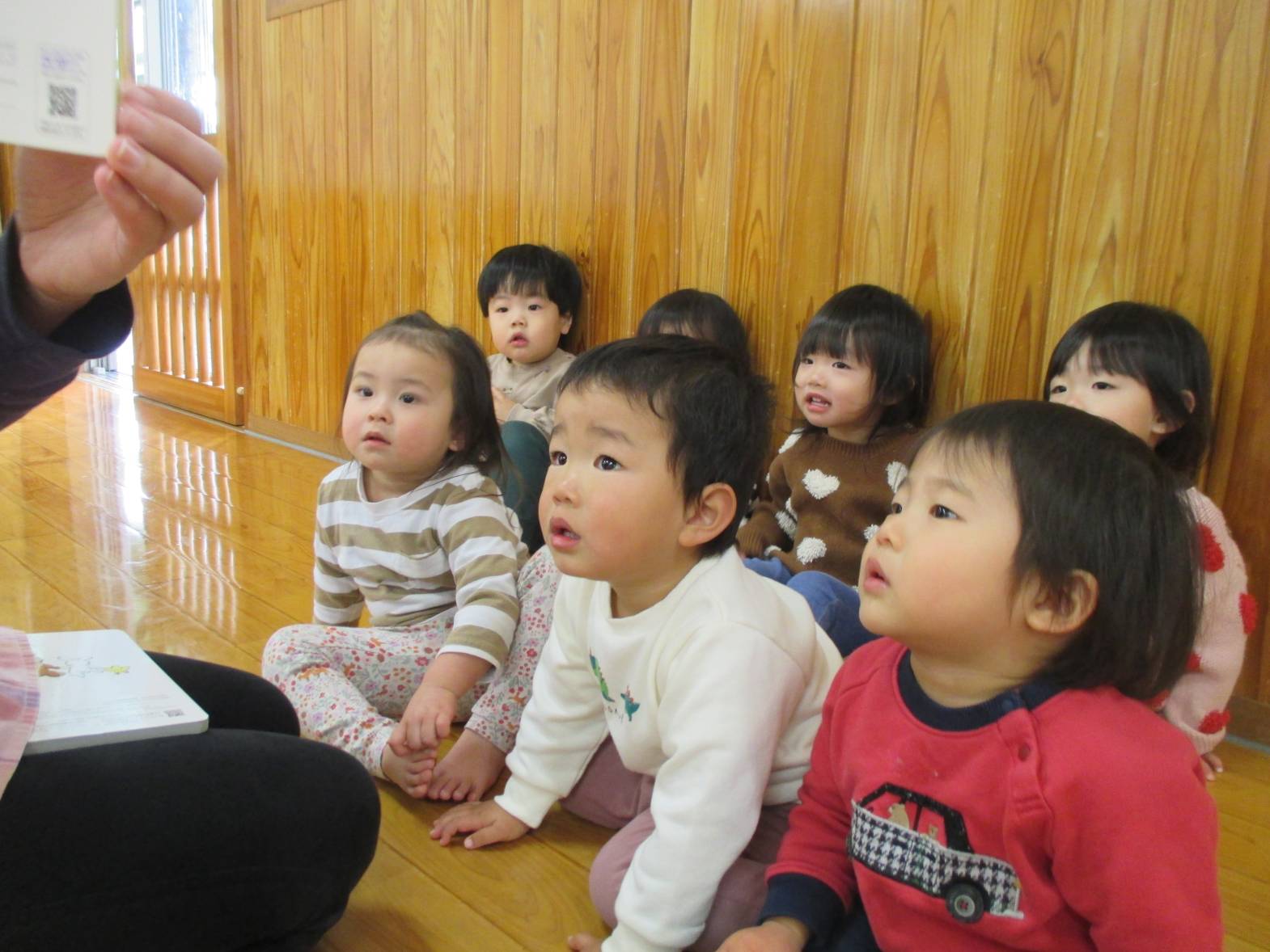 絵本の時間が始まると“今日は何かな~?”と嬉しそうに集まってくるこあら組さん。 「おはなしのうた」も上手に覚えていて、いろんな指遊びも楽しんでいます。 真剣にじーっと見つめたり、指差しをしたり、思わず笑ってしまったりと いろいろな表情を見せてくれる子どもたち。 「あっぷっぷ」という絵本を見た時は、どんな顔が出てくるか興味津々! 顔を真似したり「あはは~!」と友だちと笑ったりと、とっても賑やかでした。 絵本を通して、言葉のやりとりも楽しんでいるこあら組さんです!