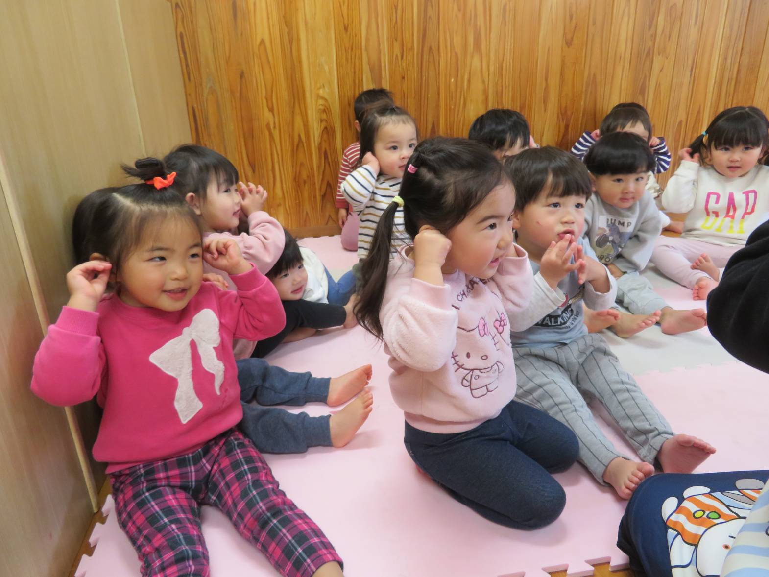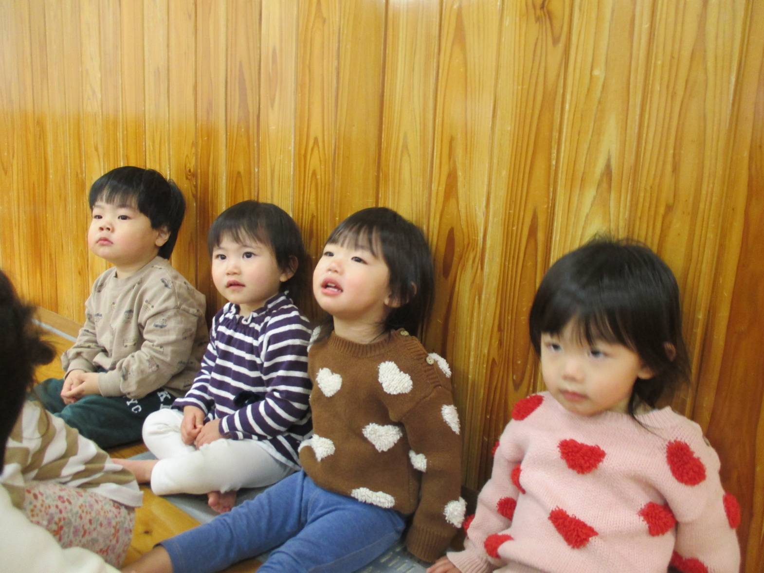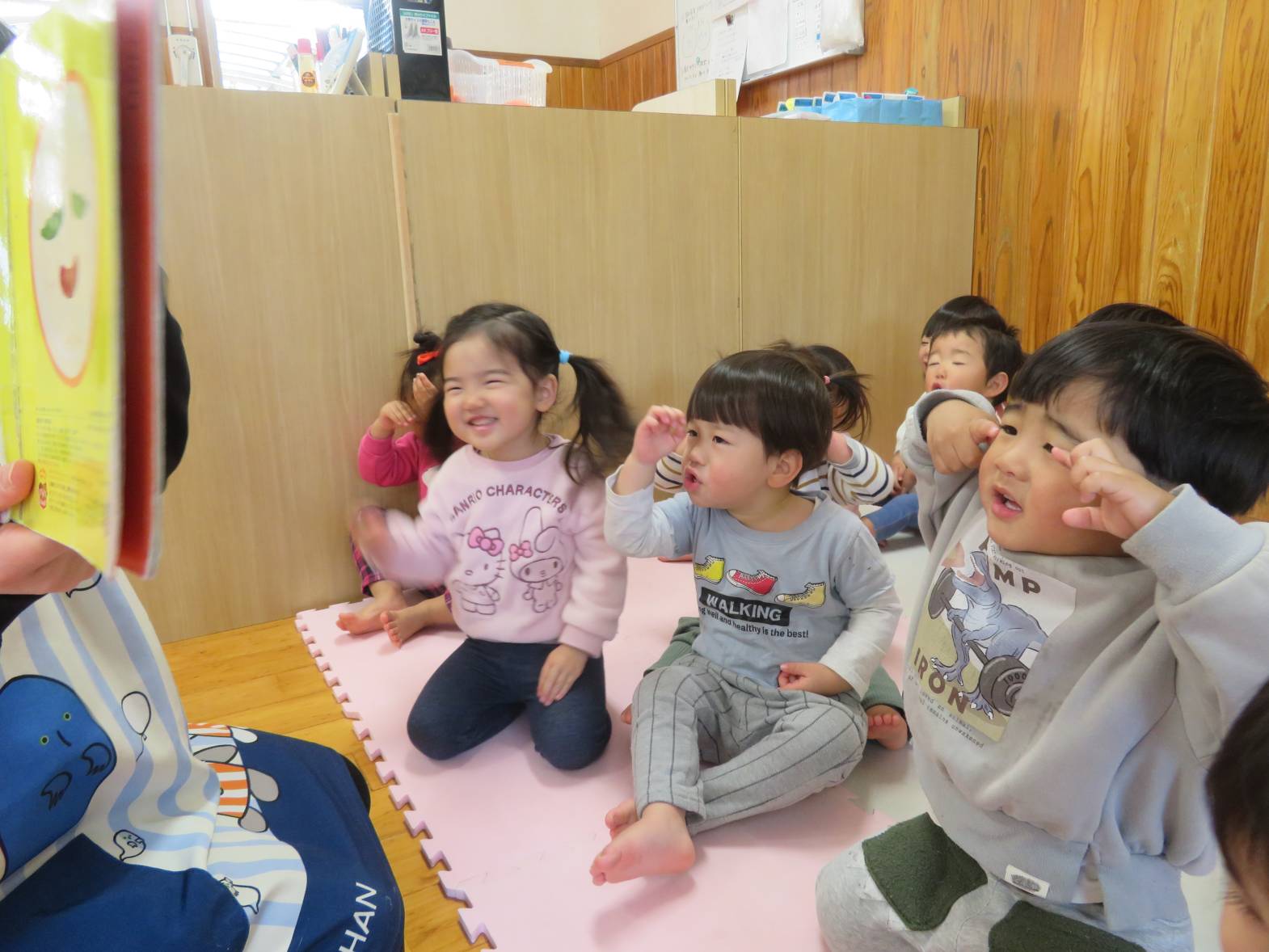 絵本の時間が始まると“今日は何かな~?”と嬉しそうに集まってくるこあら組さん。 「おはなしのうた」も上手に覚えていて、いろんな指遊びも楽しんでいます。 真剣にじーっと見つめたり、指差しをしたり、思わず笑ってしまったりと いろいろな表情を見せてくれる子どもたち。 「あっぷっぷ」という絵本を見た時は、どんな顔が出てくるか興味津々! 顔を真似したり「あはは~!」と友だちと笑ったりと、とっても賑やかでした。 絵本を通して、言葉のやりとりも楽しんでいるこあら組さんです!