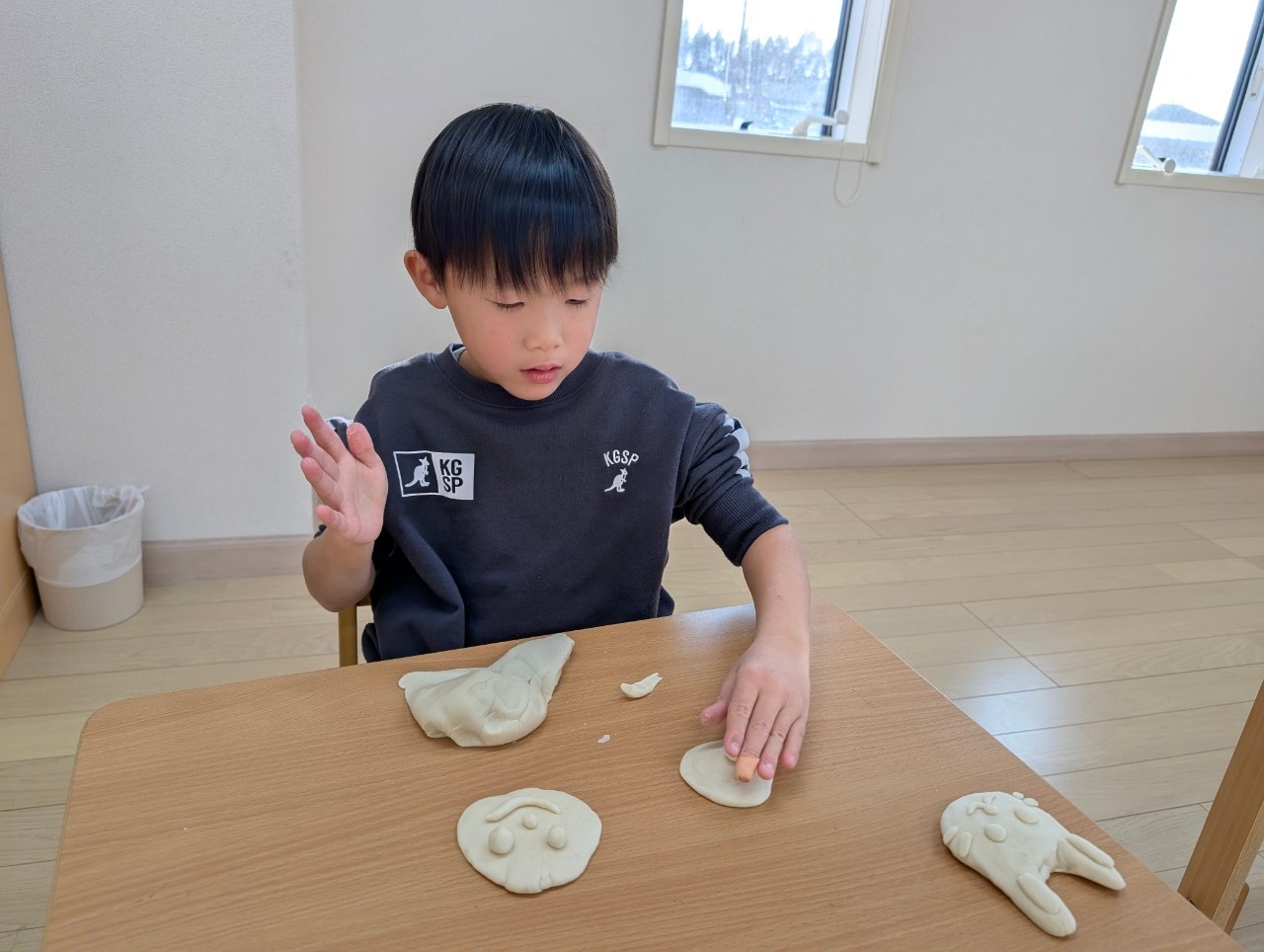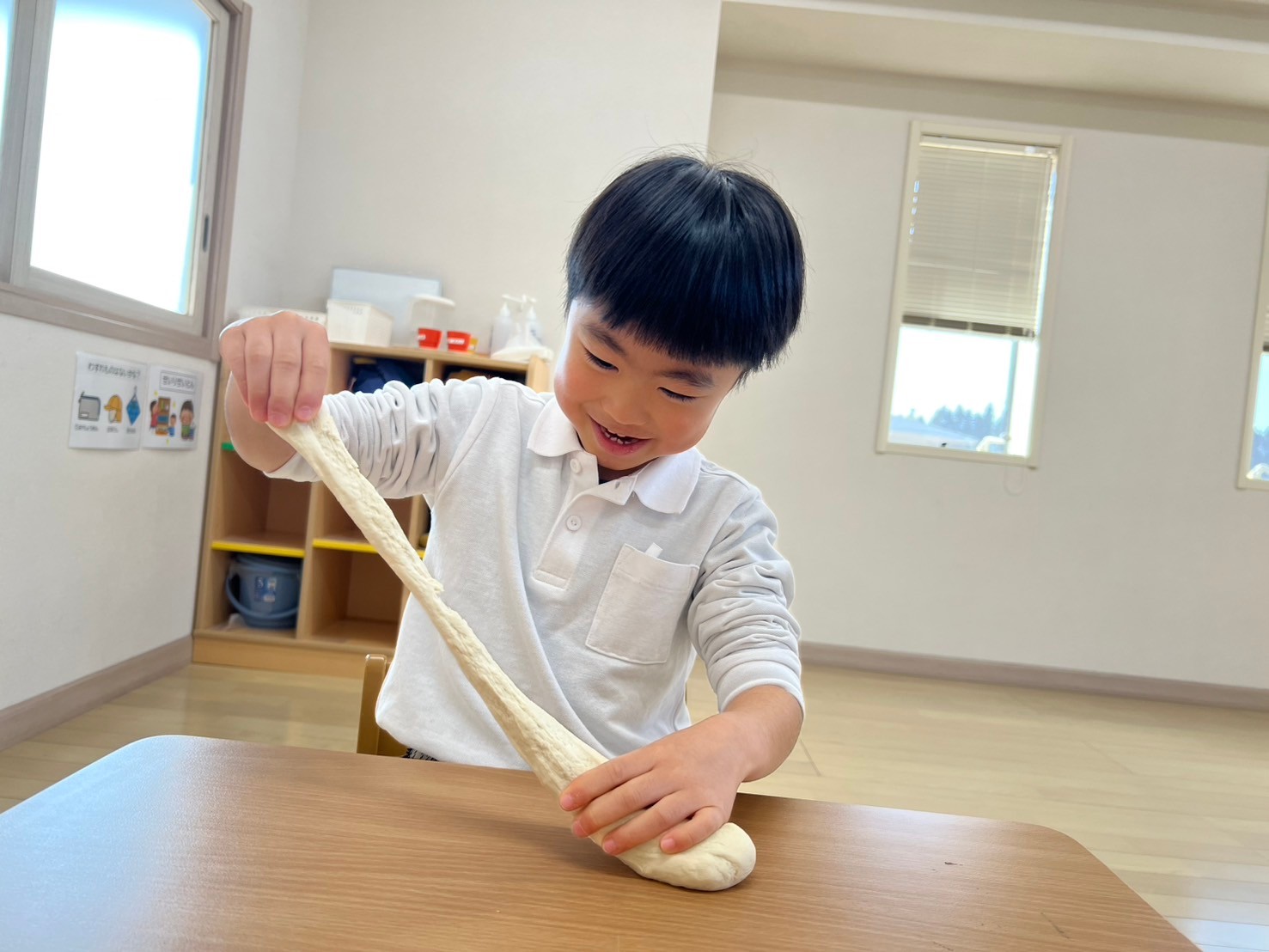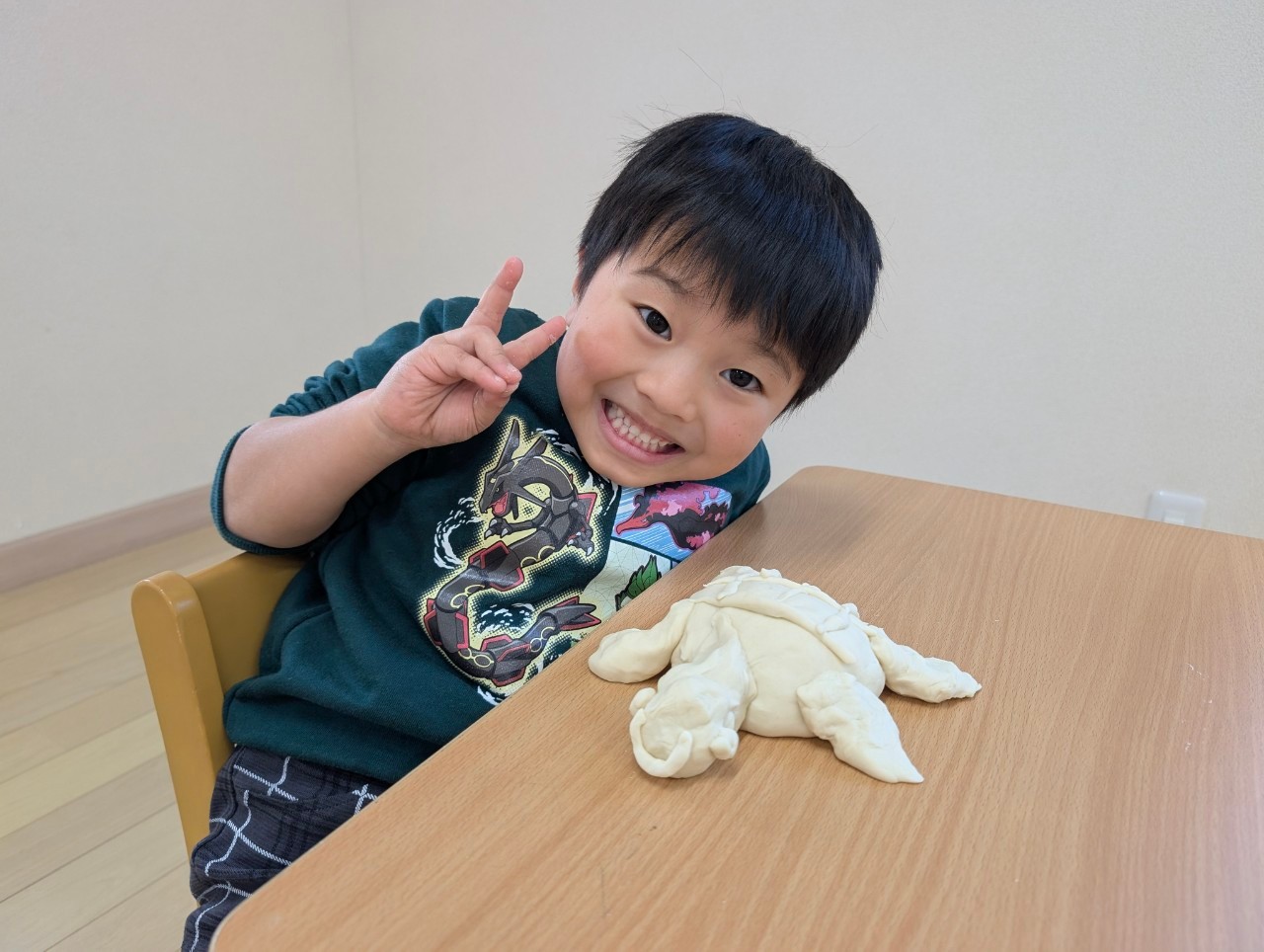 粘土をこねたり、伸ばしたり、「先生、パンみたいでしょ~!」と楽しそうな子どもたち☆