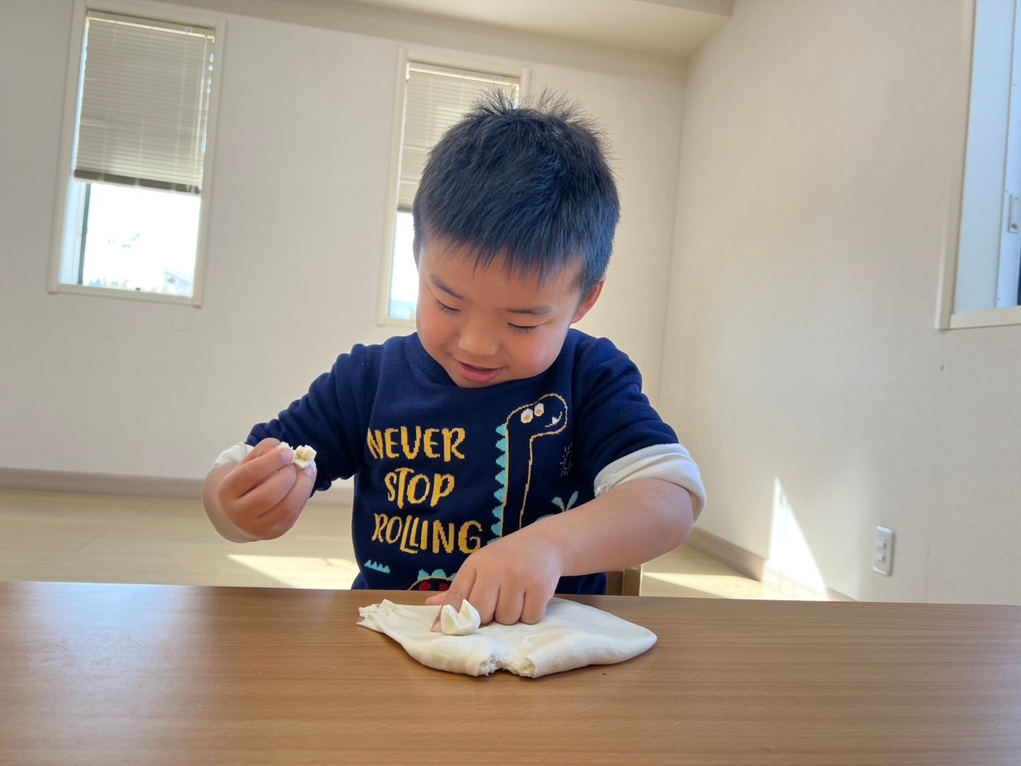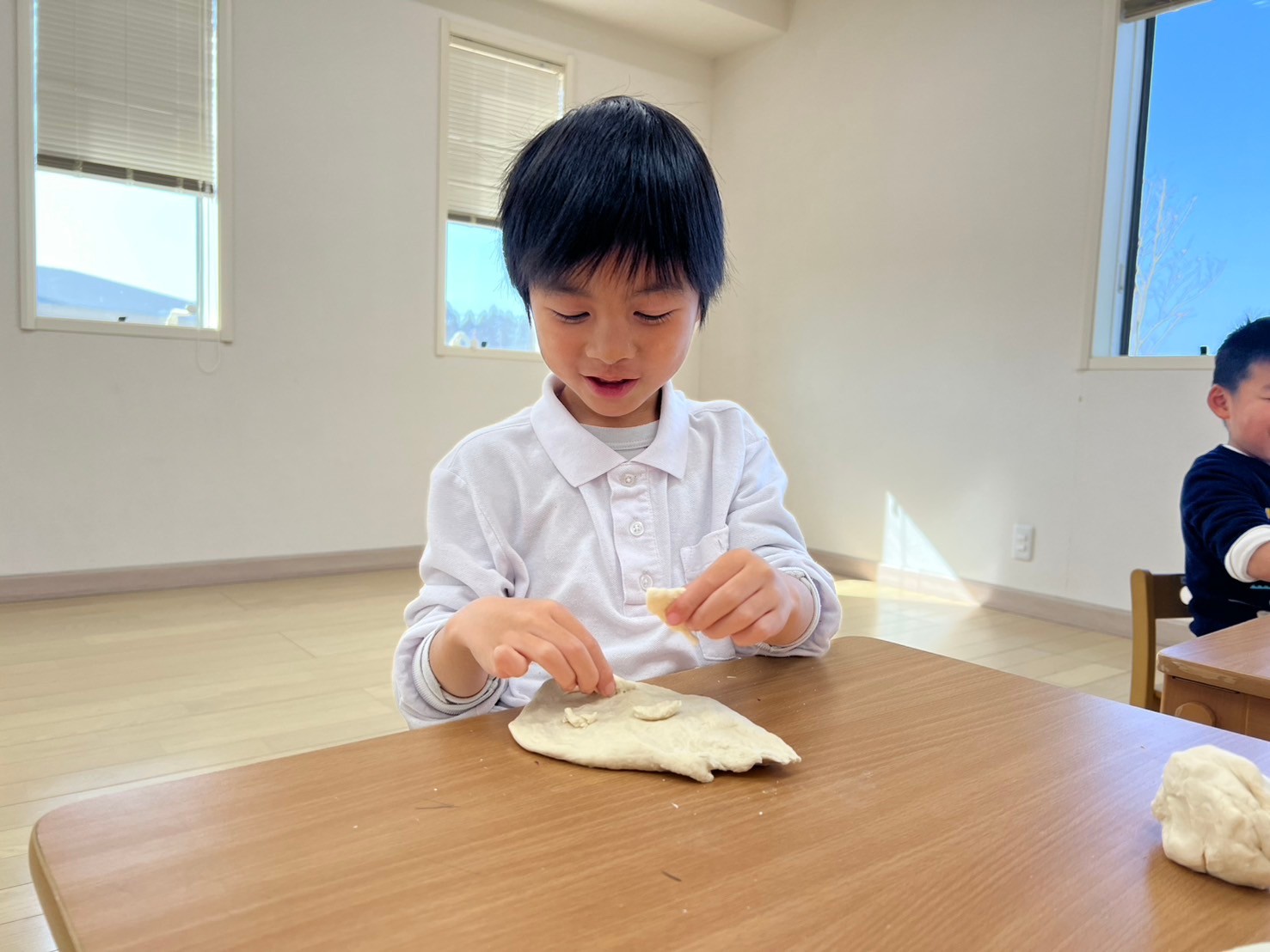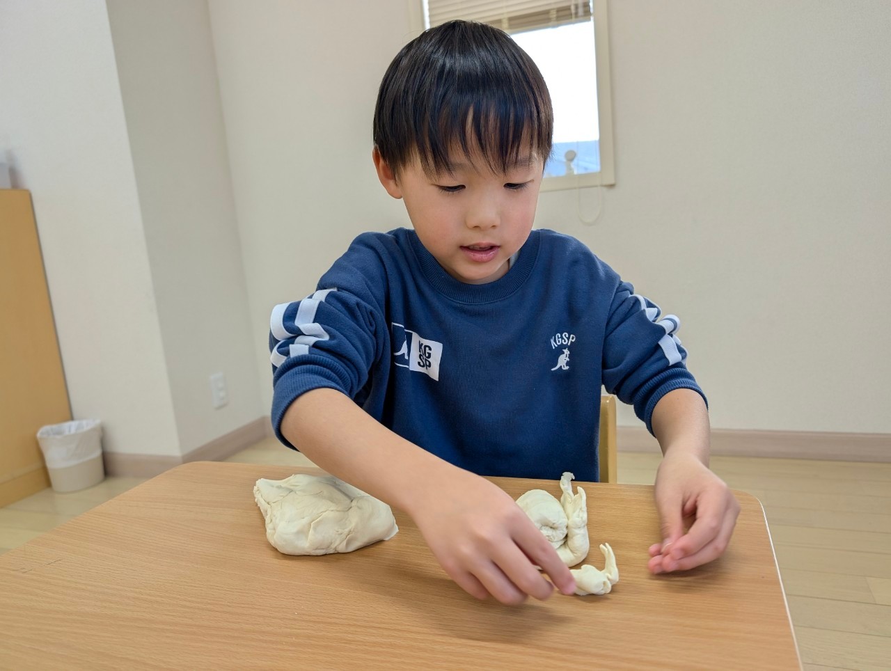 粘土をこねたり、伸ばしたり、「先生、パンみたいでしょ~!」と楽しそうな子どもたち☆