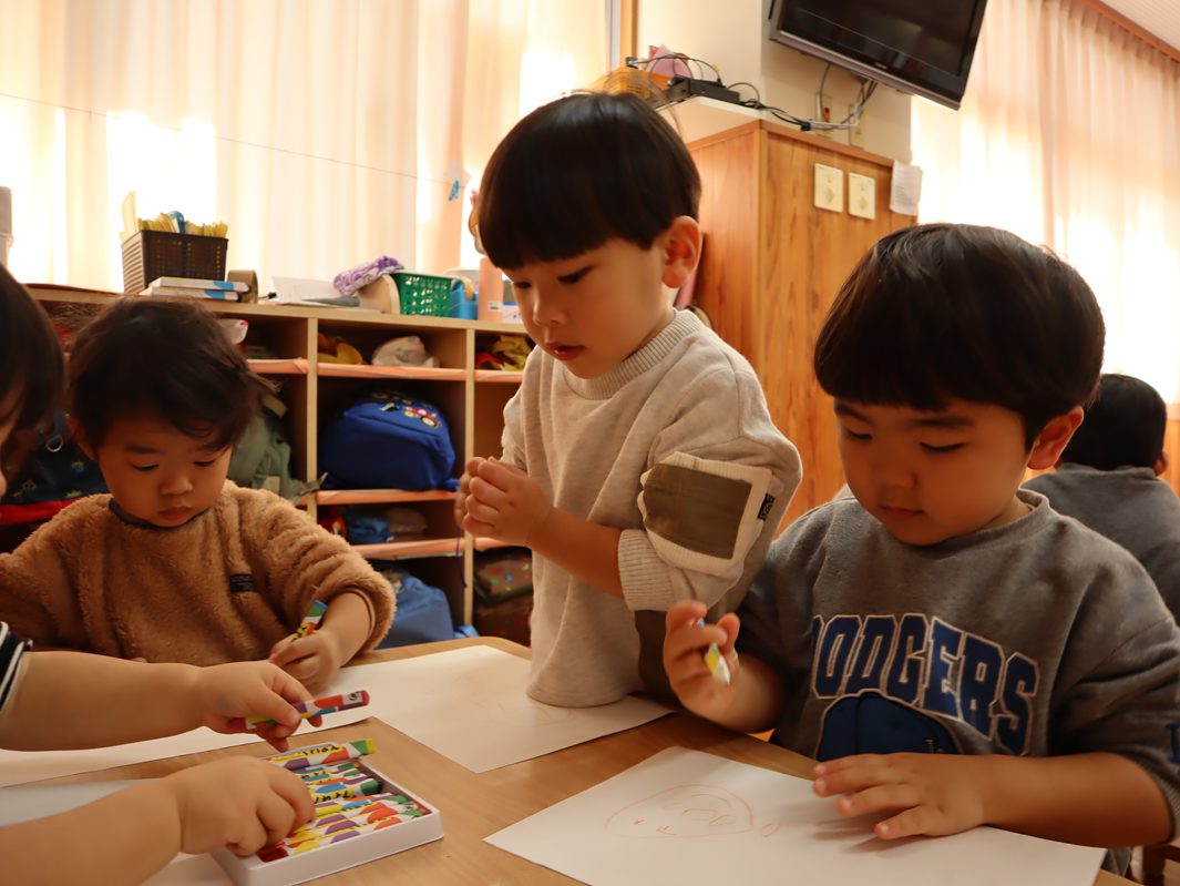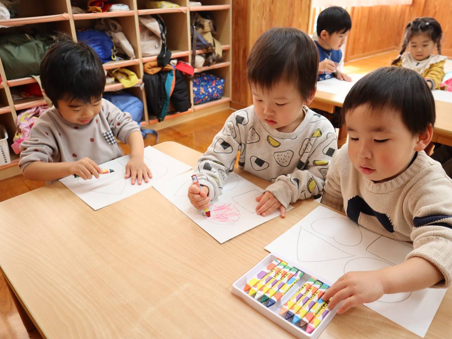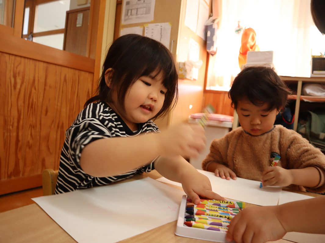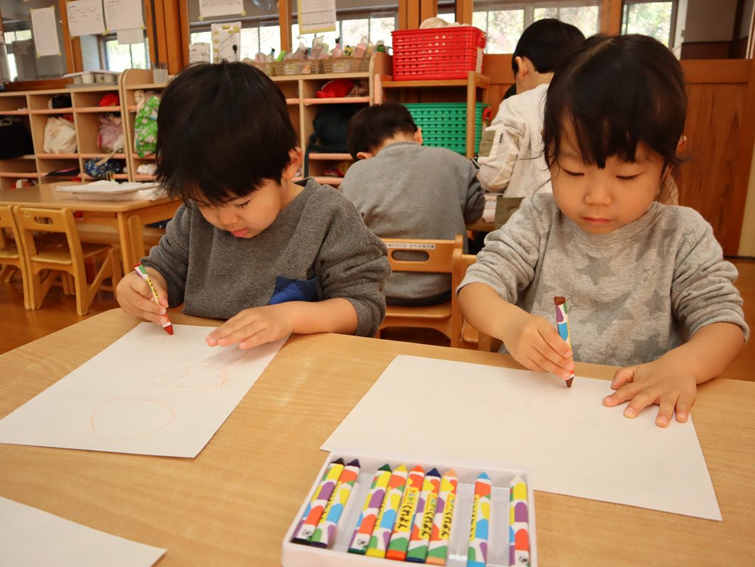絵描き活動が大好きな子どもたち。 保育者が描いたものをよく見て、真似て描きます。 「赤で描いてるよ。」「上手にできてる?」と会話を弾ませながら楽しむ姿が見られました。 ご家庭に絵を持って帰ってきた際はたくさん褒めてあげてください! 徐々に机に座って行う活動にも慣れてきたぱんだ組さん。 今後も集中して遊ぶことができるよう、様々な工夫を行っていこうと思います。