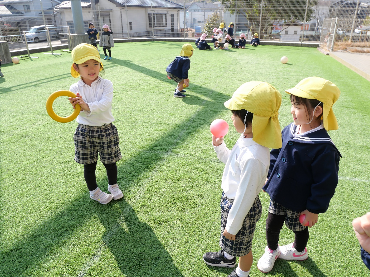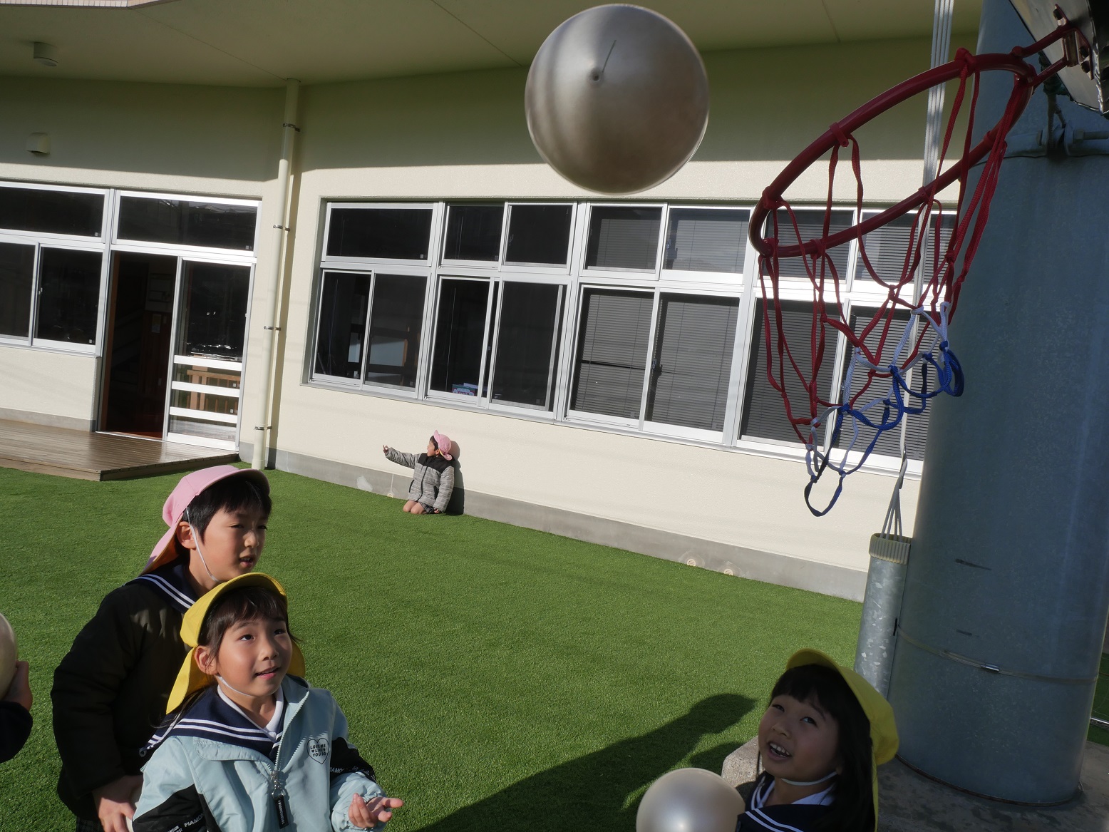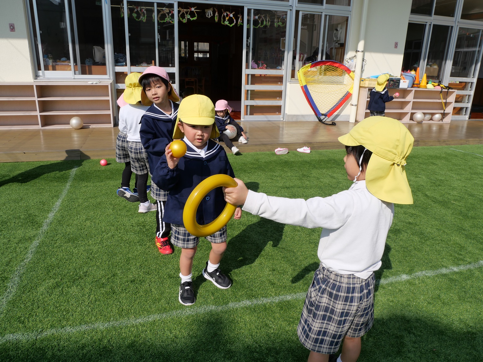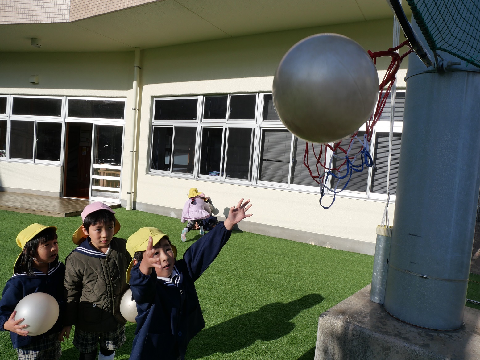 他にも友だちが持ってくれる輪っかに、小さなボールを入れようとしていました。