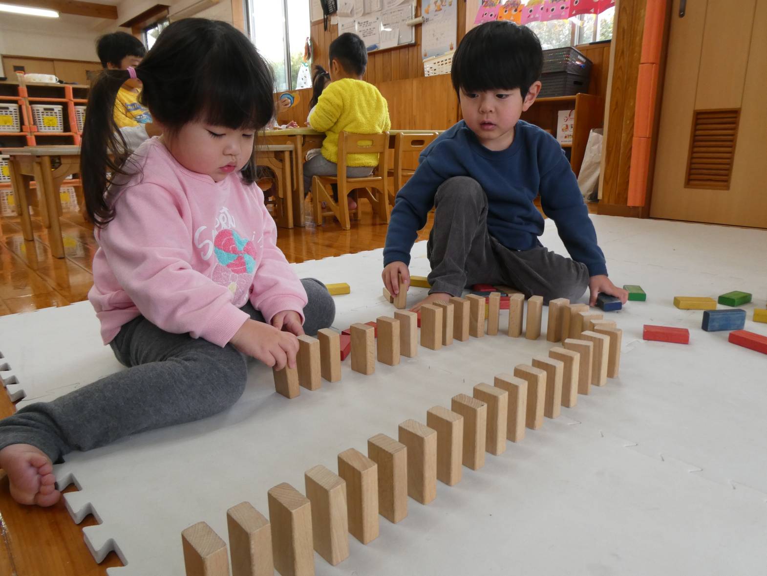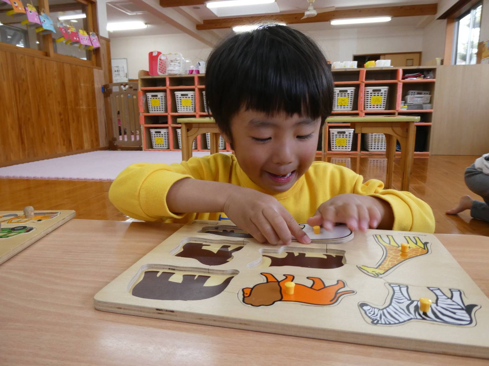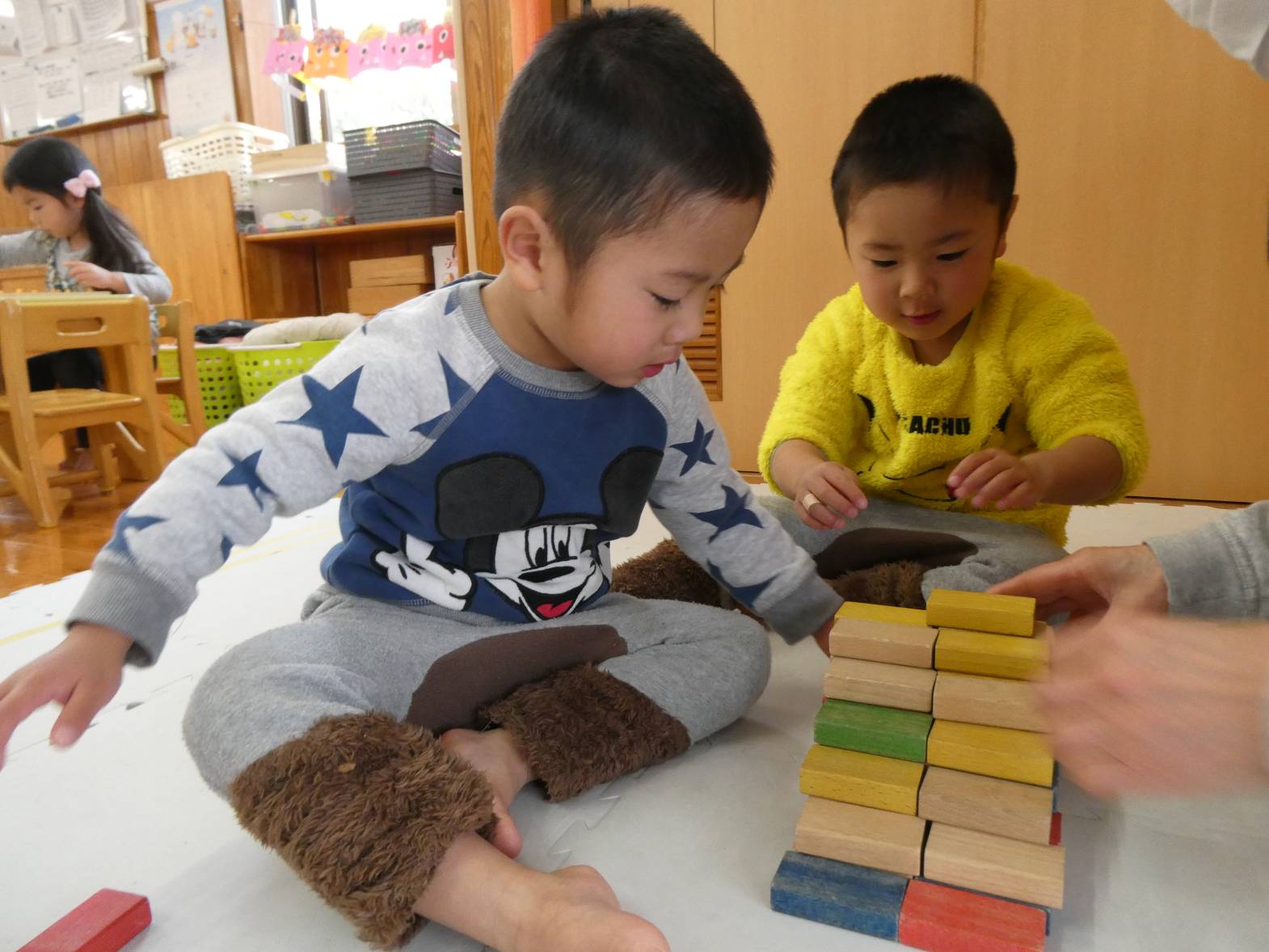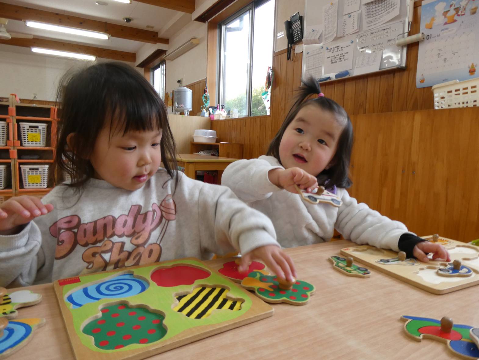 今週は、暖かく過ごしやすい日が続いています。 室内遊びでは、机上遊びも取り入れており、パズルで遊ぶ子どもたち。 「いちごはどこかな?」、「きりんと同じ形はここだ!」と、集中して取り組みます。 また積み木遊びでは、ドミノや階段を作ることにハマっているぱんだ組さん! 「倒さないようにね!」、「はい、積み木持ってきたよ。」と、互いに声を掛け合う様子も見られています。 様々な活動を行いながら、友だちと遊ぶ楽しさを味わえるようにしていきたいと思います♪