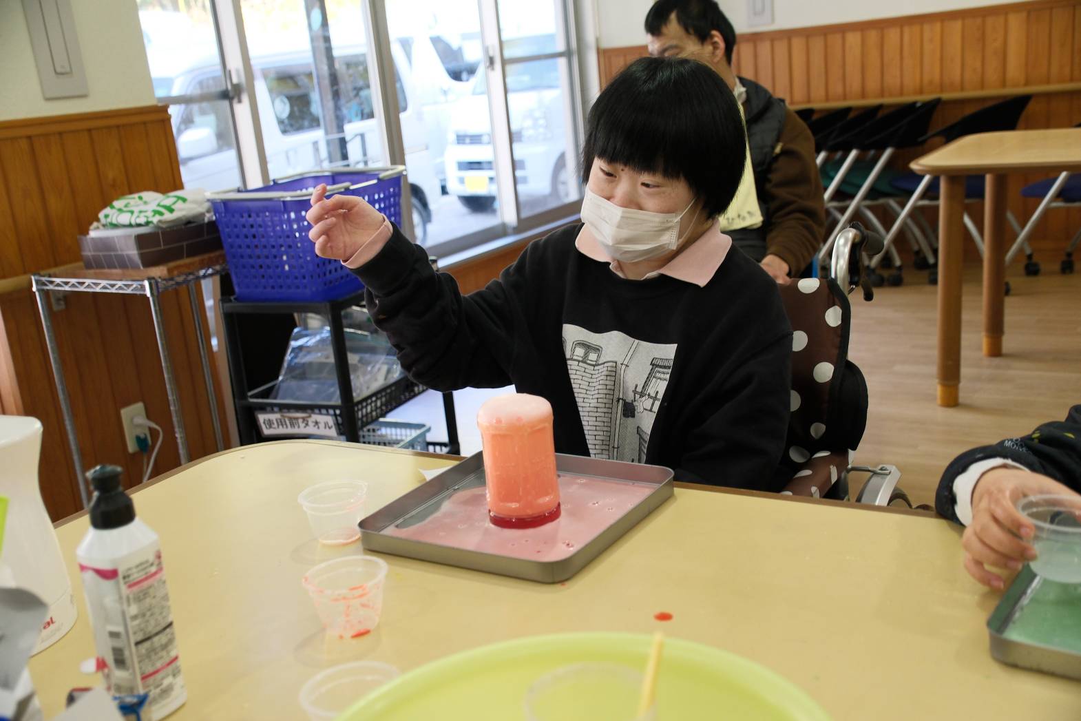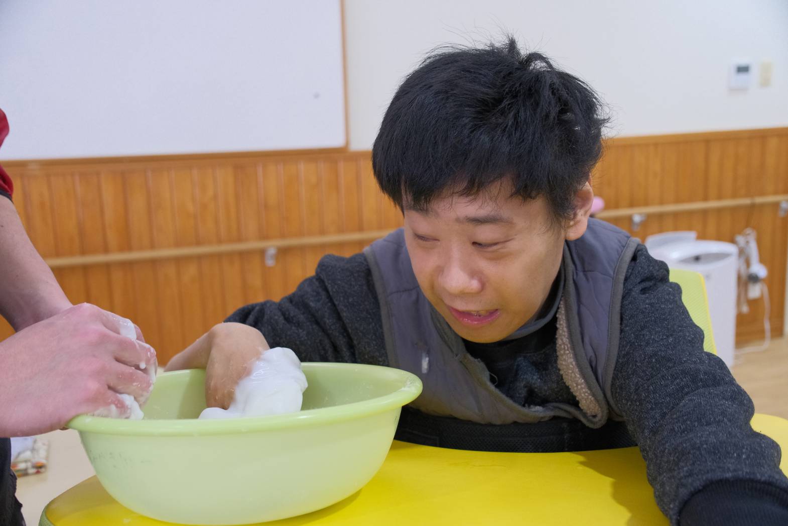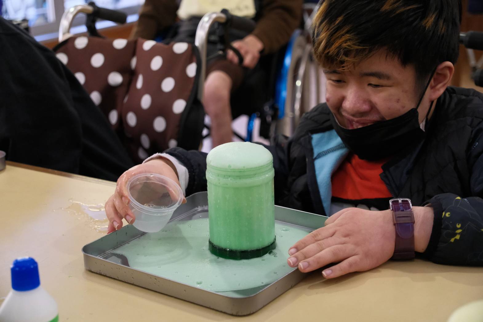 急に泡が噴出してくるとびっくりしますが、視覚的にもとっても楽しい活動ができました。