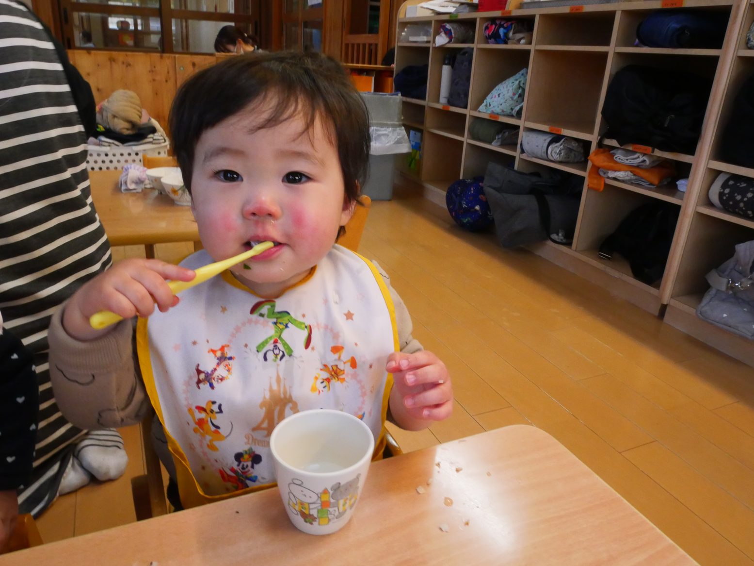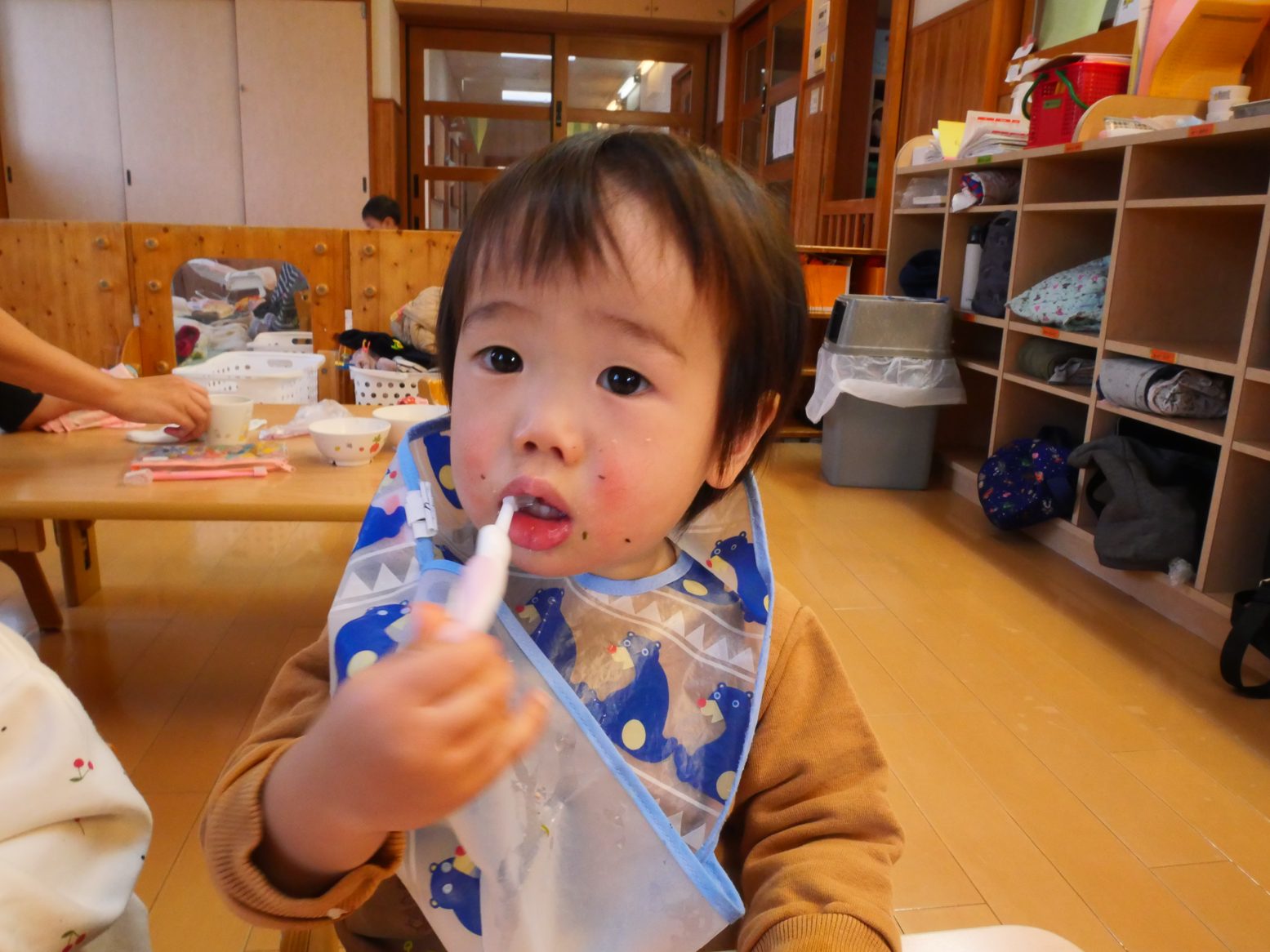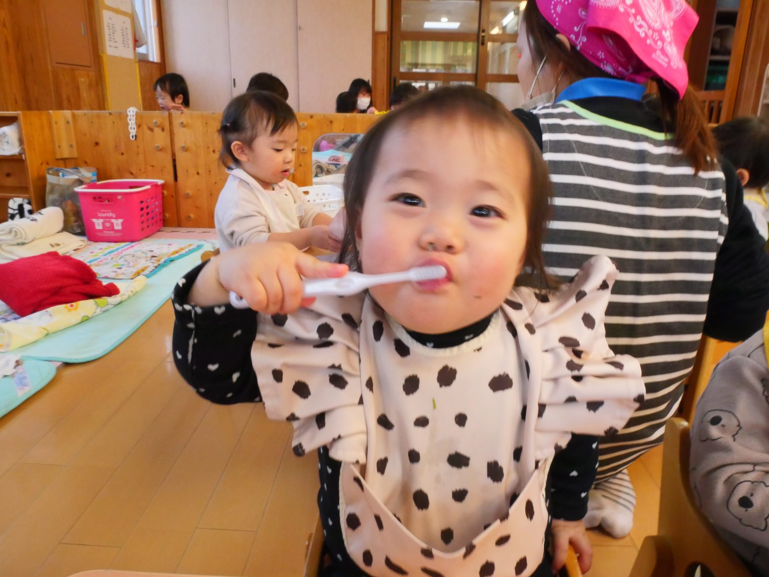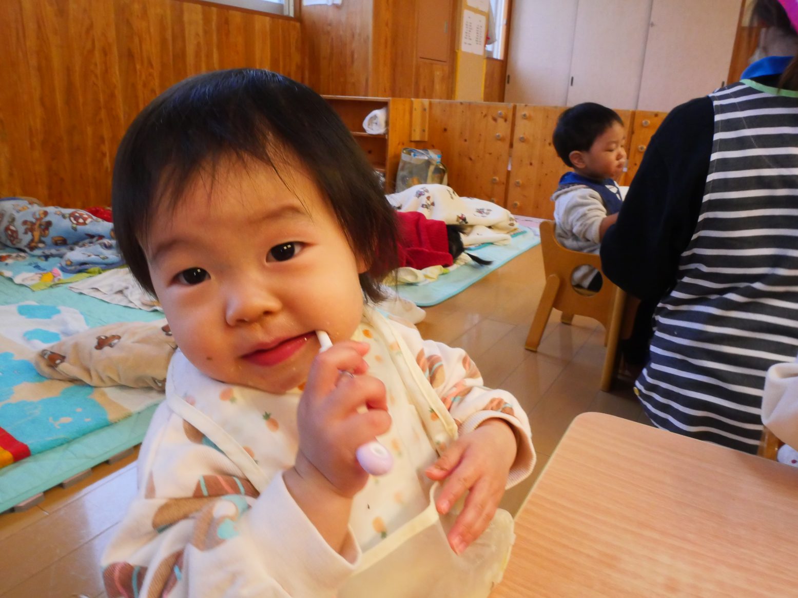 給食を食べ終えると、「歯ブラシちょうだい!」とアピールをしてくれるひよこ組さん。 ご飯を食べたら歯磨きをする習慣が定着してきました! 歯ブラシを渡すと、にこにこ笑顔で歯ブラシを左右に動かす子どもたち。 自分で歯磨きができると、持っている歯ブラシを「はい、どーぞ」して仕上げ磨きもさせてくれます。 毎日の歯磨きで、虫歯予防に努めていきたいと思います!