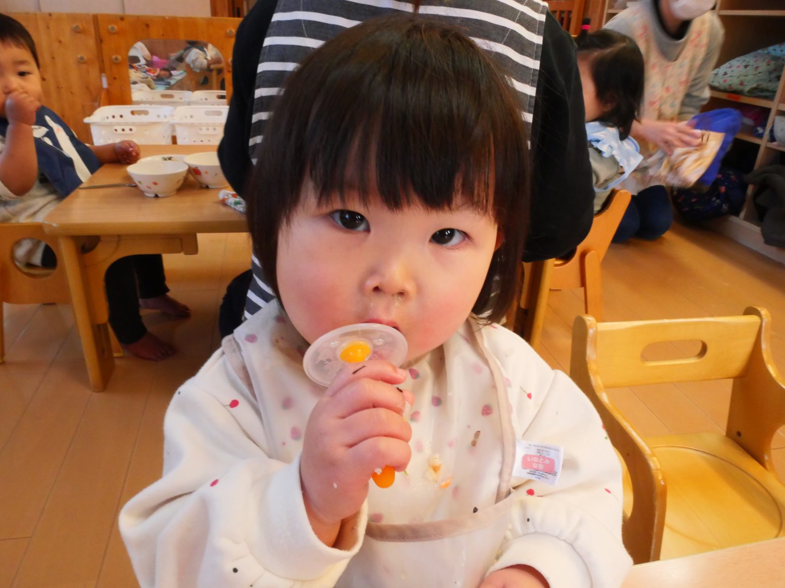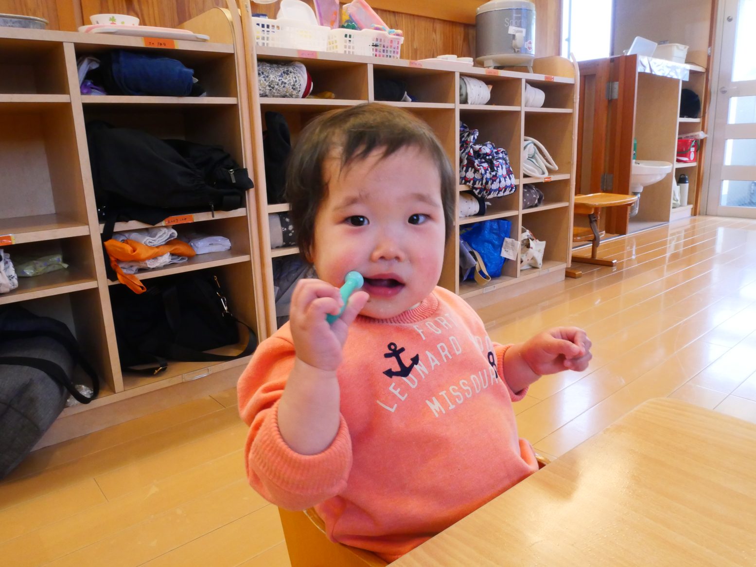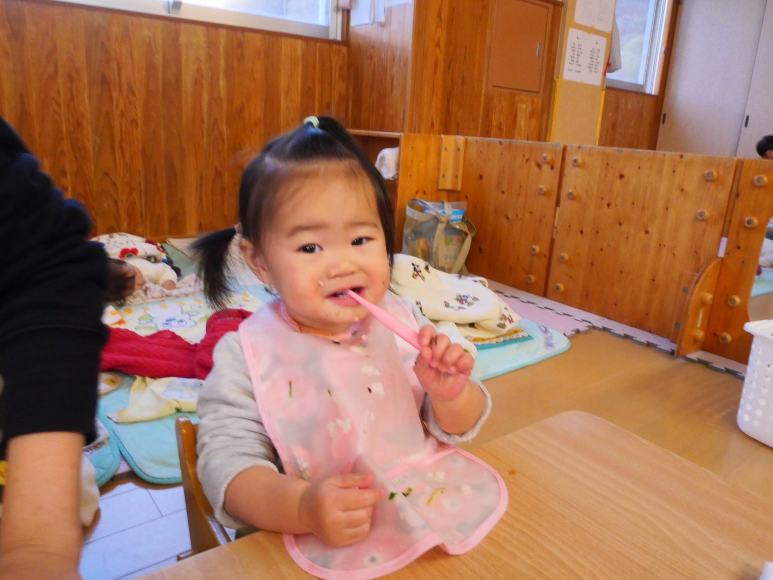 給食を食べ終えると、「歯ブラシちょうだい!」とアピールをしてくれるひよこ組さん。 ご飯を食べたら歯磨きをする習慣が定着してきました! 歯ブラシを渡すと、にこにこ笑顔で歯ブラシを左右に動かす子どもたち。 自分で歯磨きができると、持っている歯ブラシを「はい、どーぞ」して仕上げ磨きもさせてくれます。 毎日の歯磨きで、虫歯予防に努めていきたいと思います!