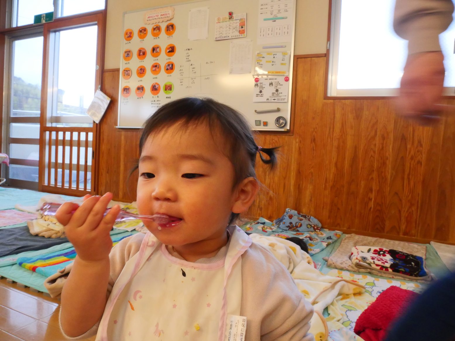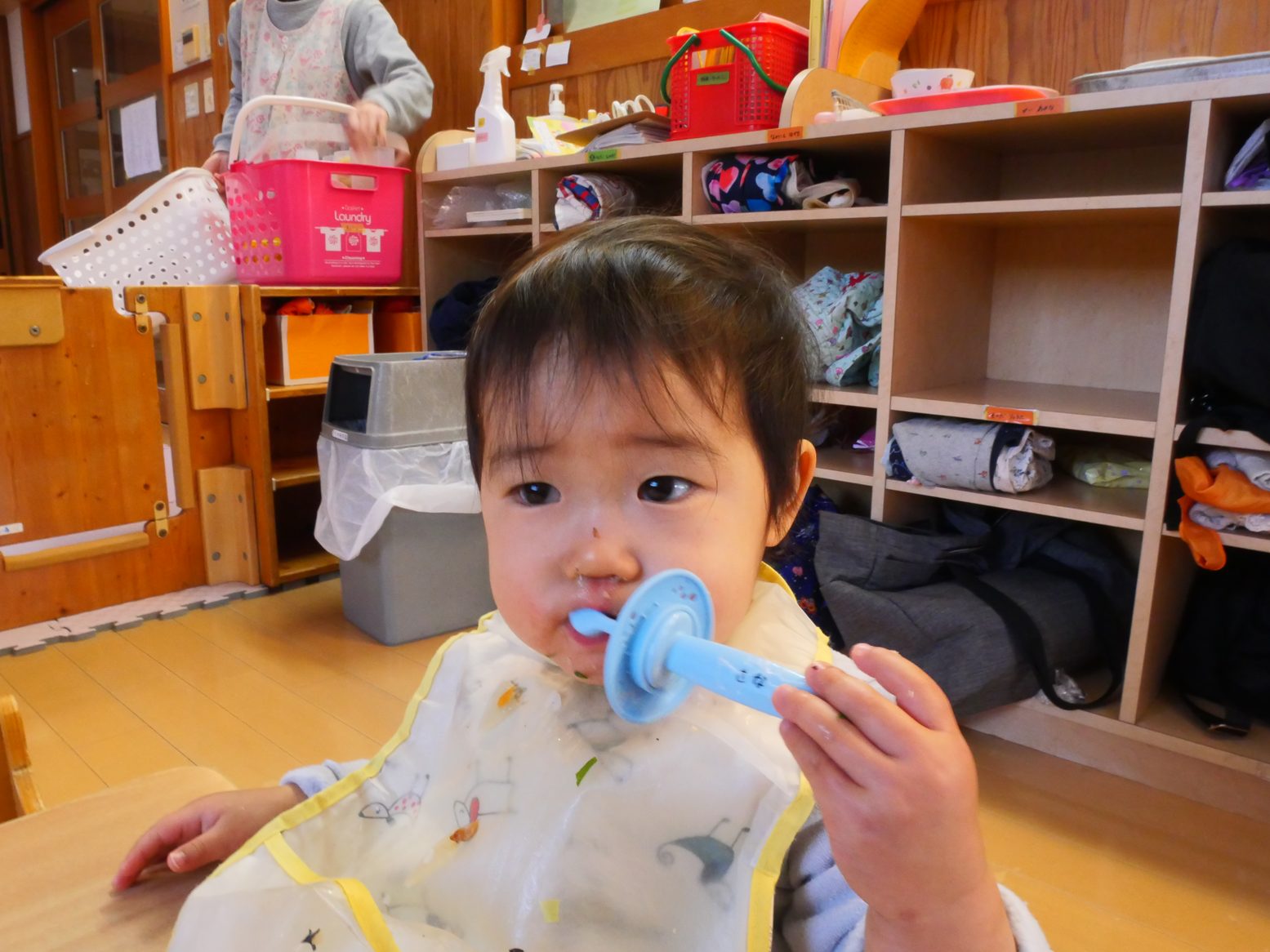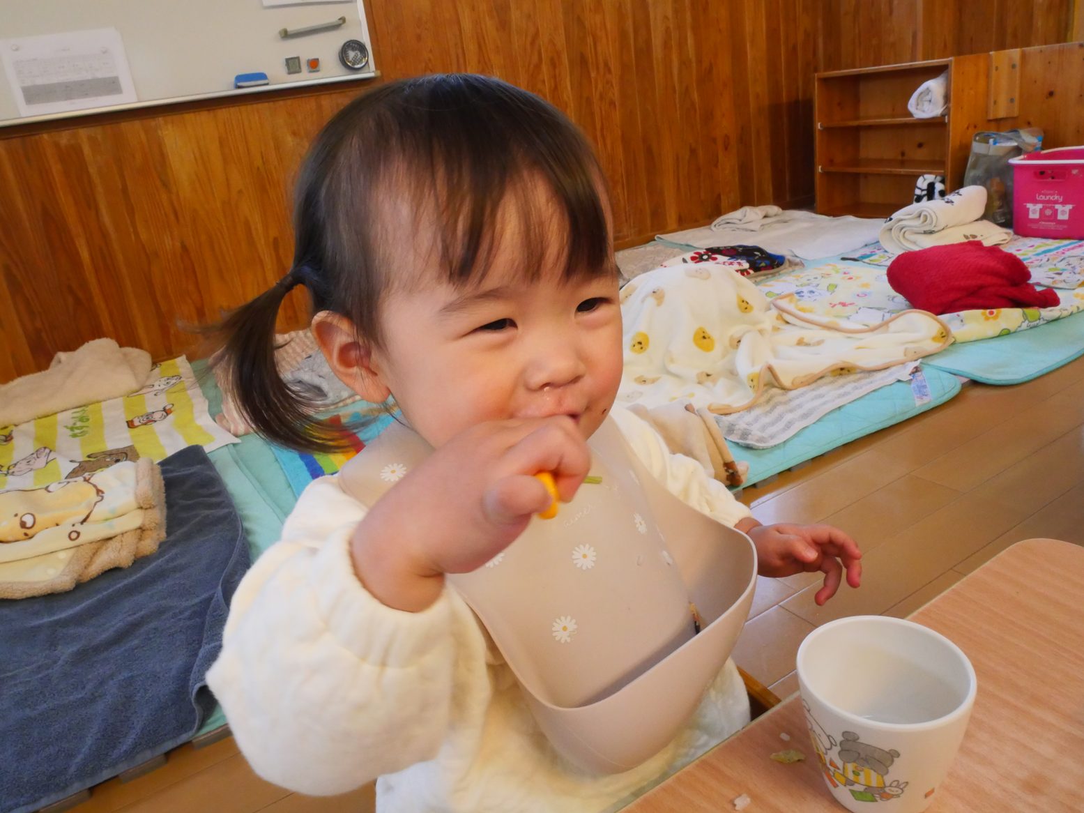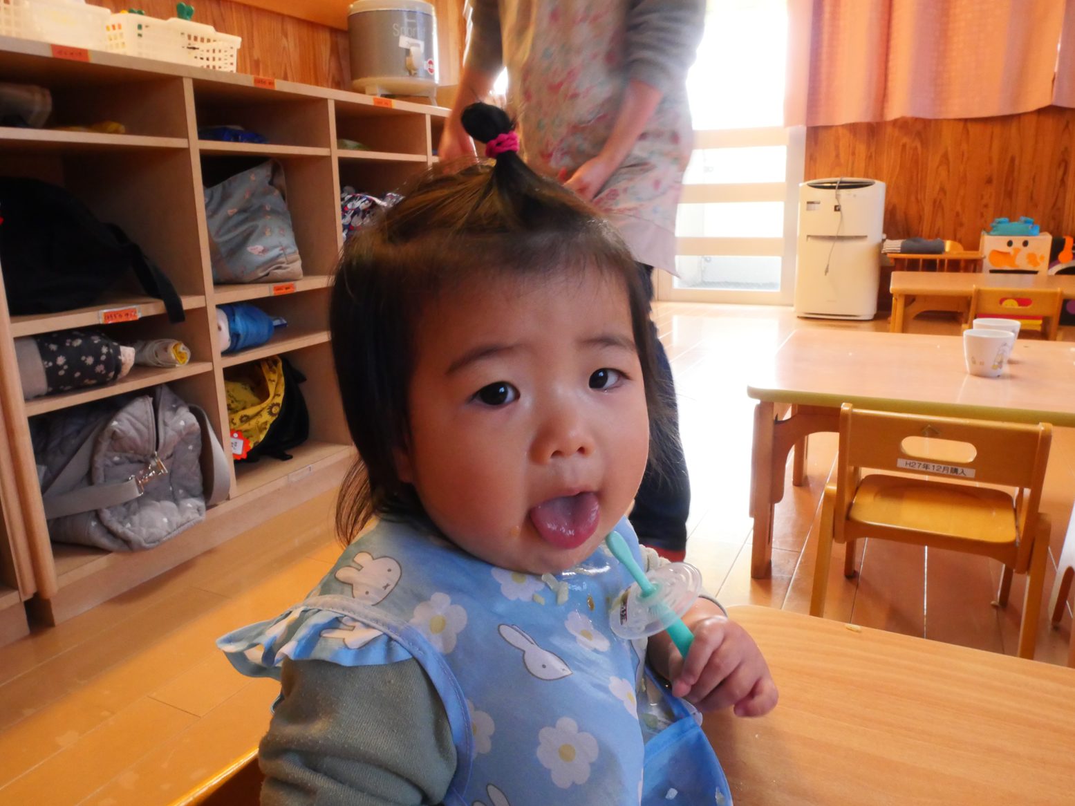 給食を食べ終えると、「歯ブラシちょうだい!」とアピールをしてくれるひよこ組さん。 ご飯を食べたら歯磨きをする習慣が定着してきました! 歯ブラシを渡すと、にこにこ笑顔で歯ブラシを左右に動かす子どもたち。 自分で歯磨きができると、持っている歯ブラシを「はい、どーぞ」して仕上げ磨きもさせてくれます。 毎日の歯磨きで、虫歯予防に努めていきたいと思います!