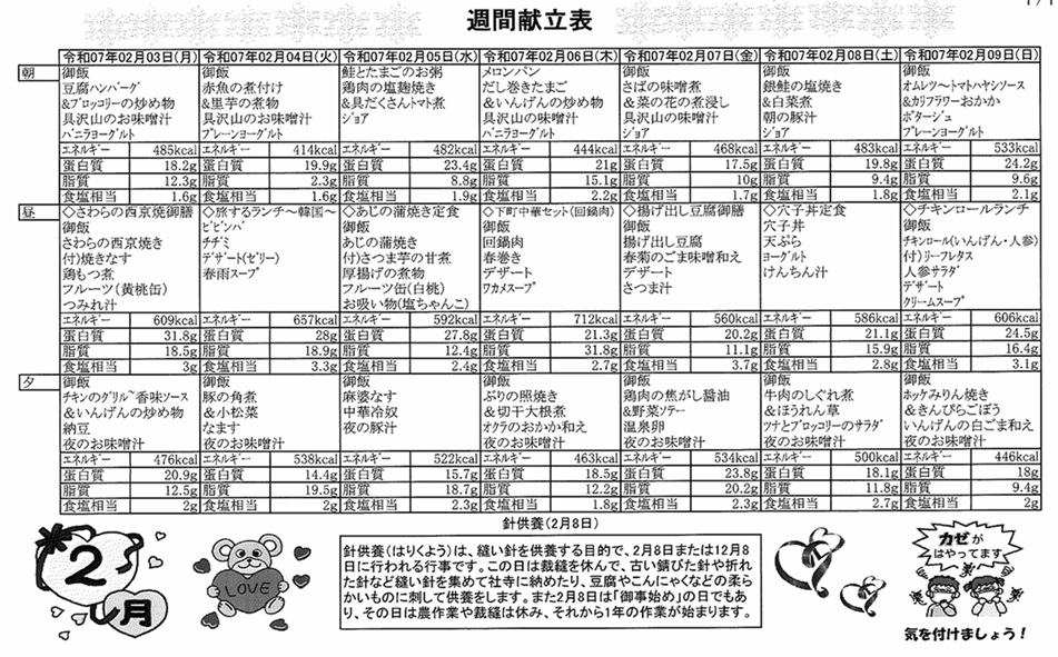 2月3日(月)~2月9日(日)の献立表になります。ぜひご覧ください。