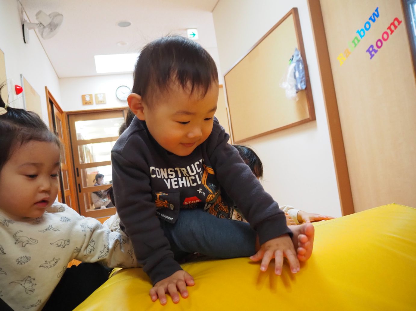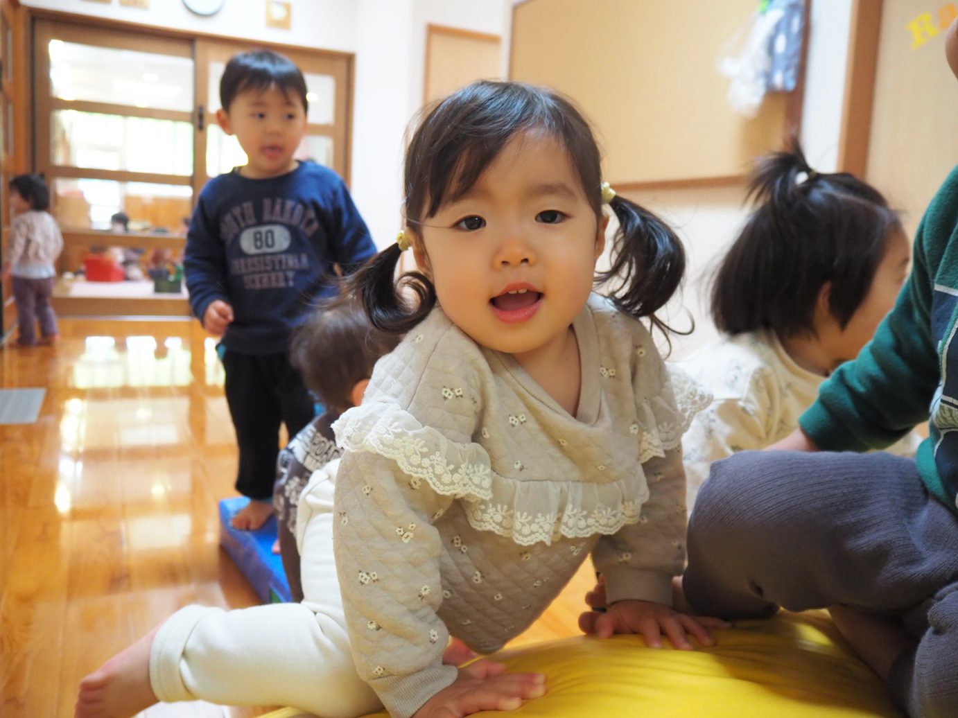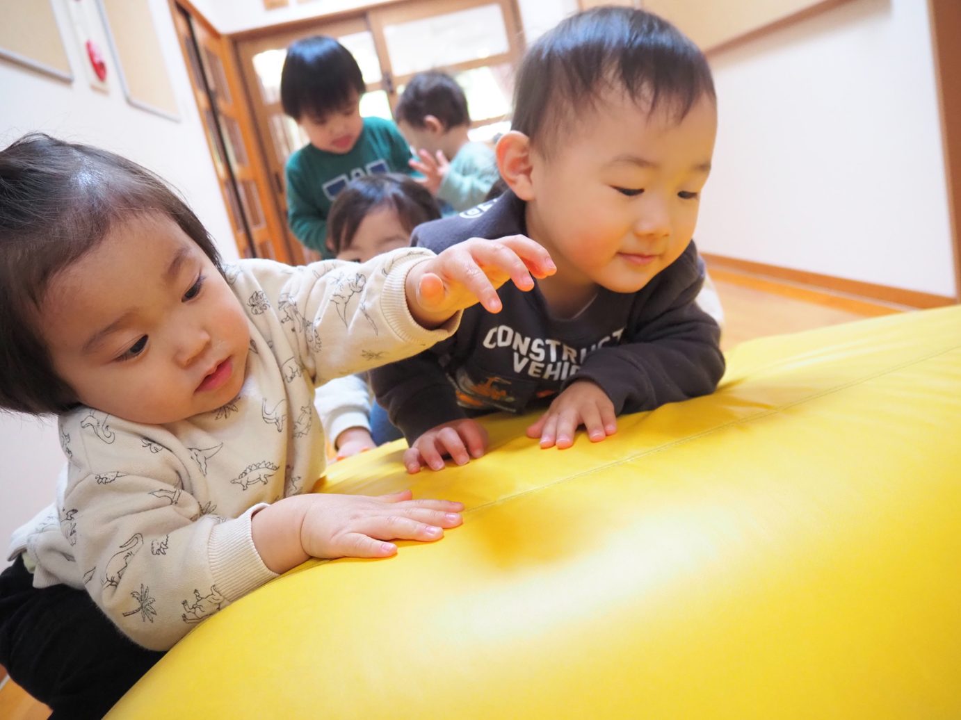 マット遊びに夢中になるこあら組さん。 小さなマットを積み上げ、大きなマットをかぶせて大きな山を作ると、一生懸命上る姿が見られました。 しっかり「じゅんばんばん!」の言葉掛けに合わせて並ぶかっこいいこあら組さん。 上まで登り終えると、滑り台に見立てて「しゅー!」と遊ぶ姿が見られました。 転んでも負けずに何度も挑戦したり、体幹も少しずつついてきたことでバランスを取ったりと楽しく遊ぶ子どもたちでした。