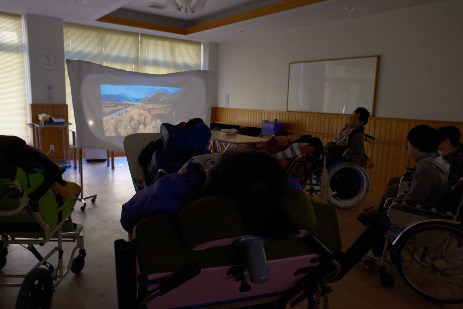 本日はリラクゼーション活動ということで、 静かな音楽や映像を流し、ゆったりとした時間を過ごしました。 アロマの香りも漂った中で・・・ 気づけば目を閉じウトウトとする方も・・・🌝 いつもは賑やかな声がするのですが、今日は静かで時間がゆっくりと過ぎていくようでした。 活動が終わって部屋が明るくなると、皆さんスッキリとした表情をされていました。 気分転換できたでしょうか・・・🌝?