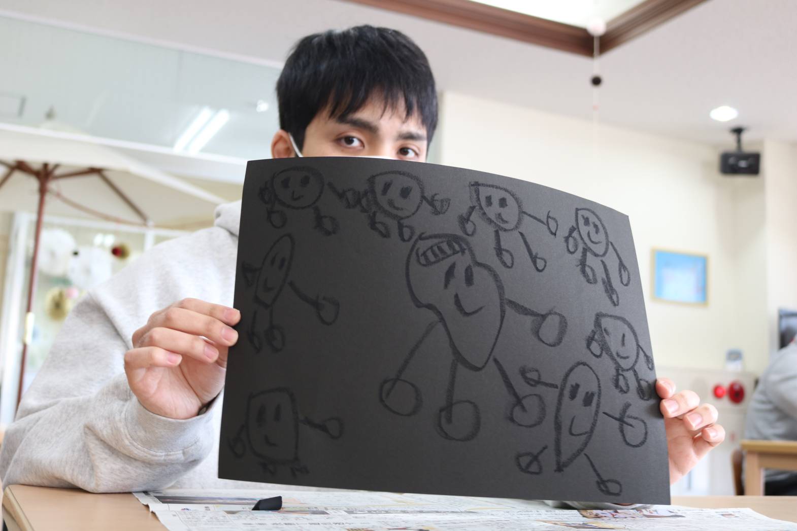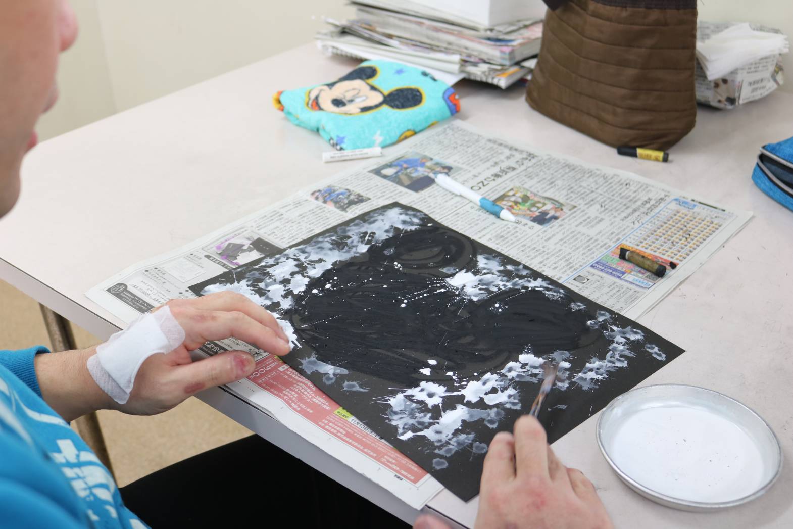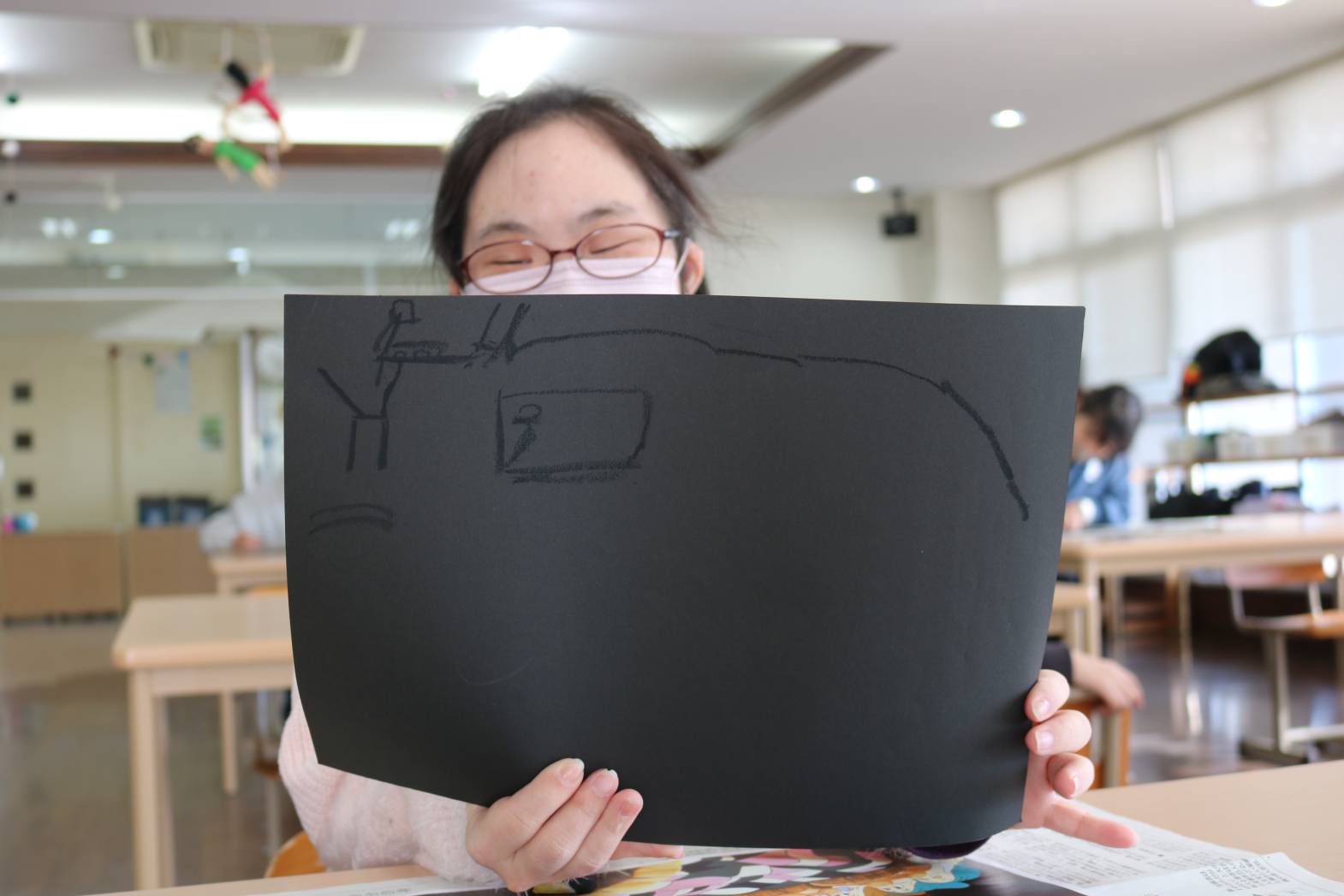 チャレンジデイにて、Let’sアートを行いました。 Let’sアートでは、皆さんに様々な素材や表現方法に 挑戦してもらいながらアート活動を行っています。 今回は、黒い画用紙に白黒2色のクレヨンと絵の具だけを使って 自由に制作してもらいました。 皆さん笑顔で時間いっぱい取り組んでいました。
