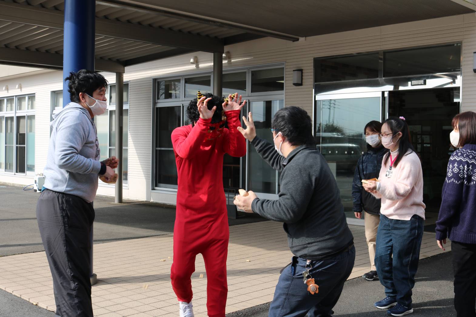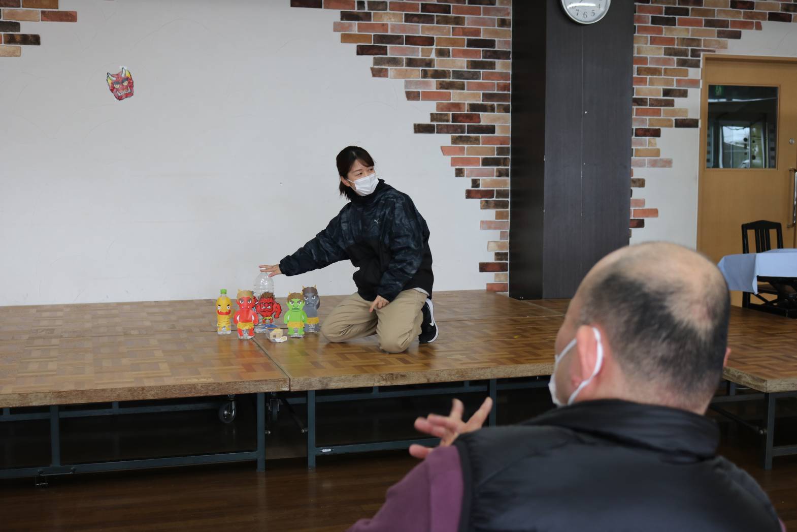節分会を行いました。 今年は暦の関係で、2月2日が節分の日でした。 本日は節分ボーリングゲームと、 施設内の豆まきを行いました。 はじめ緊張された様子だった方も、笑顔で豆を投げて 鬼(厄)を追い払うことが出来てよかったです。