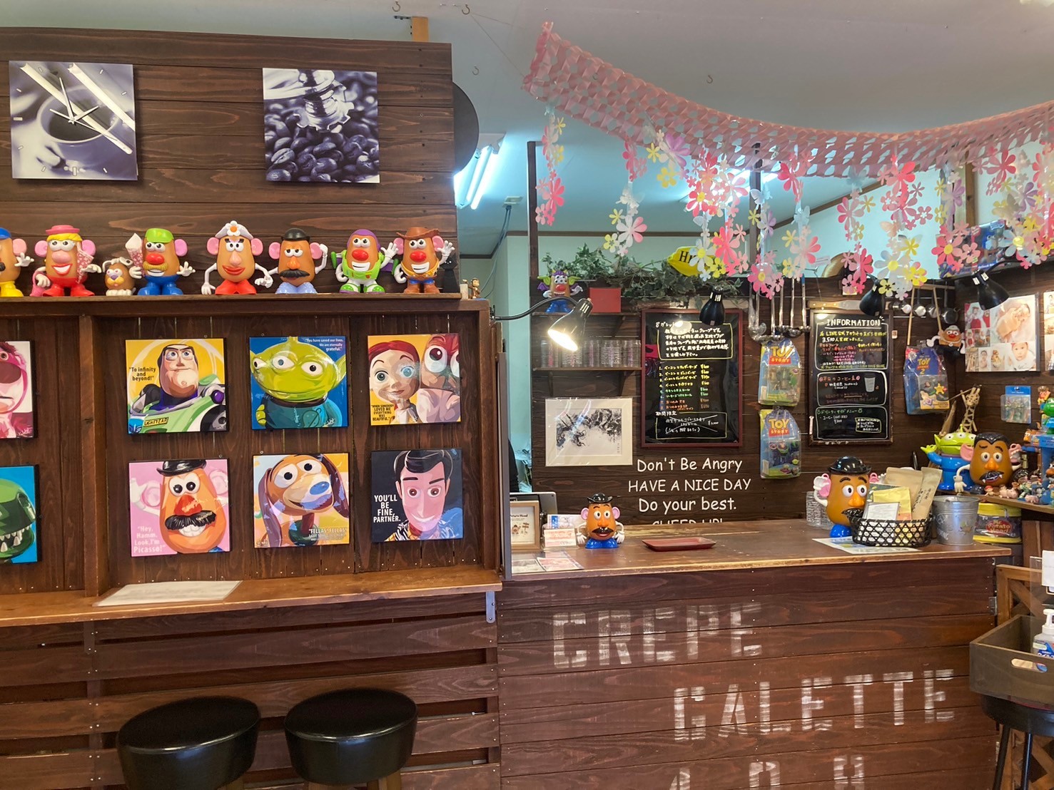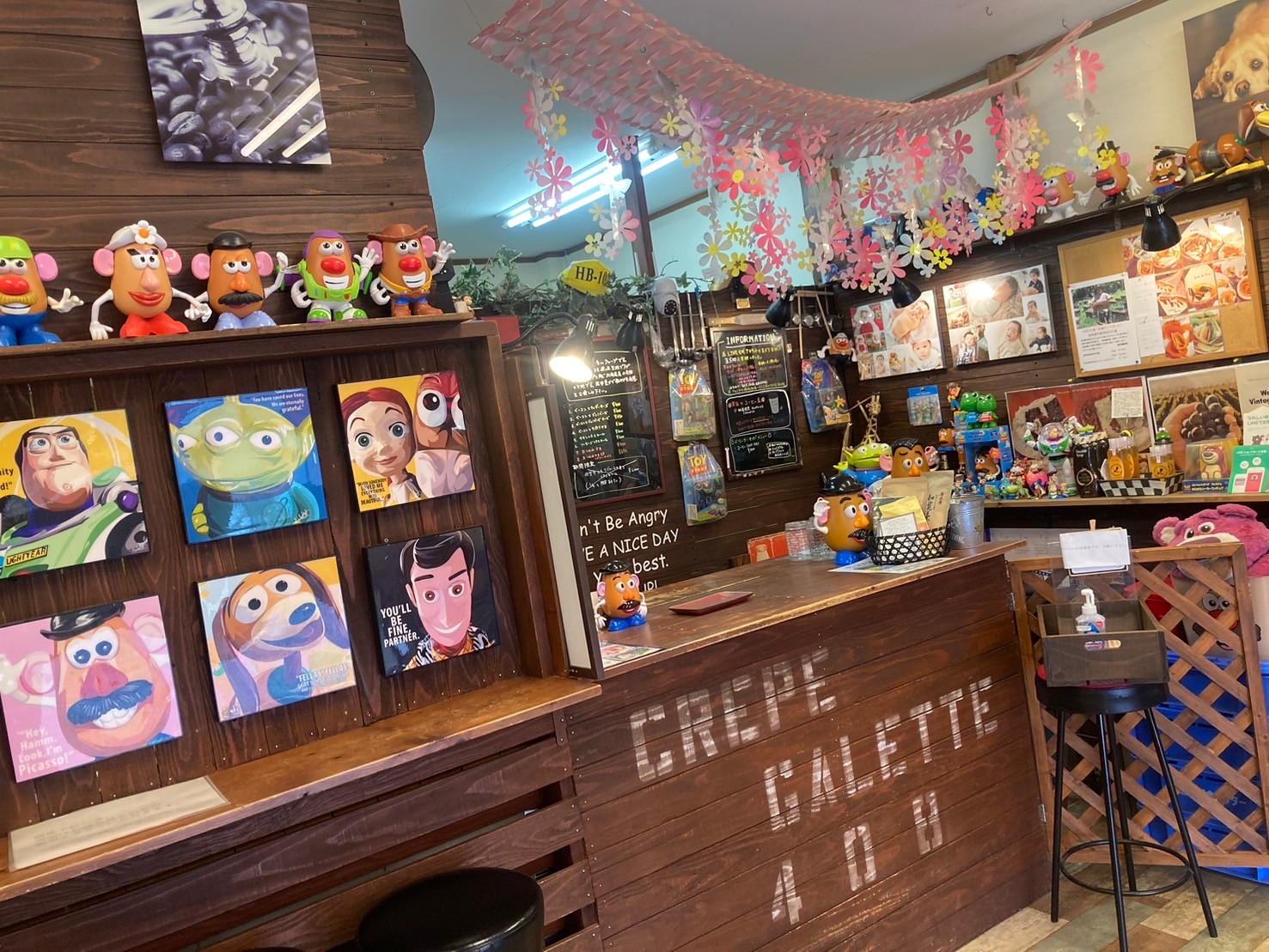 店内には「トイストーリー」とくにポテトヘッドの人形がたくさん飾っていて、待っている時間も楽しめます!とっても美味しいので、みなさんもぜひ一度、足を運んでみてくださいね!