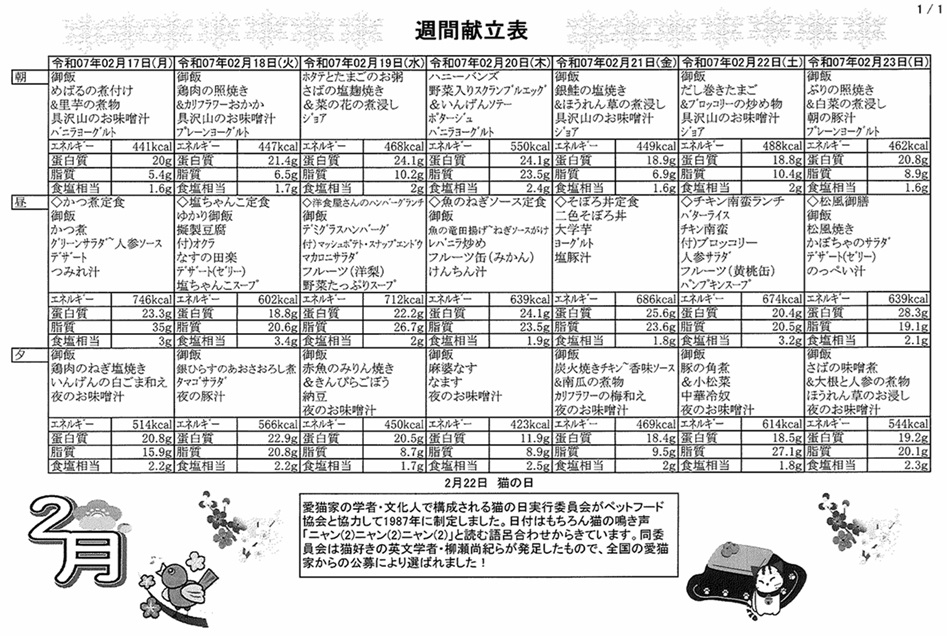 2月17日(月)~2月23日(日)の献立表になります。ぜひご覧ください。