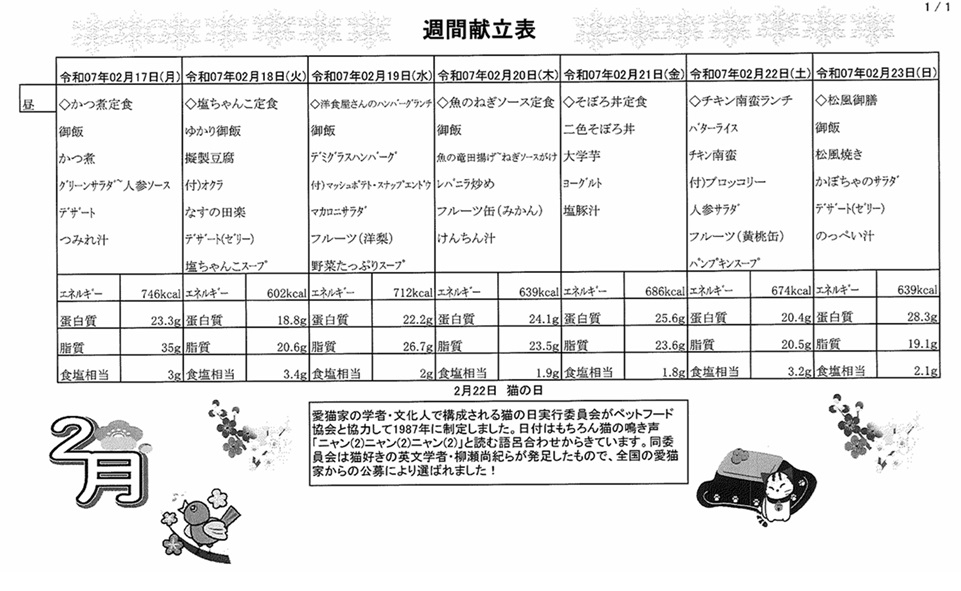 2月17日(月)~2月23日(日)の献立表になります。ぜひご覧ください。