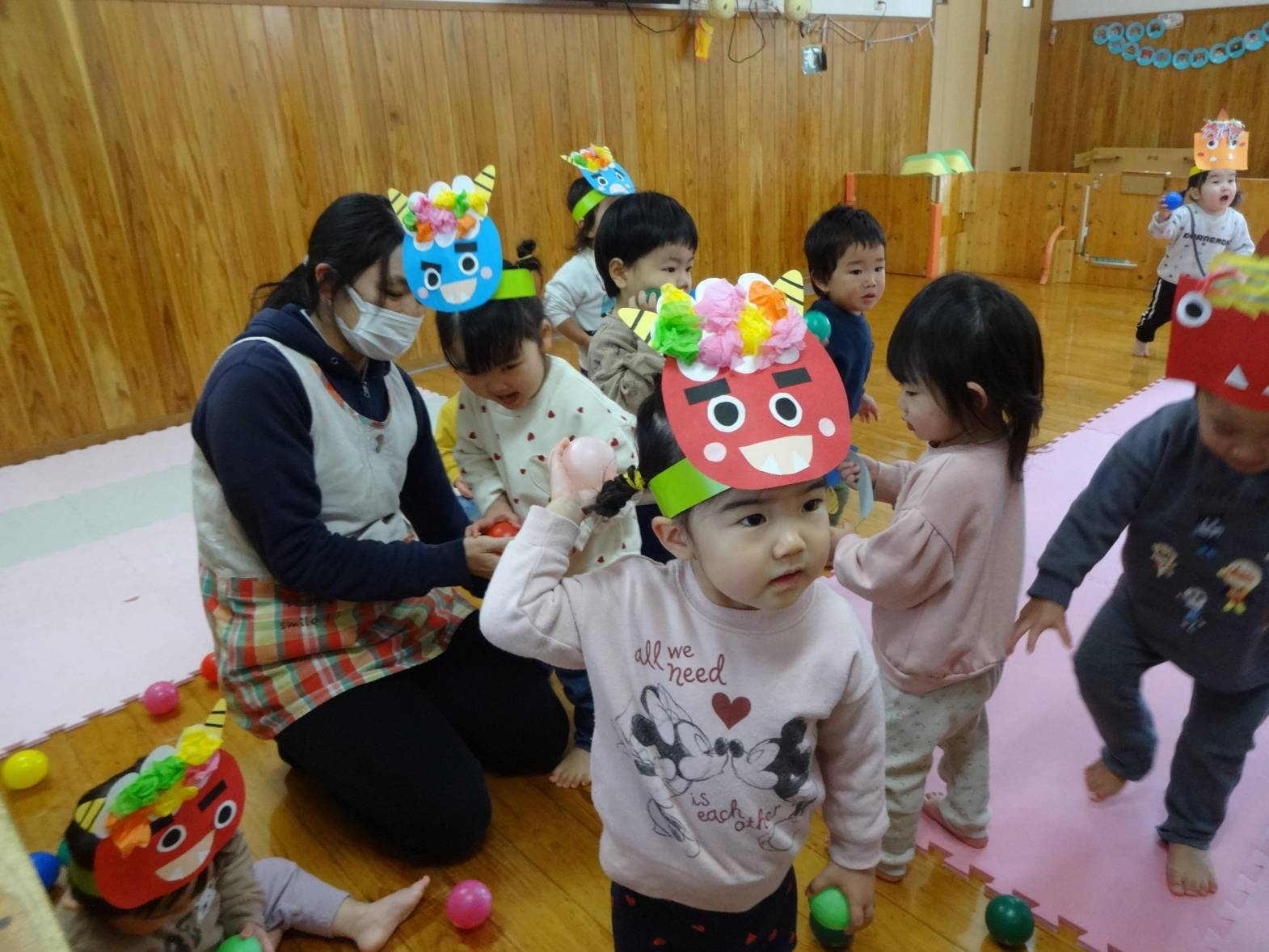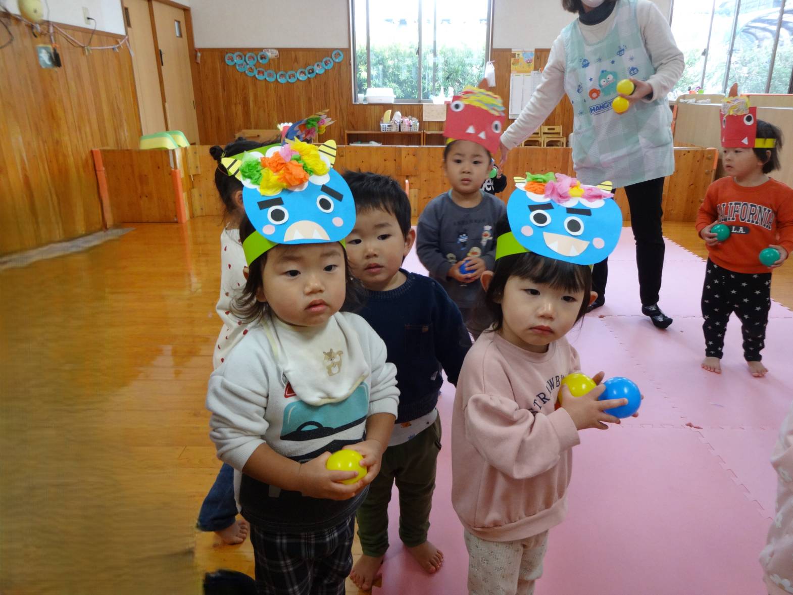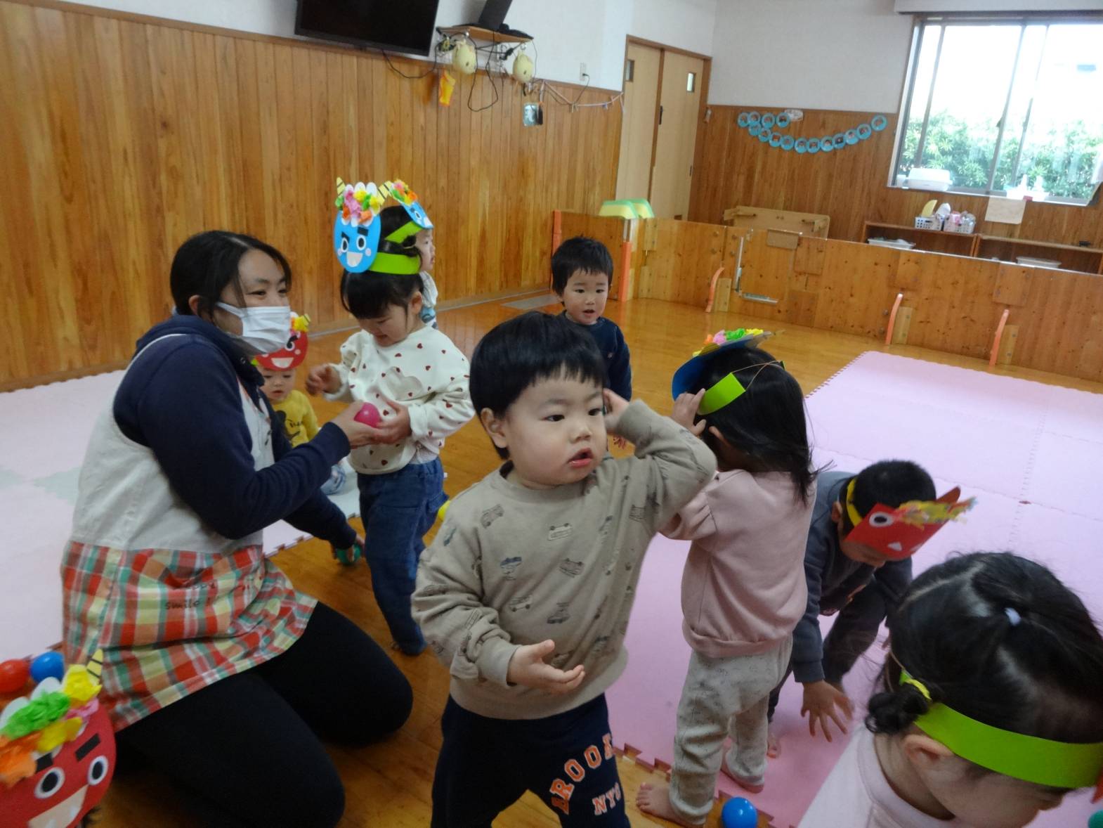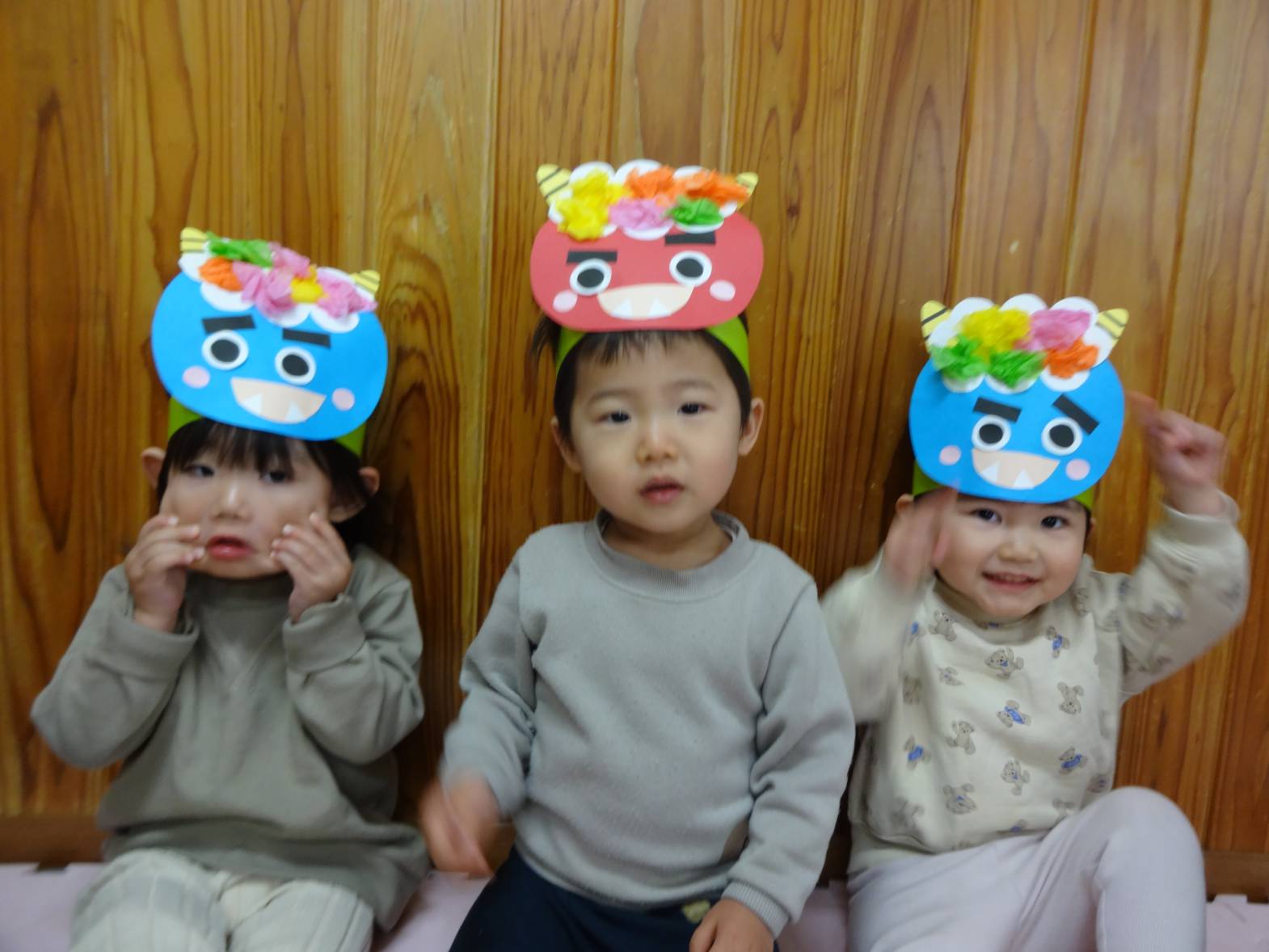 先週は節分会があり、みんなで可愛い鬼さんに変身! 自分たちで作った色んな表情のお面を見ると、 “付けたい!”とワクワクした様子で近くに来る子どもたち♪ 鬼さんがくるとビックリする子どもたちでしたが、ボールを上手に投げることもできました! 最後には「バイバイ~!」と何度も手を振り、見送るこあら組さんでした。