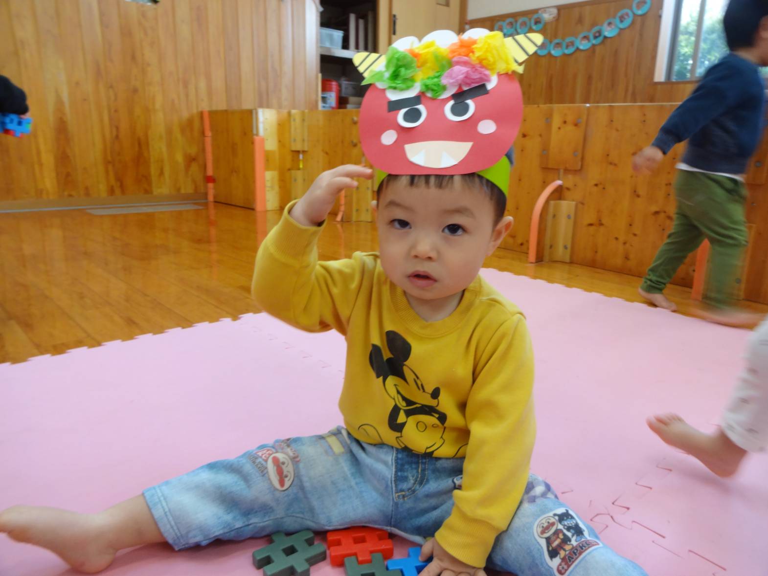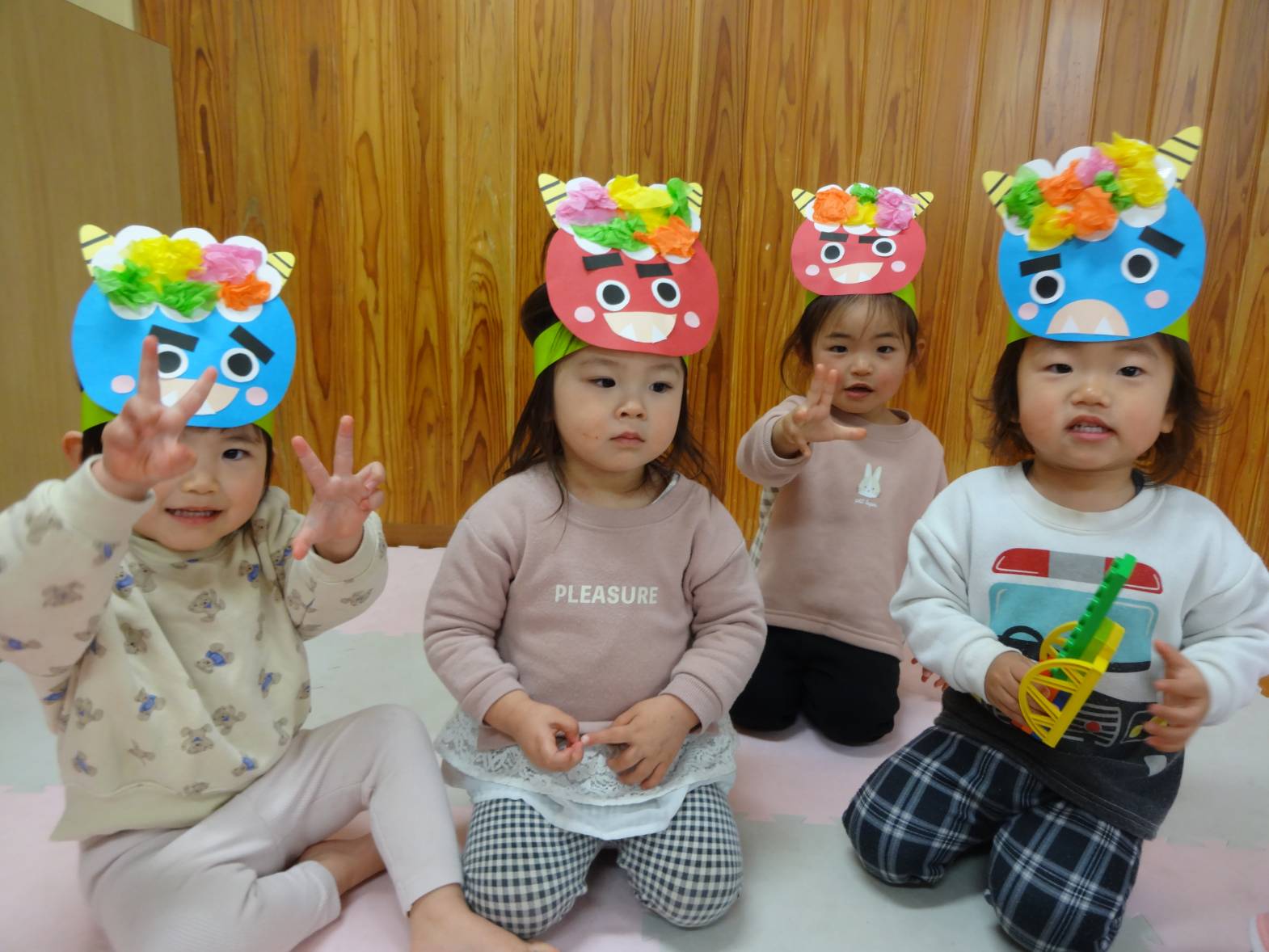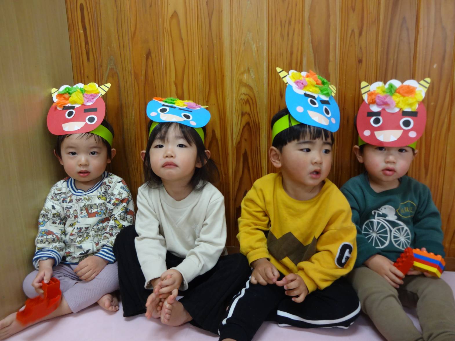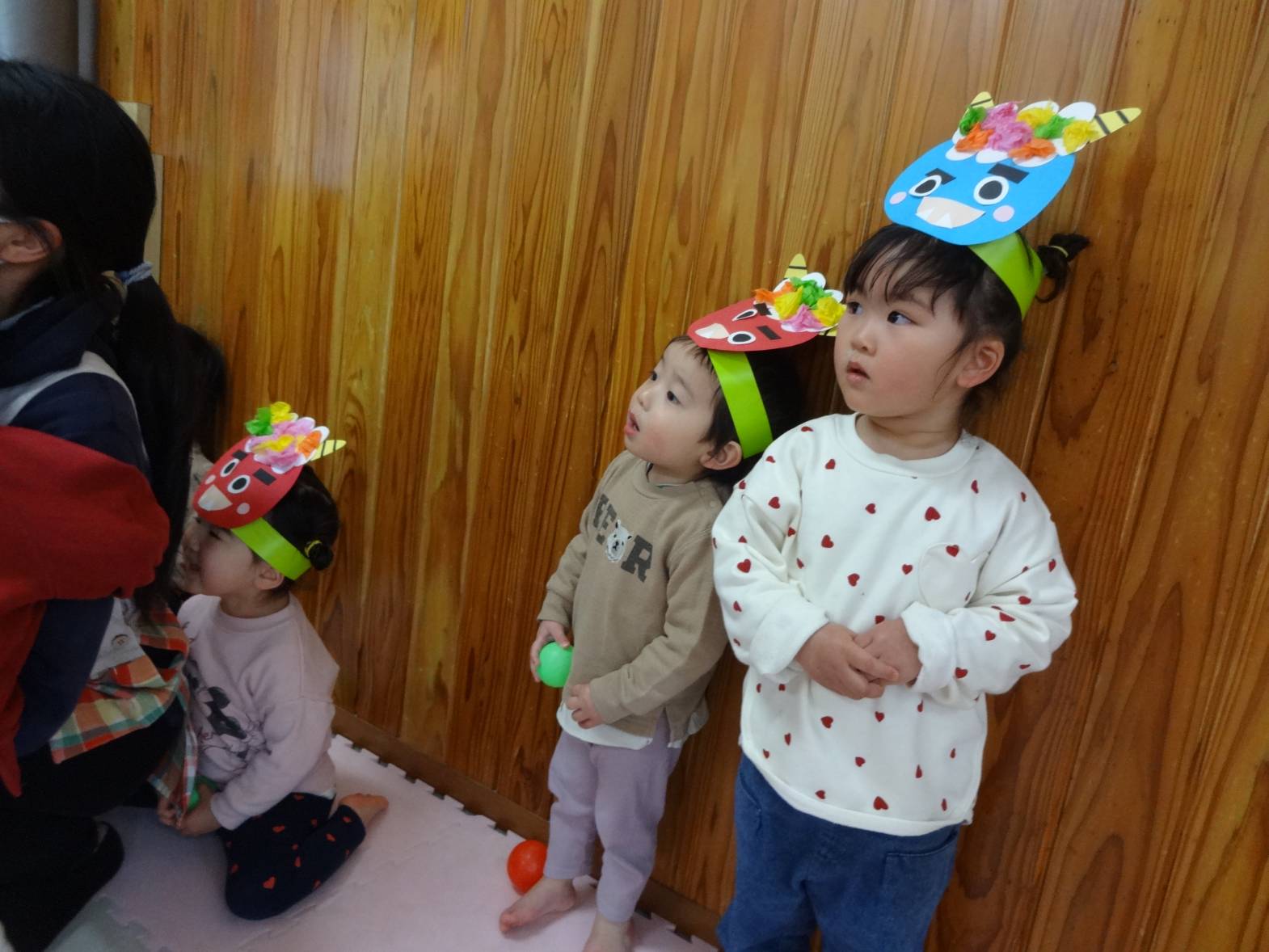 先週は節分会があり、みんなで可愛い鬼さんに変身! 自分たちで作った色んな表情のお面を見ると、 “付けたい!”とワクワクした様子で近くに来る子どもたち♪ 鬼さんがくるとビックリする子どもたちでしたが、ボールを上手に投げることもできました! 最後には「バイバイ~!」と何度も手を振り、見送るこあら組さんでした。