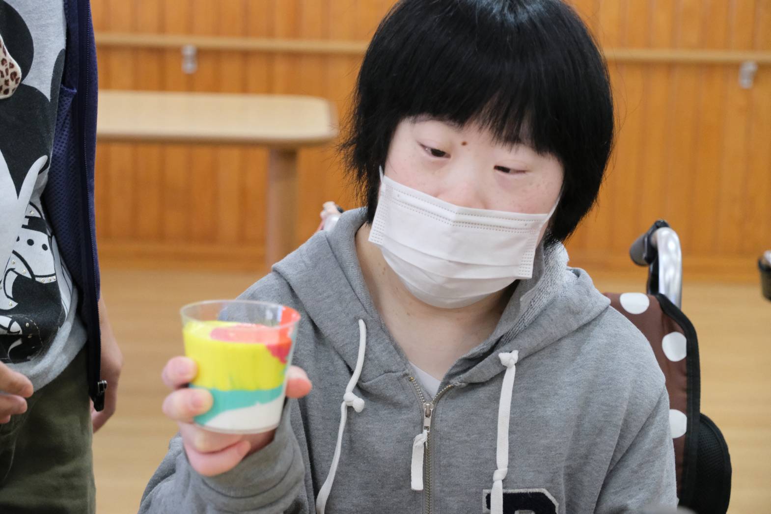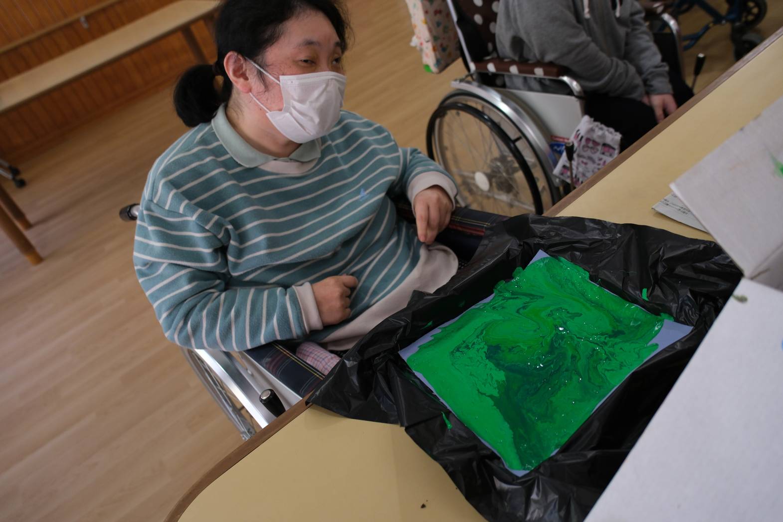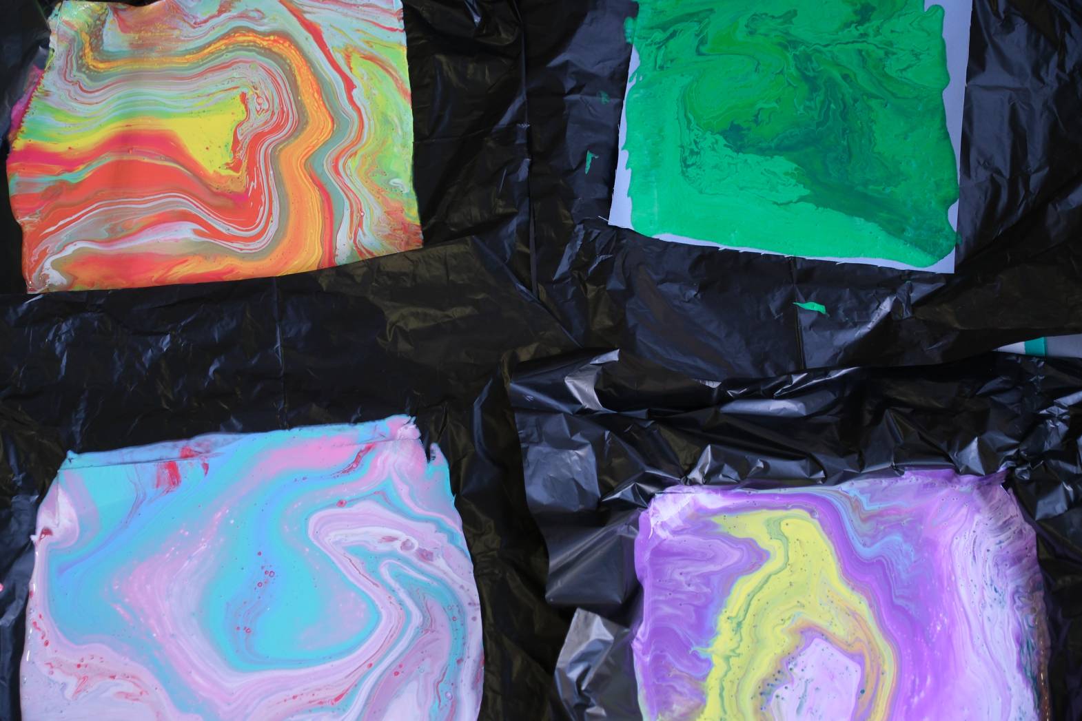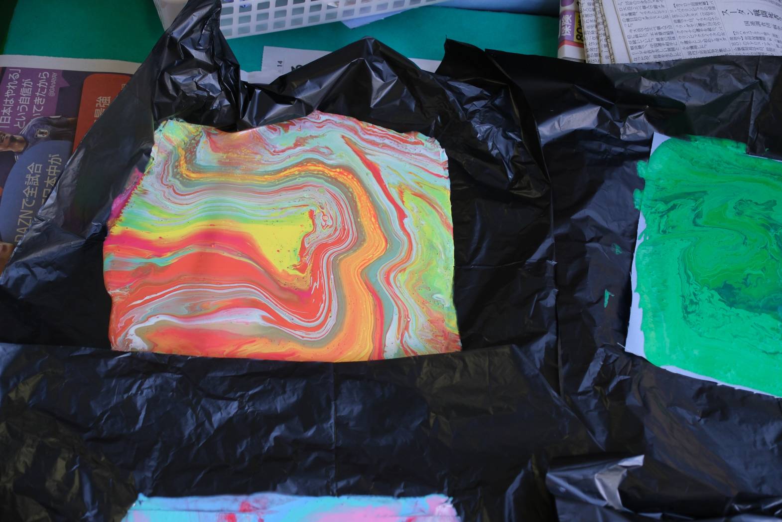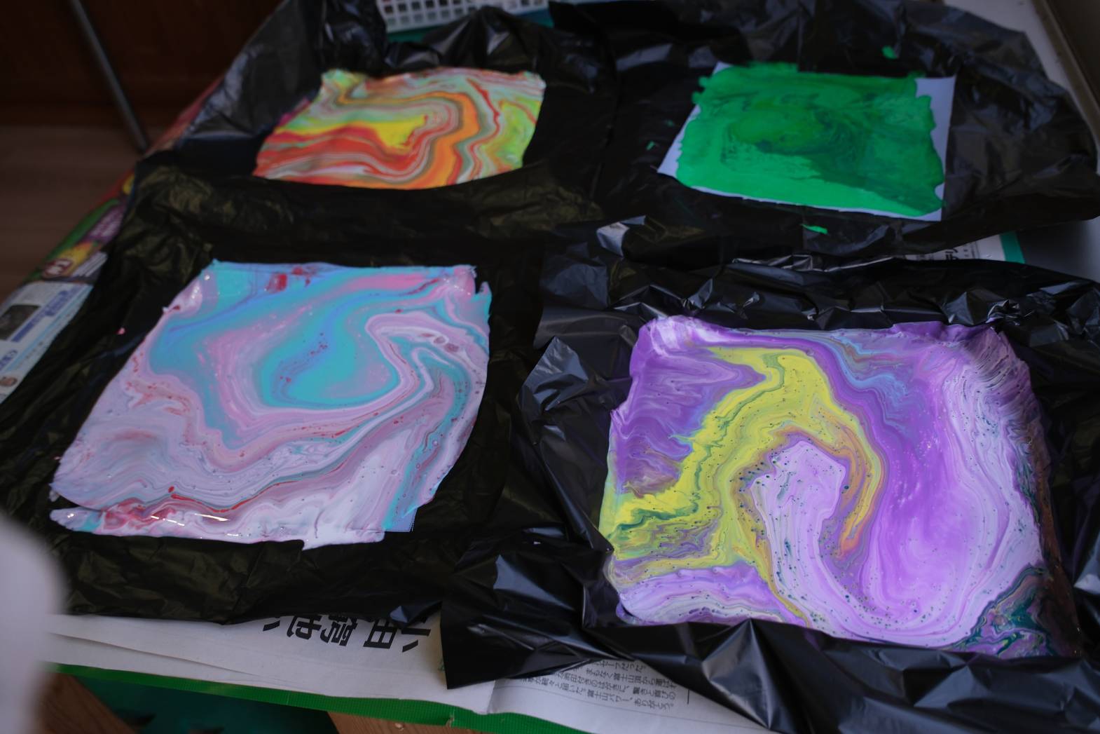 本日の活動はフルイドアート! あまり聞きなれない言葉だったのですが、絵の具と洗濯のりを混ぜたものを 層になるように一つのコップに入れ、それをキャンバスに垂らし込むように広げると、 綺麗な模様が浮かび上がってきました☆ 絵の具が流れていくにつれて模様もどんどん変わっていき、 周りからは「すごーい!綺麗だね!」と歓声がチラホラ・・・ 皆さんの完成品がコチラ! こちらを使って、更なる作品を作っていくので 次回の活動も楽しみですね☆