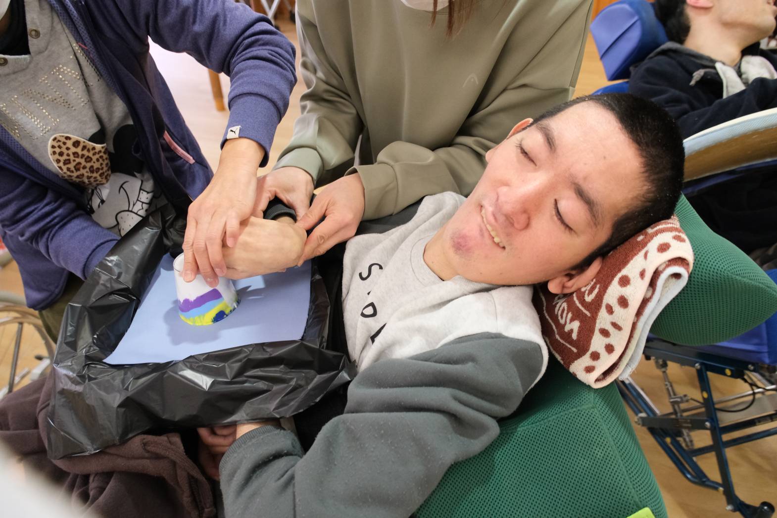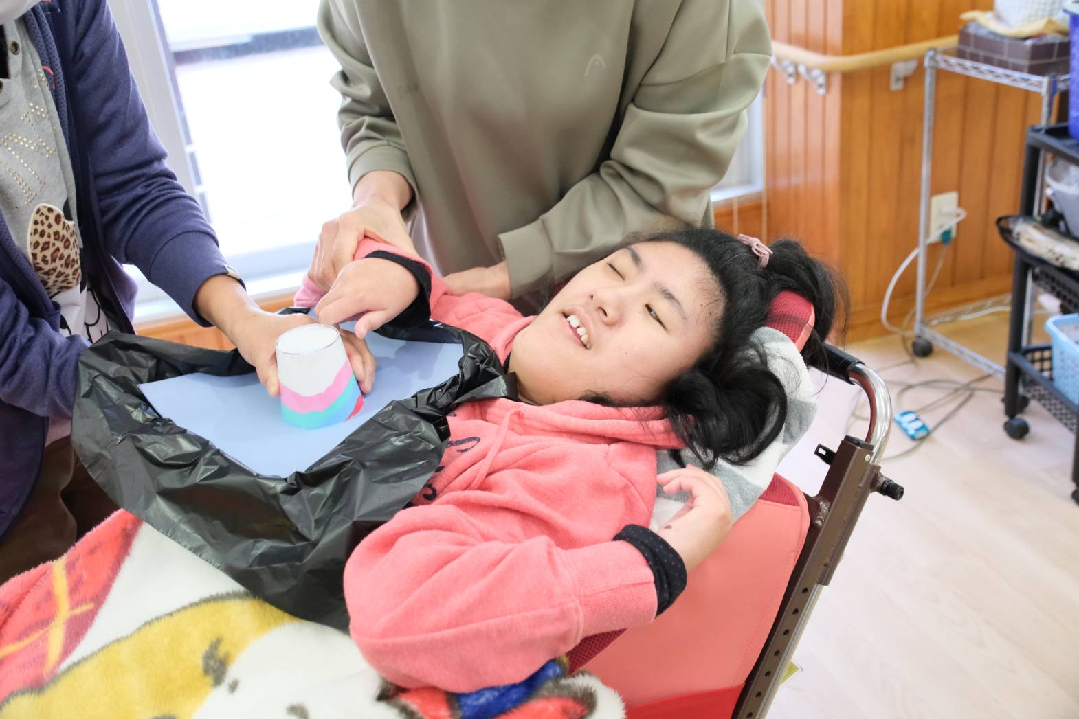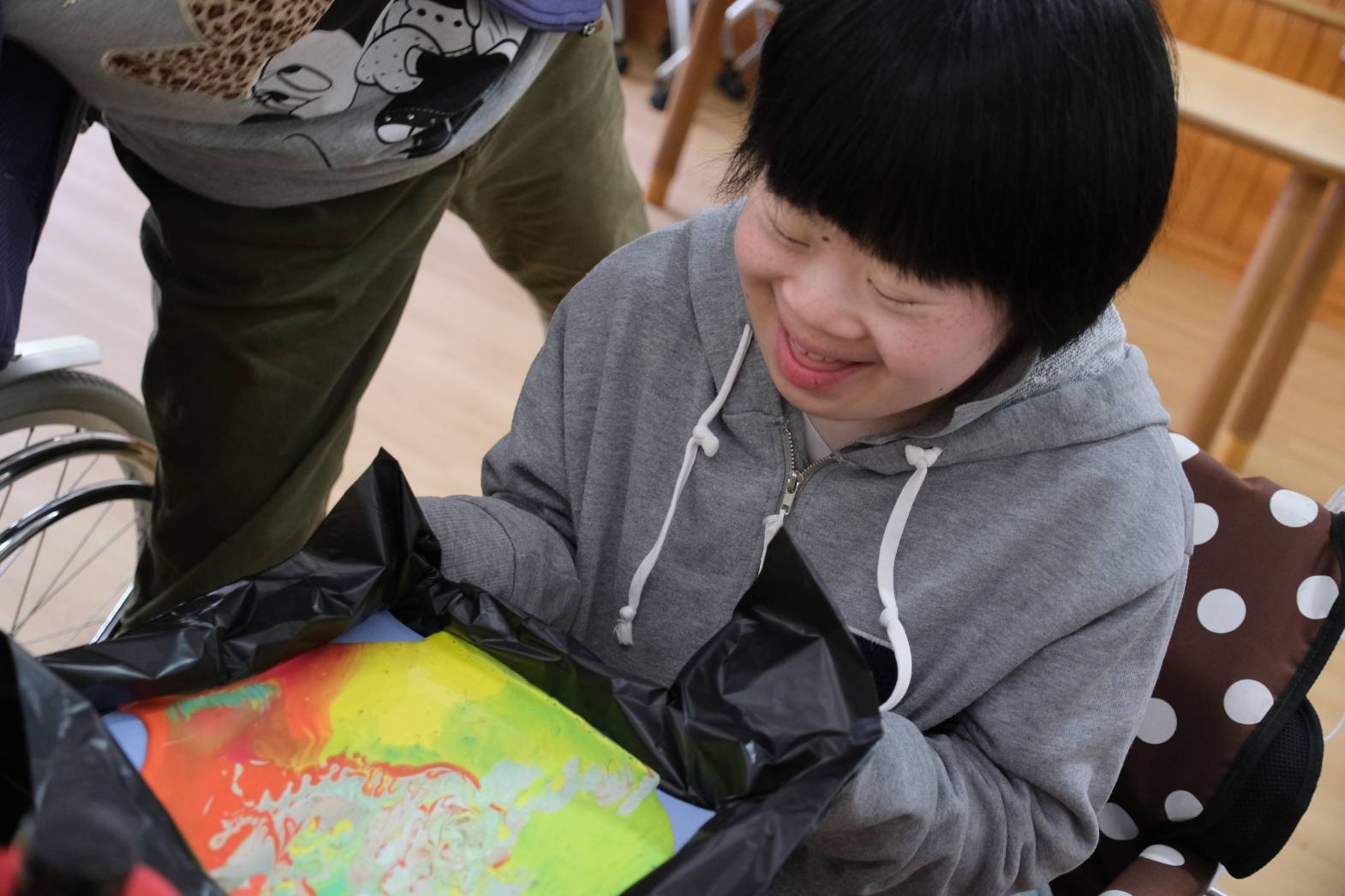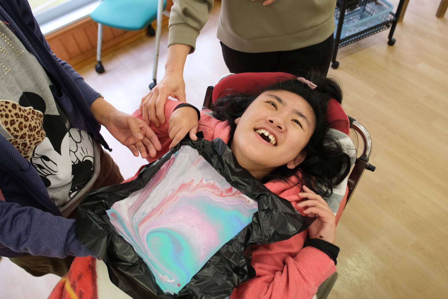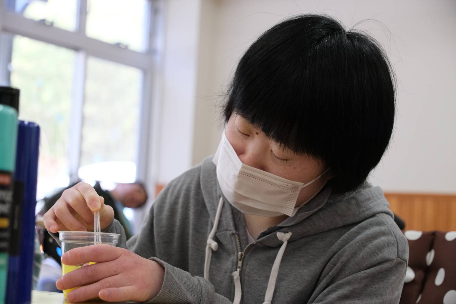 本日の活動はフルイドアート! あまり聞きなれない言葉だったのですが、絵の具と洗濯のりを混ぜたものを 層になるように一つのコップに入れ、それをキャンバスに垂らし込むように広げると、 綺麗な模様が浮かび上がってきました☆ 絵の具が流れていくにつれて模様もどんどん変わっていき、 周りからは「すごーい!綺麗だね!」と歓声がチラホラ・・・ 皆さんの完成品がコチラ! こちらを使って、更なる作品を作っていくので 次回の活動も楽しみですね☆