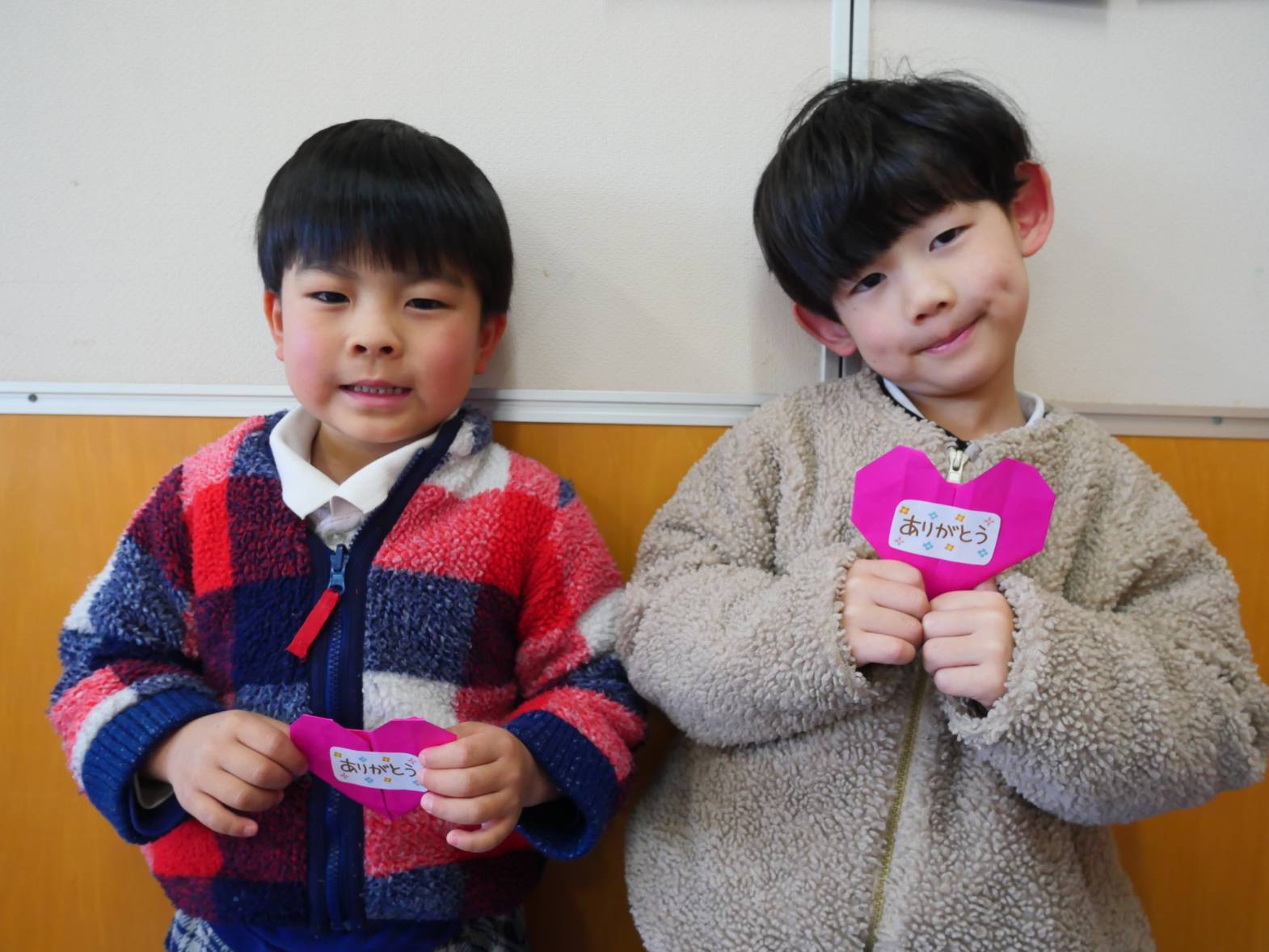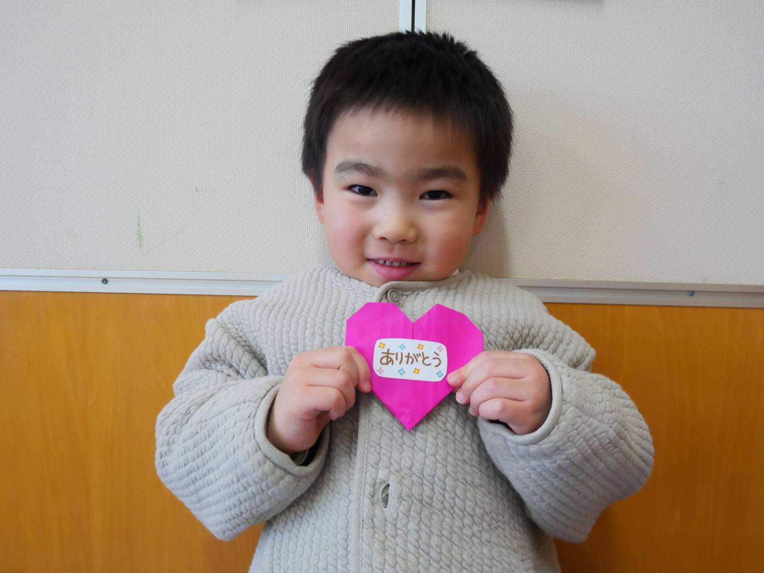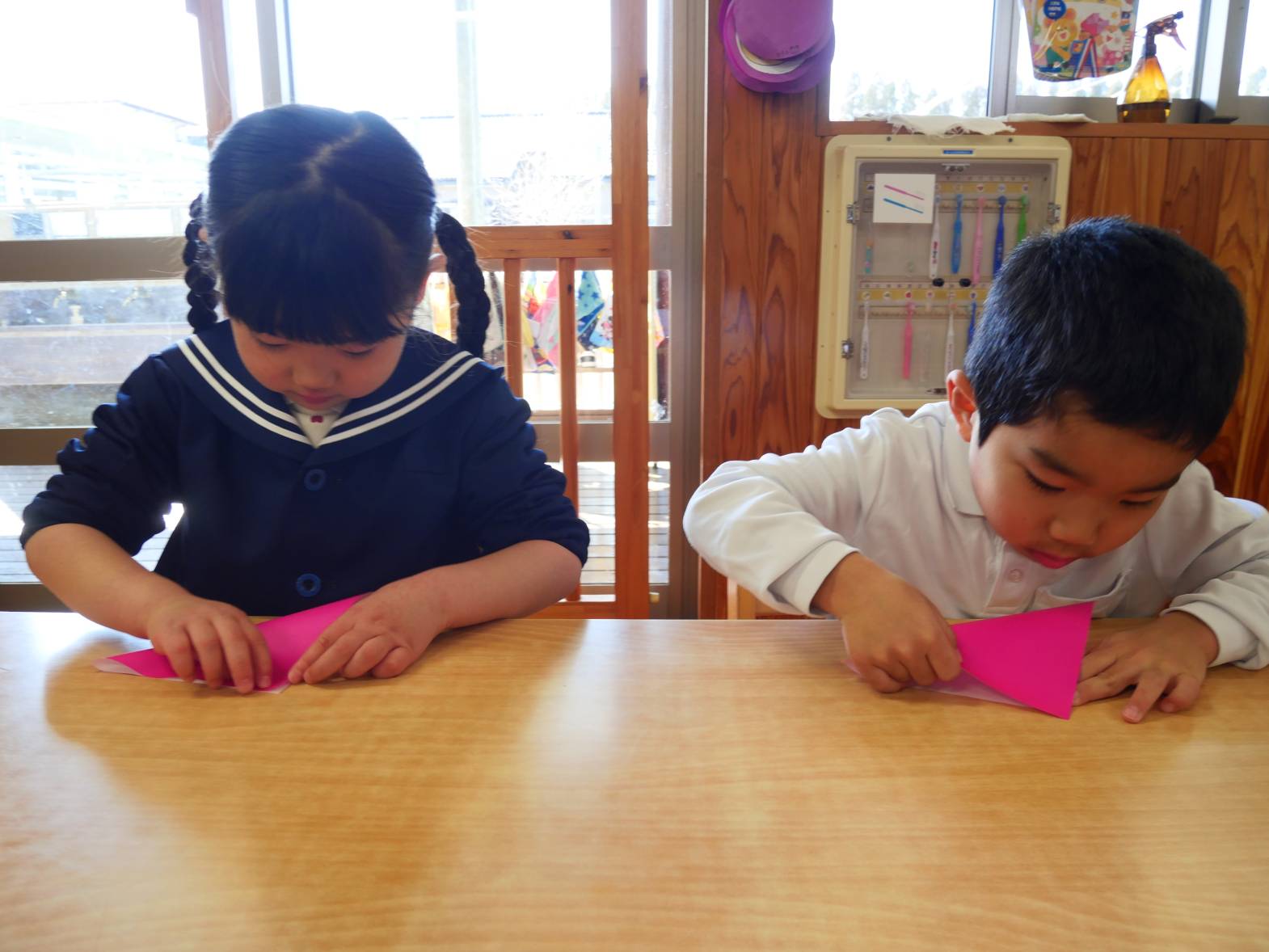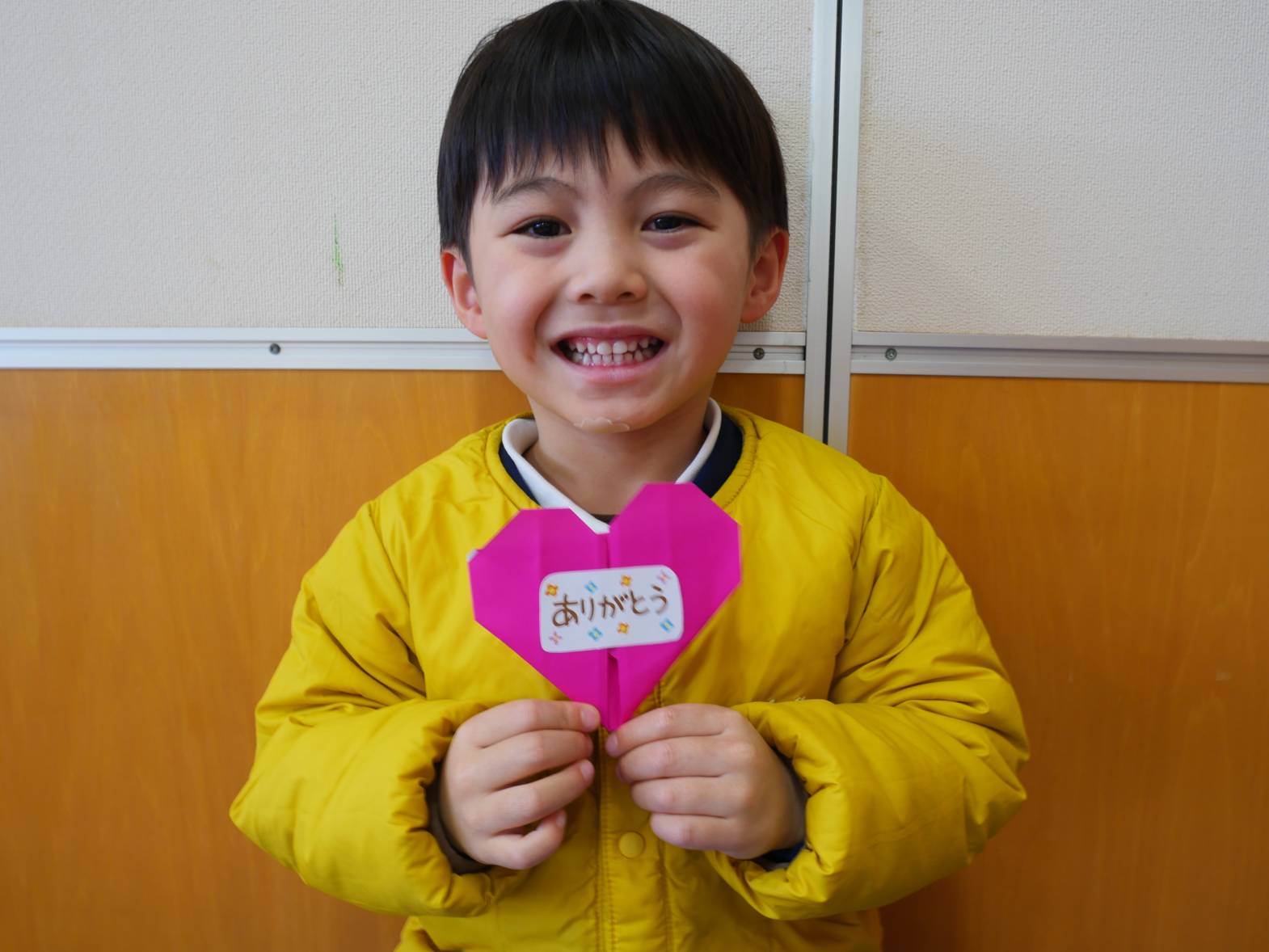 今日はバレンタインデーの日!大好きなお父さんとお母さんのために日頃の感謝を込めて、プレゼントを作りました。 子どもたちが最近はまっている折り紙で、ハートを折りました。「しっかりアイロンしないと、綺麗な形にならないよ。」、「ここは三角形に折るんだよ。」と、友だち同士で教え合いながら、折ることができました。 「お家に帰ったら“ママいつもありがとう”って渡そうかな。」、「僕は“大好きだよ”って言おう!」と、お母さんやお父さんに渡すことを楽しみにしていました。ぜひ、ご家庭で見られてみてください。