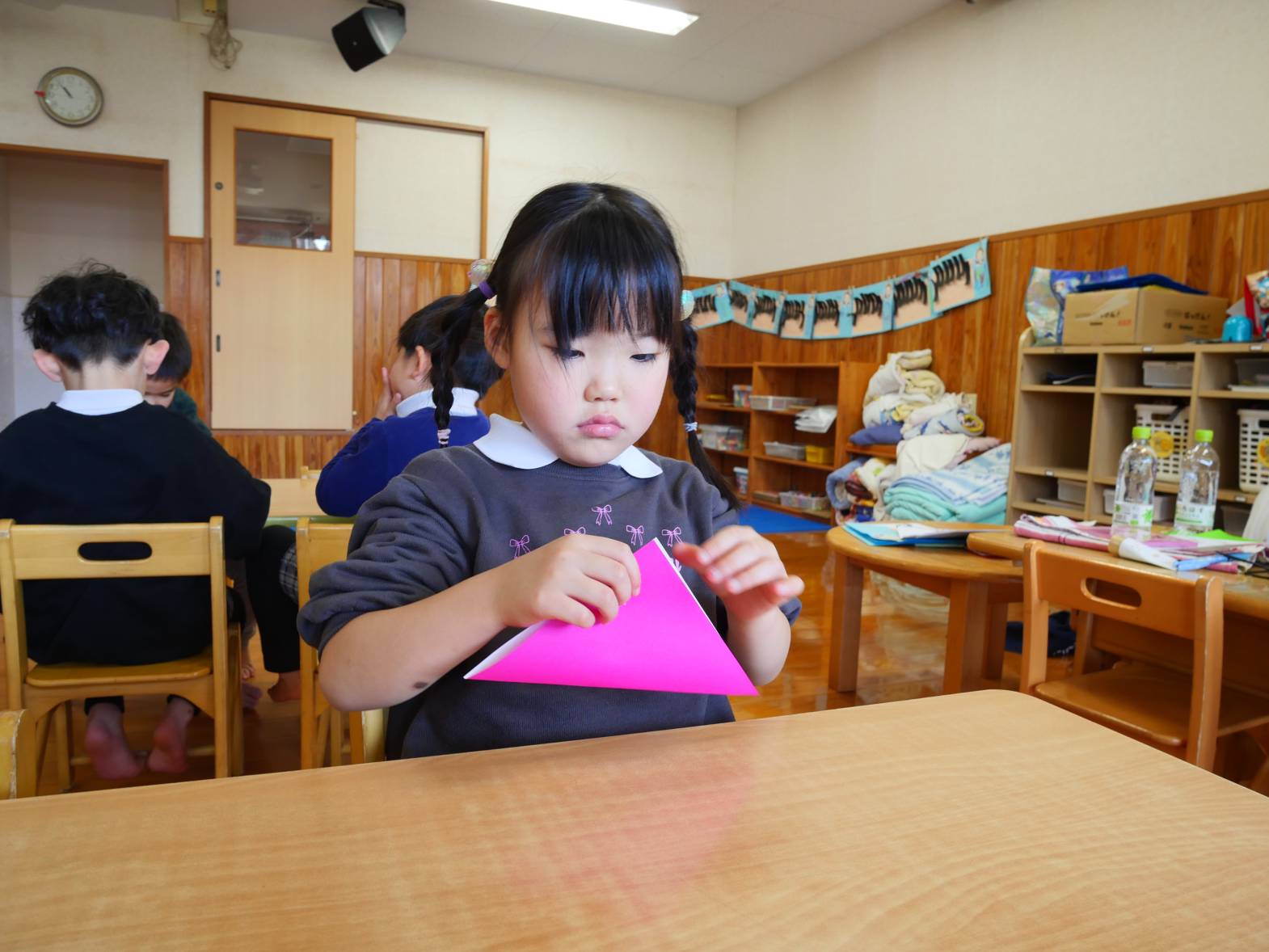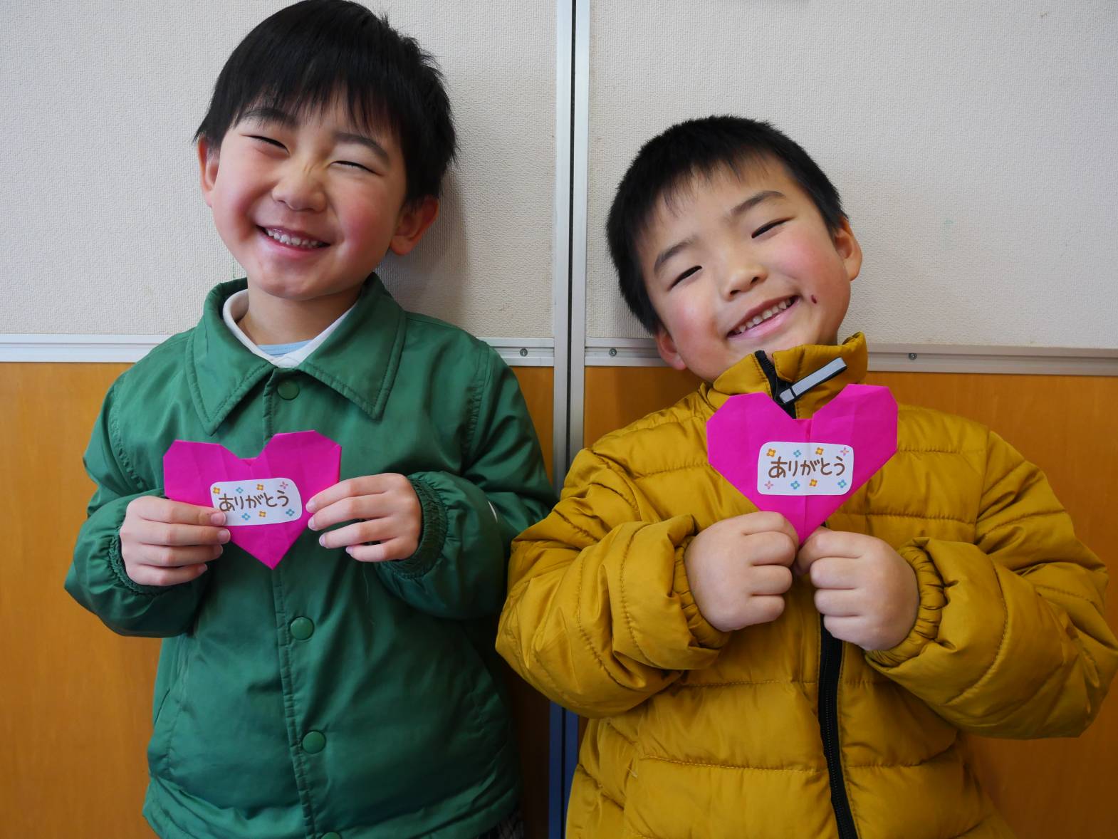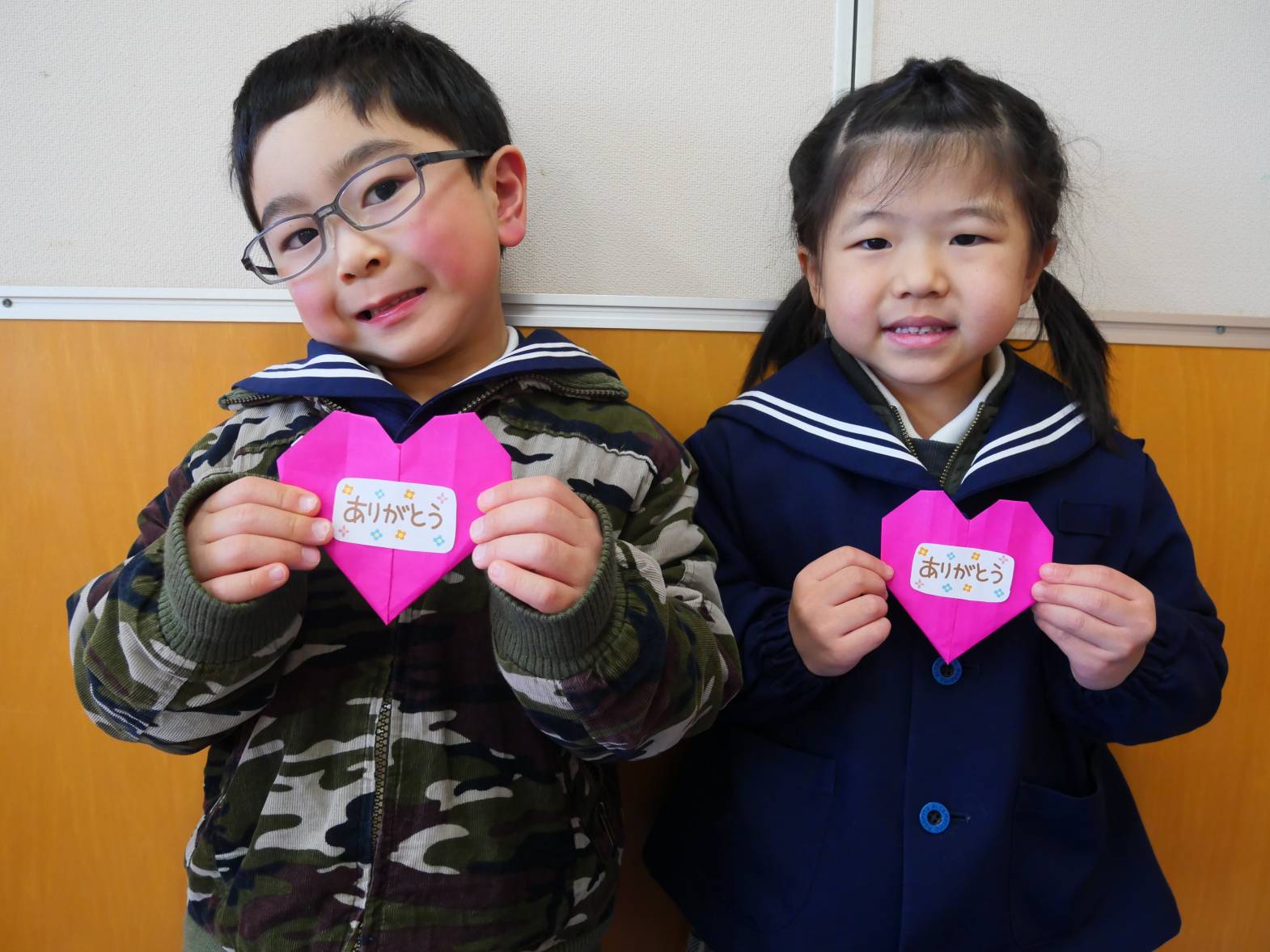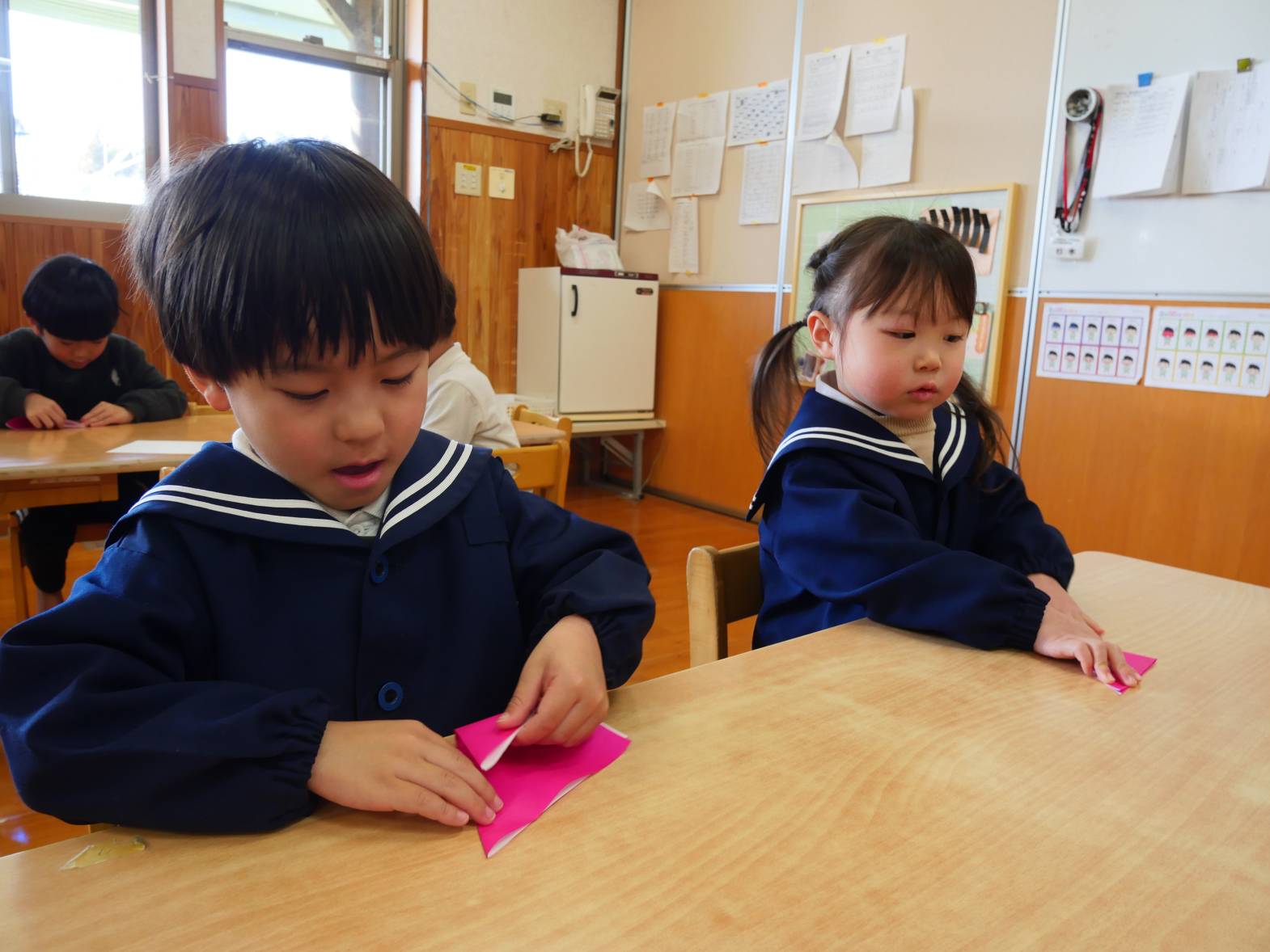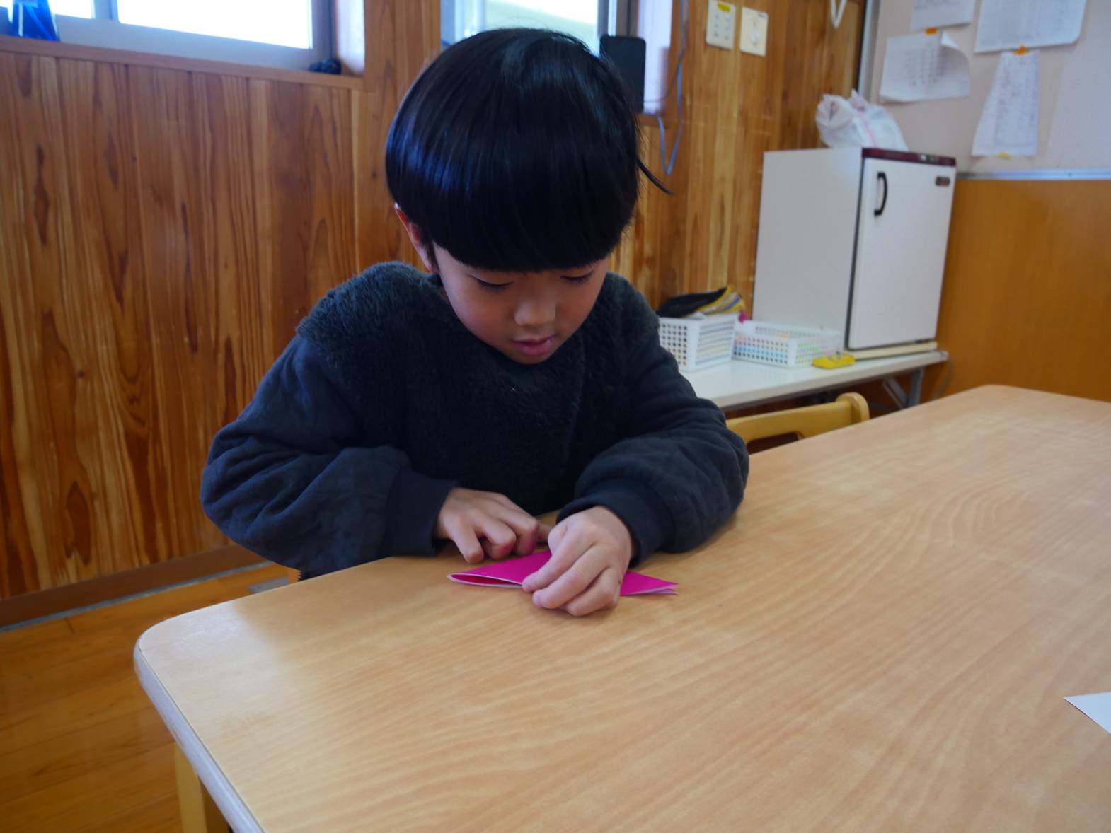 今日はバレンタインデーの日!大好きなお父さんとお母さんのために日頃の感謝を込めて、プレゼントを作りました。 子どもたちが最近はまっている折り紙で、ハートを折りました。「しっかりアイロンしないと、綺麗な形にならないよ。」、「ここは三角形に折るんだよ。」と、友だち同士で教え合いながら、折ることができました。 「お家に帰ったら“ママいつもありがとう”って渡そうかな。」、「僕は“大好きだよ”って言おう!」と、お母さんやお父さんに渡すことを楽しみにしていました。ぜひ、ご家庭で見られてみてください。