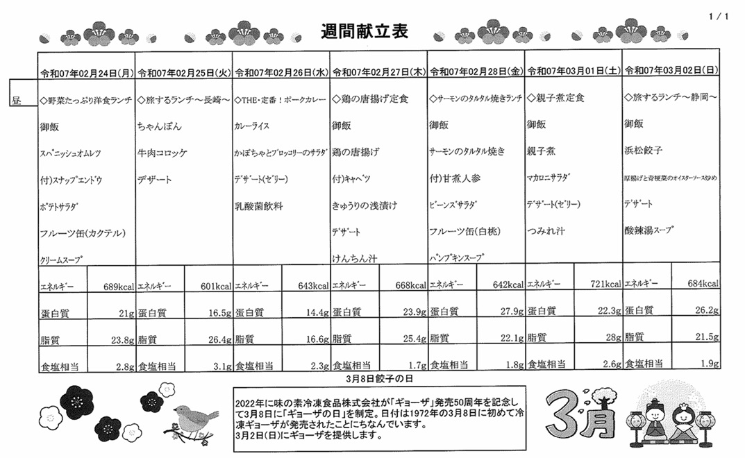 2月24日(月)~3月2日(日)の献立表になります。ぜひご覧ください。