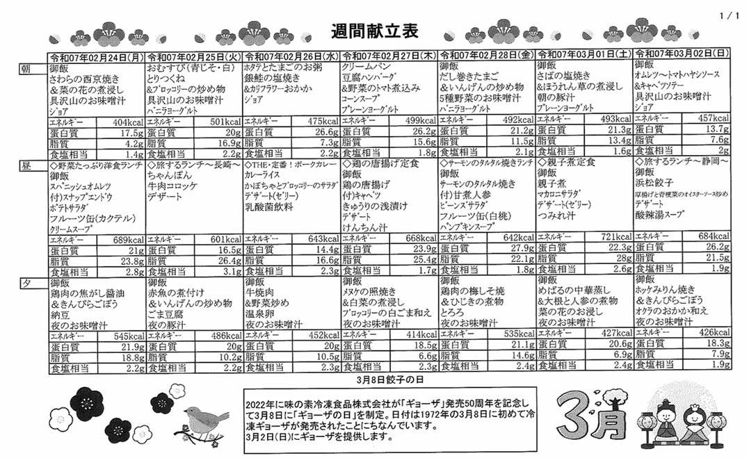2月24日(月)~3月2日(日)の献立表になります。ぜひご覧ください。