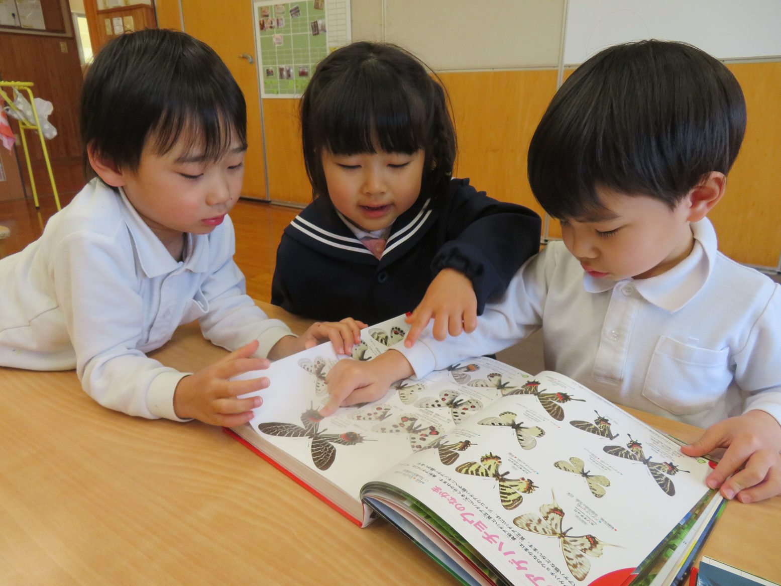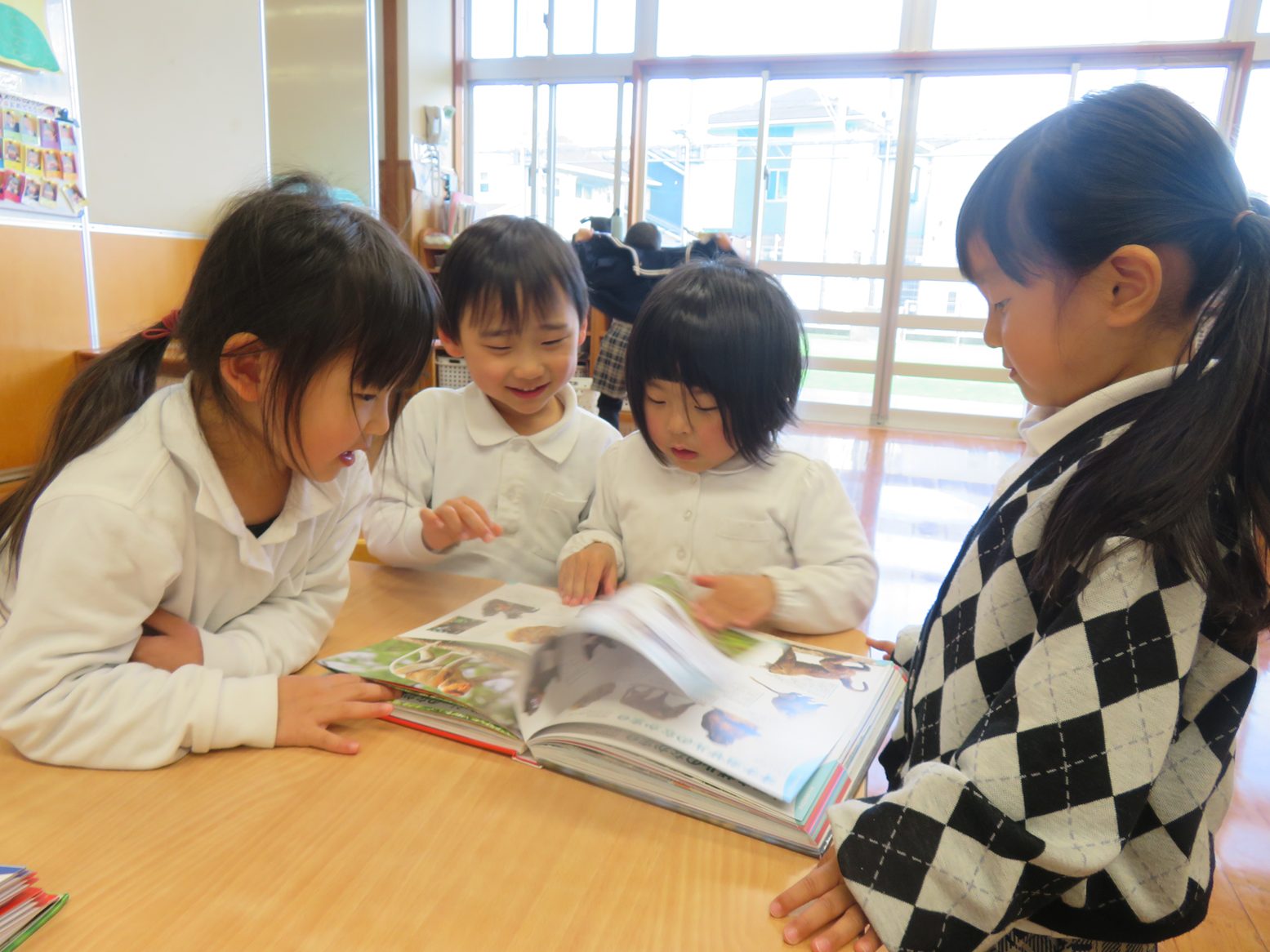 今週は室内遊びの時間に動物と虫の図鑑を用意したところ、「なんだ!」、「図鑑お家にもあるんだよ!」と興味津々な子どもたち。