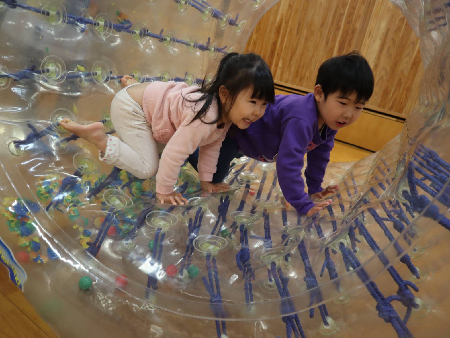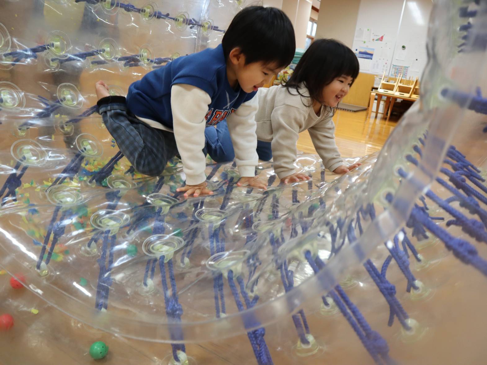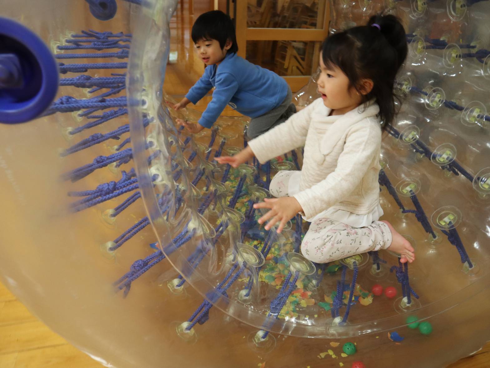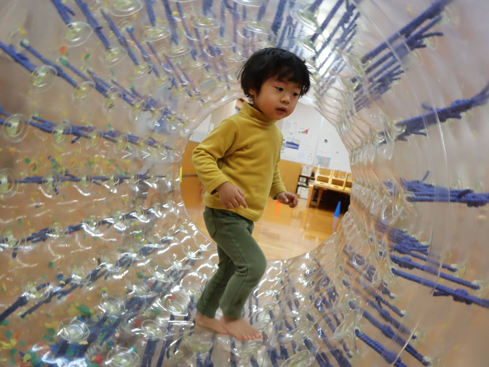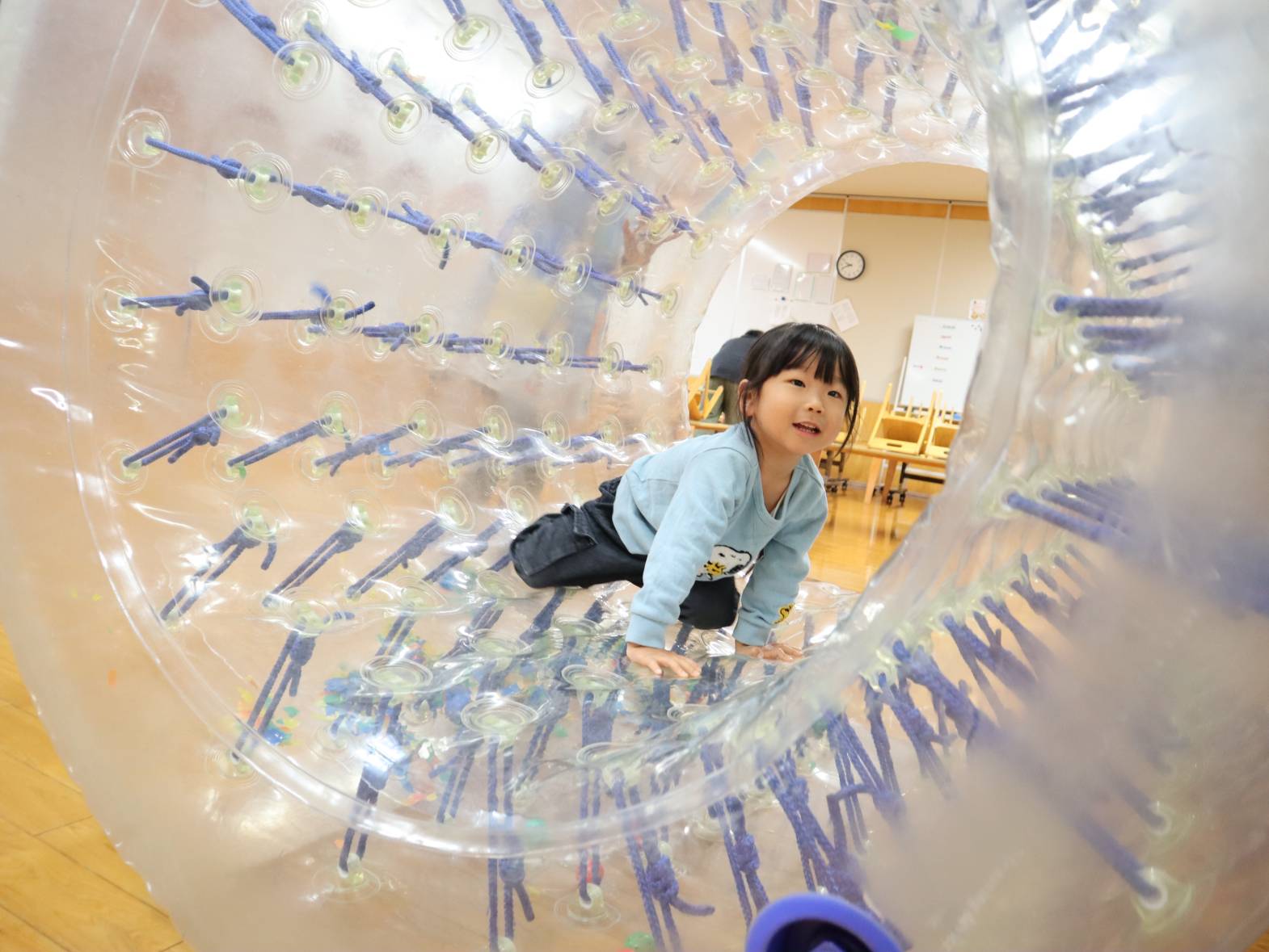 先日、サイバーホイールに初挑戦したぱんだ組さん。 「これなあに?」、「大きいね!」と、初めて見るサイバーホイールに興味津々! 早速中に入ってみます。手で前に押してみると・・・ 「進んだ!」、「すごーい!僕もやりたい!」と見ていた友だちから歓声があがりました。 1、2回乗るとすぐにコツを掴んで、一緒に入っている友だちと息を合わせながら「せーの!」と転がっていきます。 たくさん体を動かして大満足の子どもたち! 「またやりたいな。」、「楽しかったね!」とにこにこ笑顔でした。