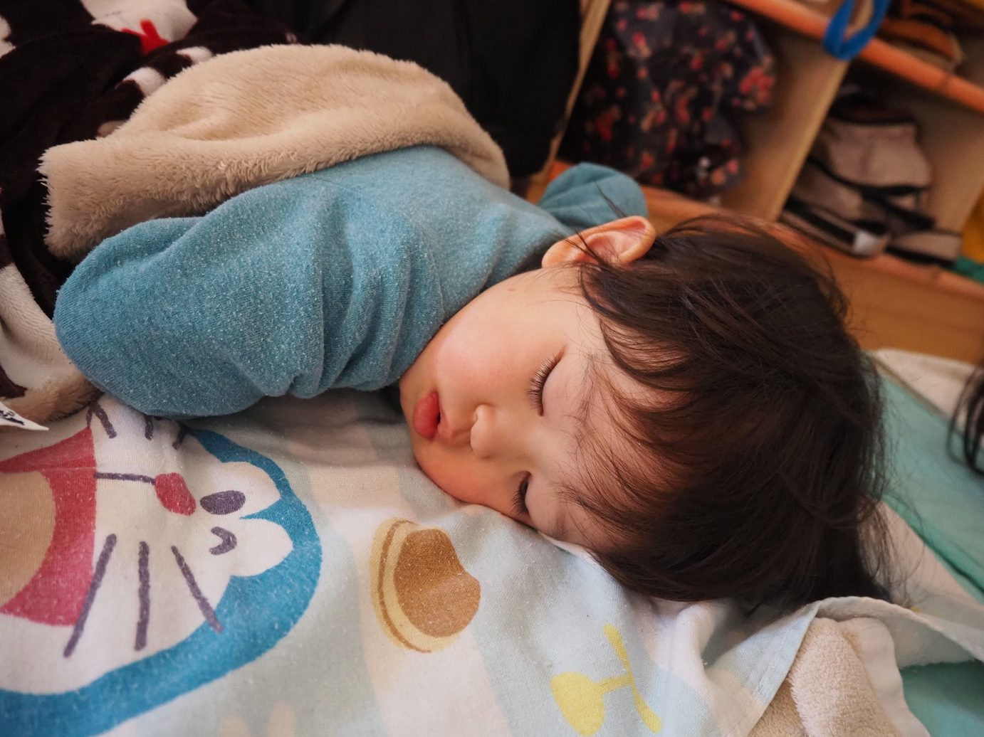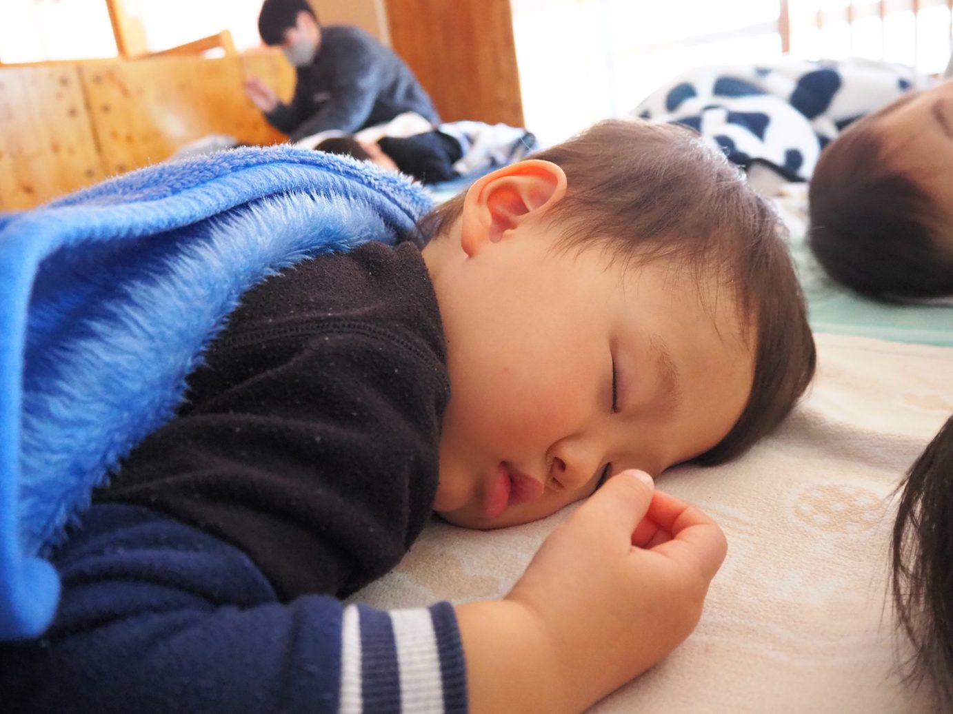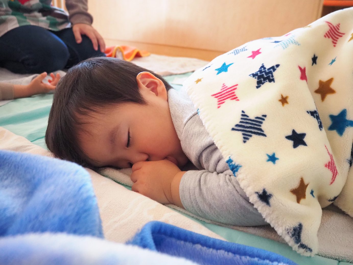 給食をたくさん食べてお腹いっぱいになった子どもたち。 完食した後は、自分でエプロンを片付け、自分の布団にゴロンをします。 「ここであってる?」、「トントンしてください!」など言う姿や自分から入眠する姿も見られてきました。 午睡中に寝言で、「まま~ぱぱ~えへへ。」と笑う姿も見られるため、どんな夢を見ているのかとても気になります♪ たくさん寝て、お昼からも元気いっぱい遊びたいと思います。