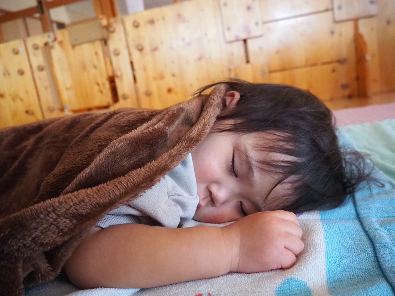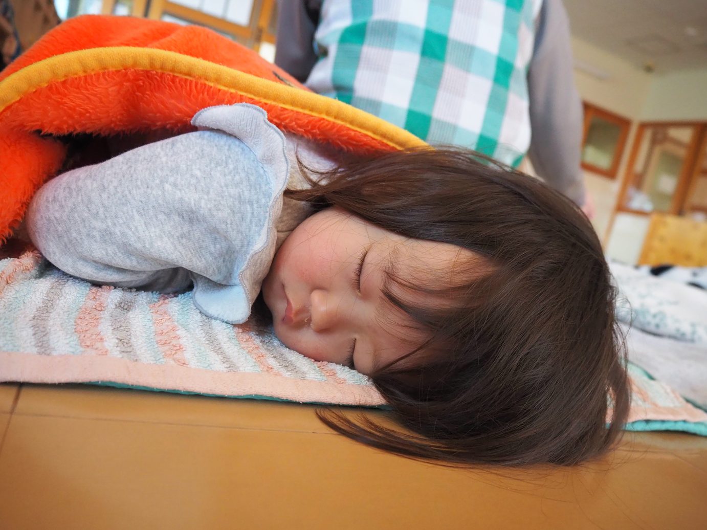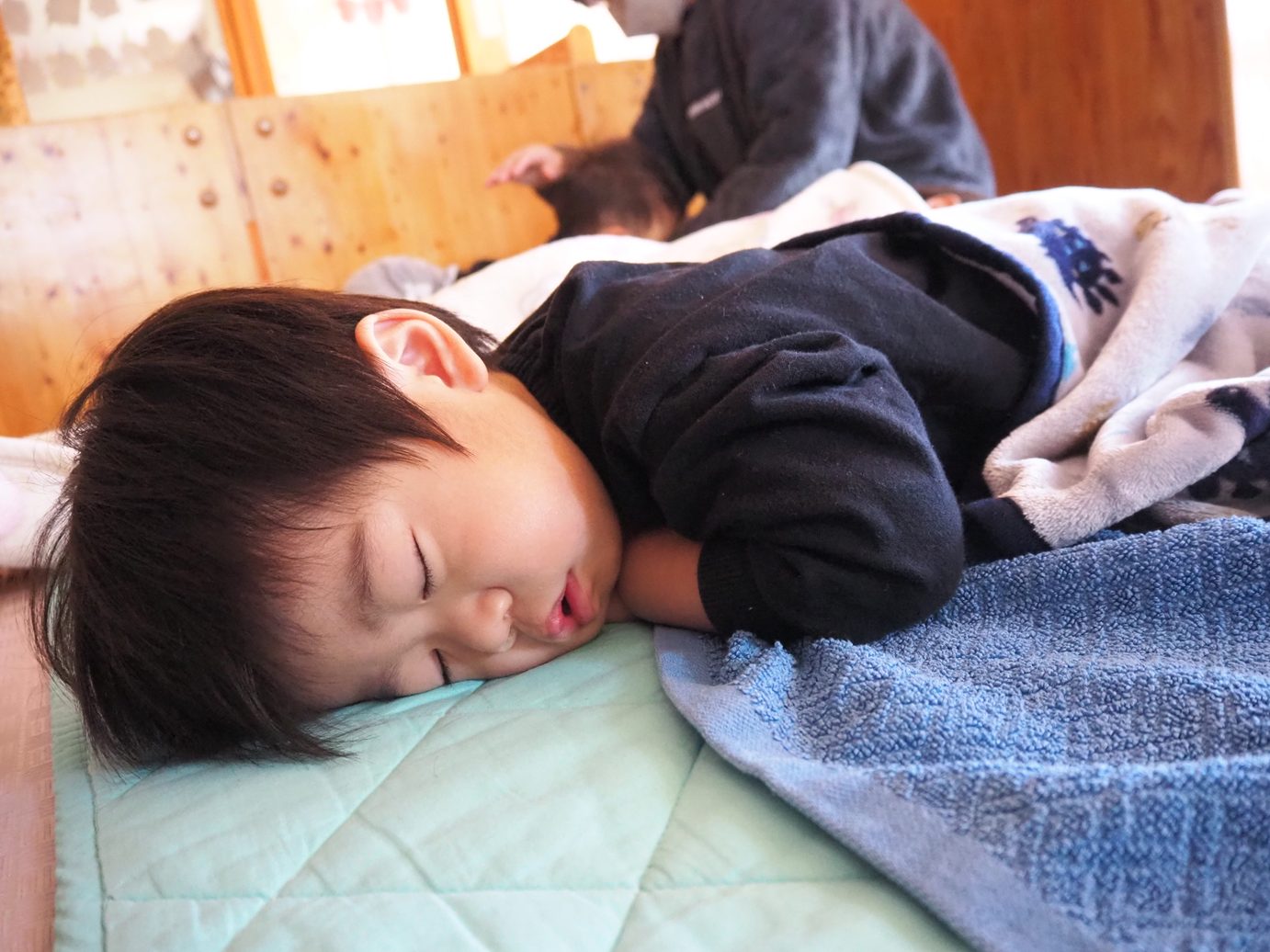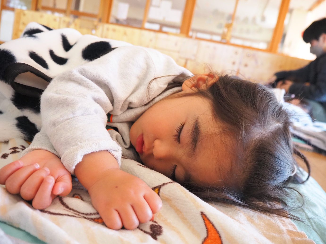 給食をたくさん食べてお腹いっぱいになった子どもたち。 完食した後は、自分でエプロンを片付け、自分の布団にゴロンをします。 「ここであってる?」、「トントンしてください!」など言う姿や自分から入眠する姿も見られてきました。 午睡中に寝言で、「まま~ぱぱ~えへへ。」と笑う姿も見られるため、どんな夢を見ているのかとても気になります♪ たくさん寝て、お昼からも元気いっぱい遊びたいと思います。
