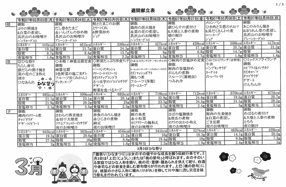 3月3日(月)~3月9日(日)の献立表になります。ぜひご覧ください。