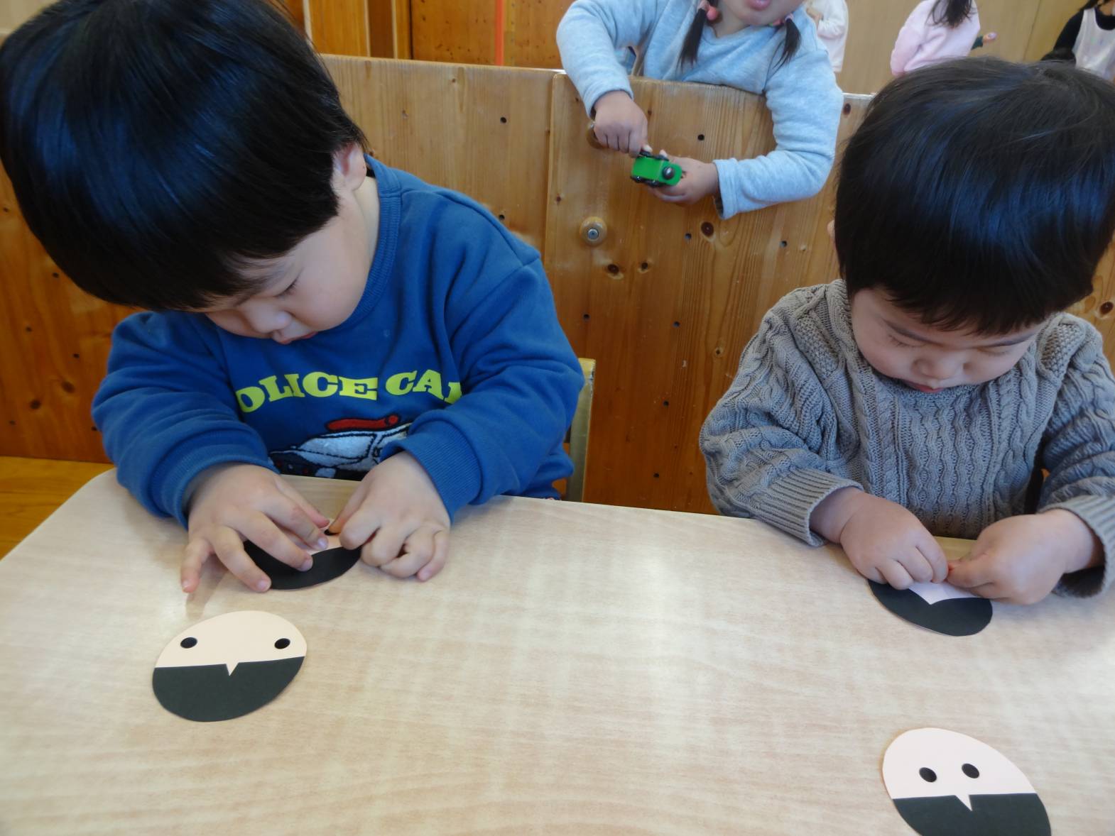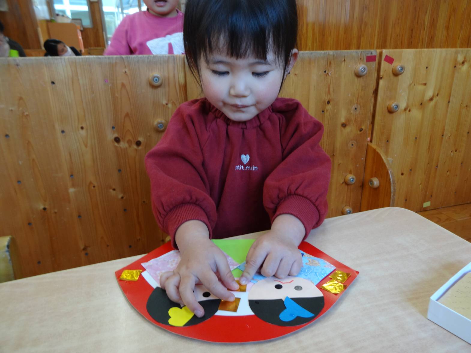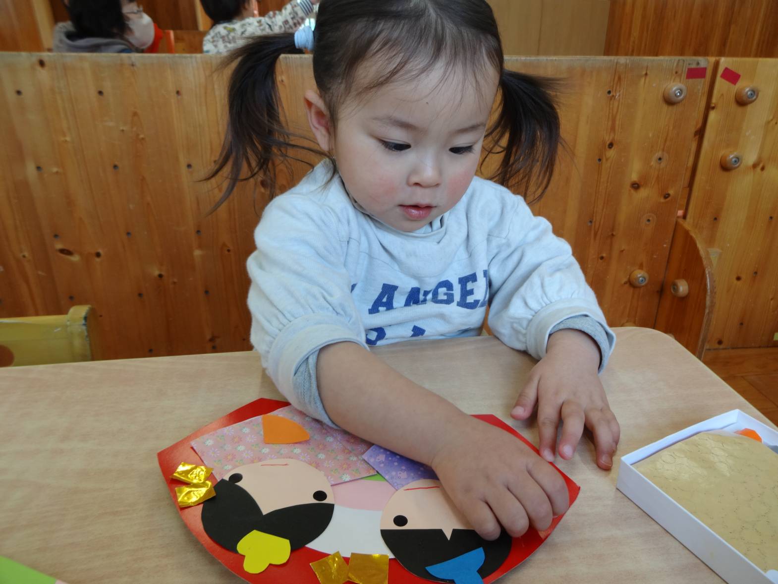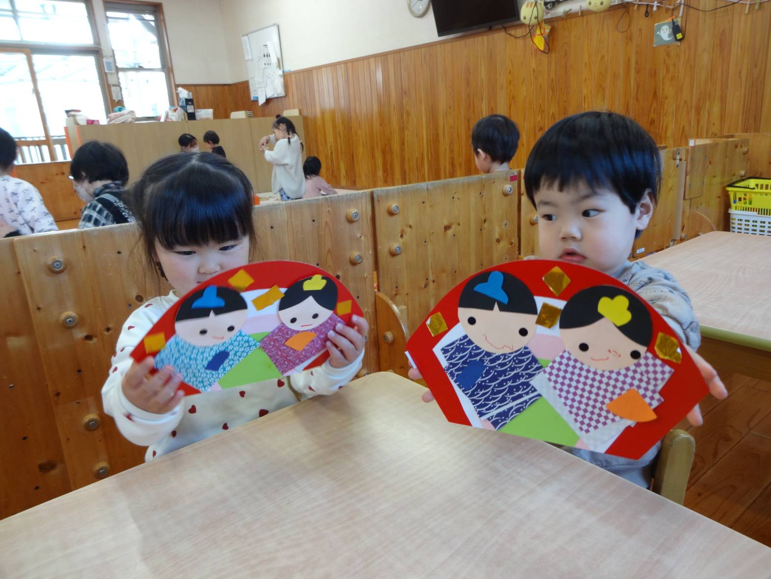 ひなまつり製作をしました。 タオルを上手に畳むことができるようになってきたので、折り紙を使った製作に挑戦しました! 好きな柄の折り紙を選び・・・ 「はんぶんこ、はんぶんこ」と言いながら力を込めて折る子どもたち。 目は小さなシールを貼り、口はペンでかいて顔を作りました。 そして見本を見ながらパーツを貼って完成!! 色んな表情のかわいいひな人形ができました。 できあがったお内裏様とお雛様を「パパ、ママ」と言いながら嬉しそうに見ていたこあら組さんです!
