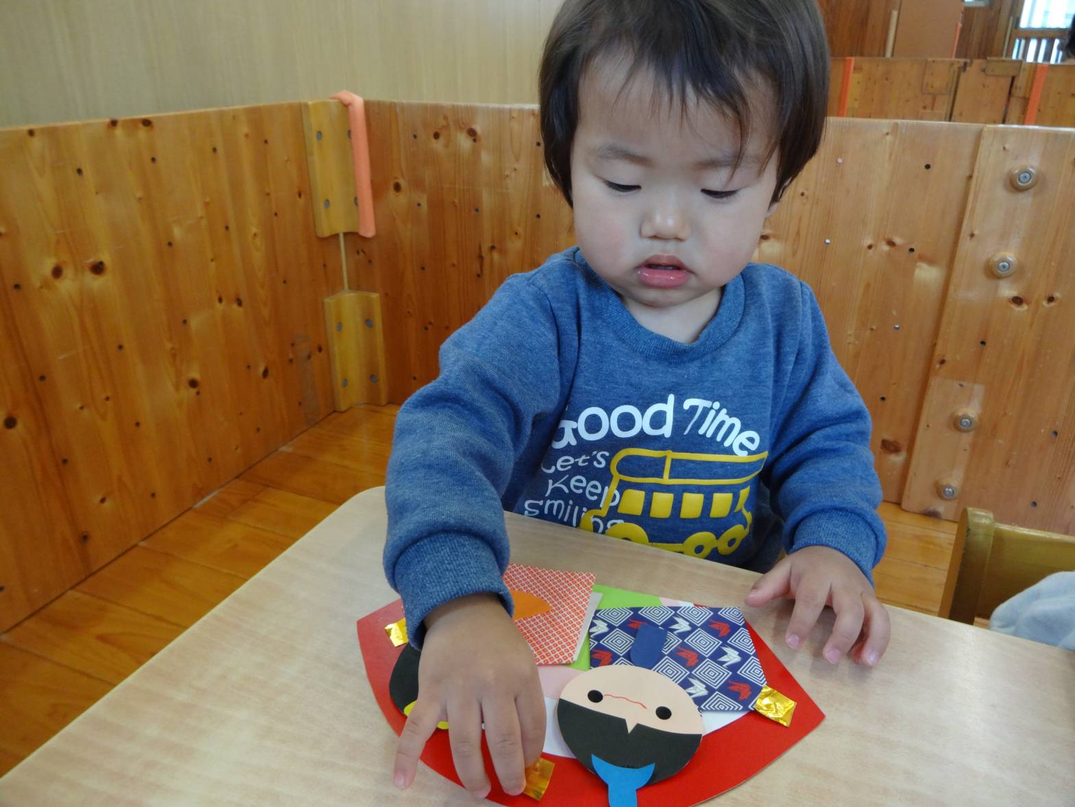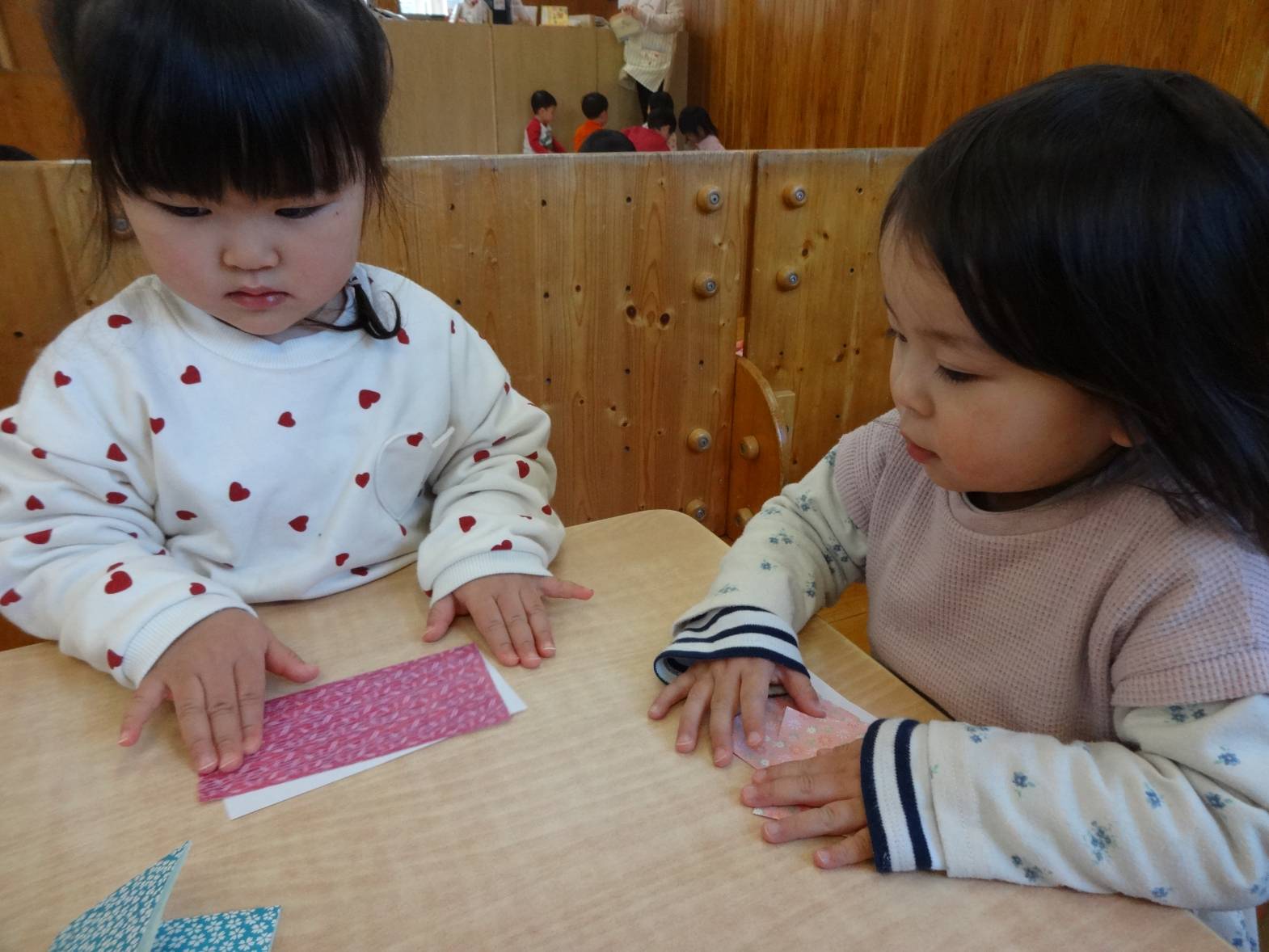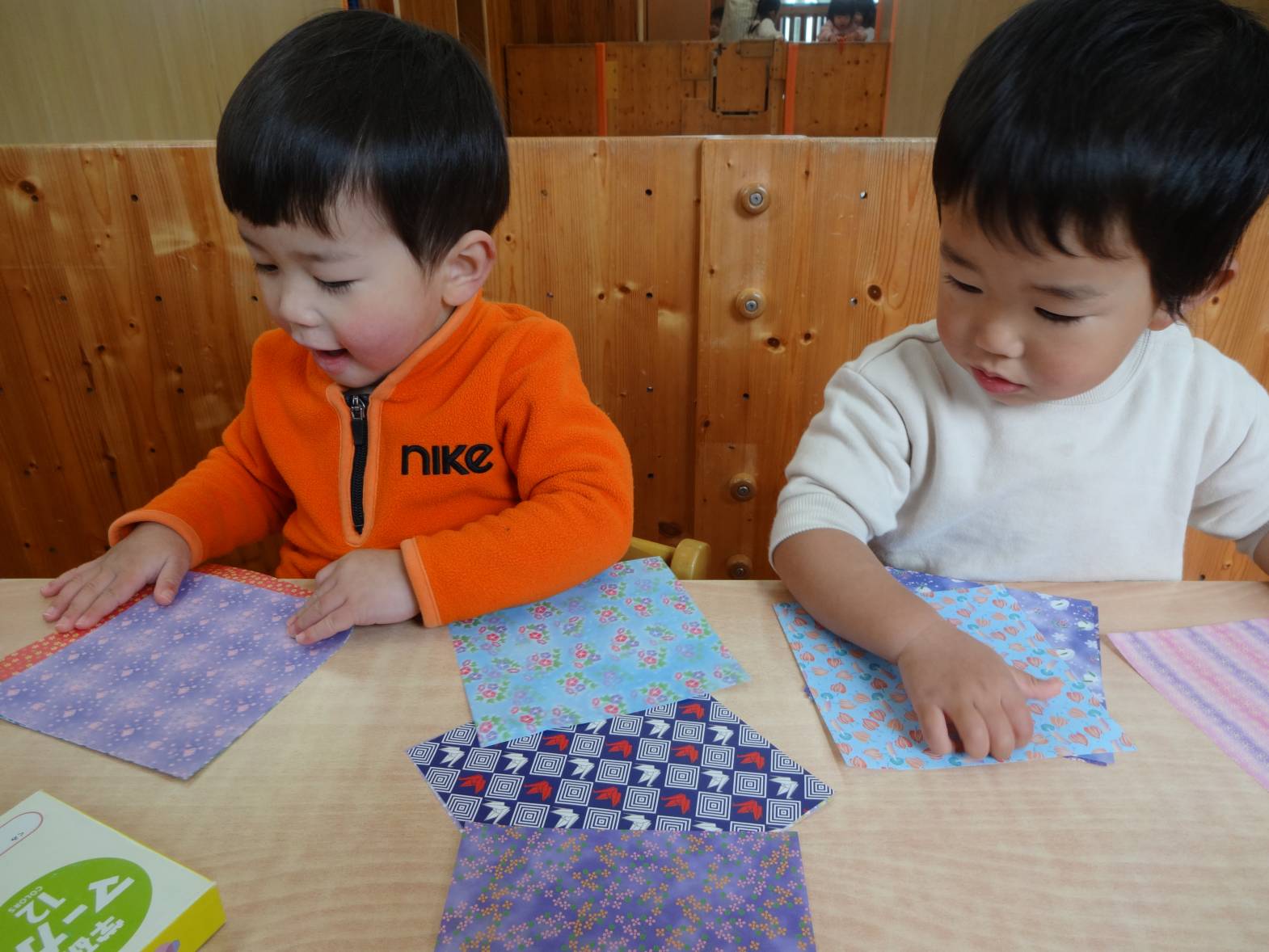 ひなまつり製作をしました。 タオルを上手に畳むことができるようになってきたので、折り紙を使った製作に挑戦しました! 好きな柄の折り紙を選び・・・ 「はんぶんこ、はんぶんこ」と言いながら力を込めて折る子どもたち。 目は小さなシールを貼り、口はペンでかいて顔を作りました。 そして見本を見ながらパーツを貼って完成!! 色んな表情のかわいいひな人形ができました。 できあがったお内裏様とお雛様を「パパ、ママ」と言いながら嬉しそうに見ていたこあら組さんです!
