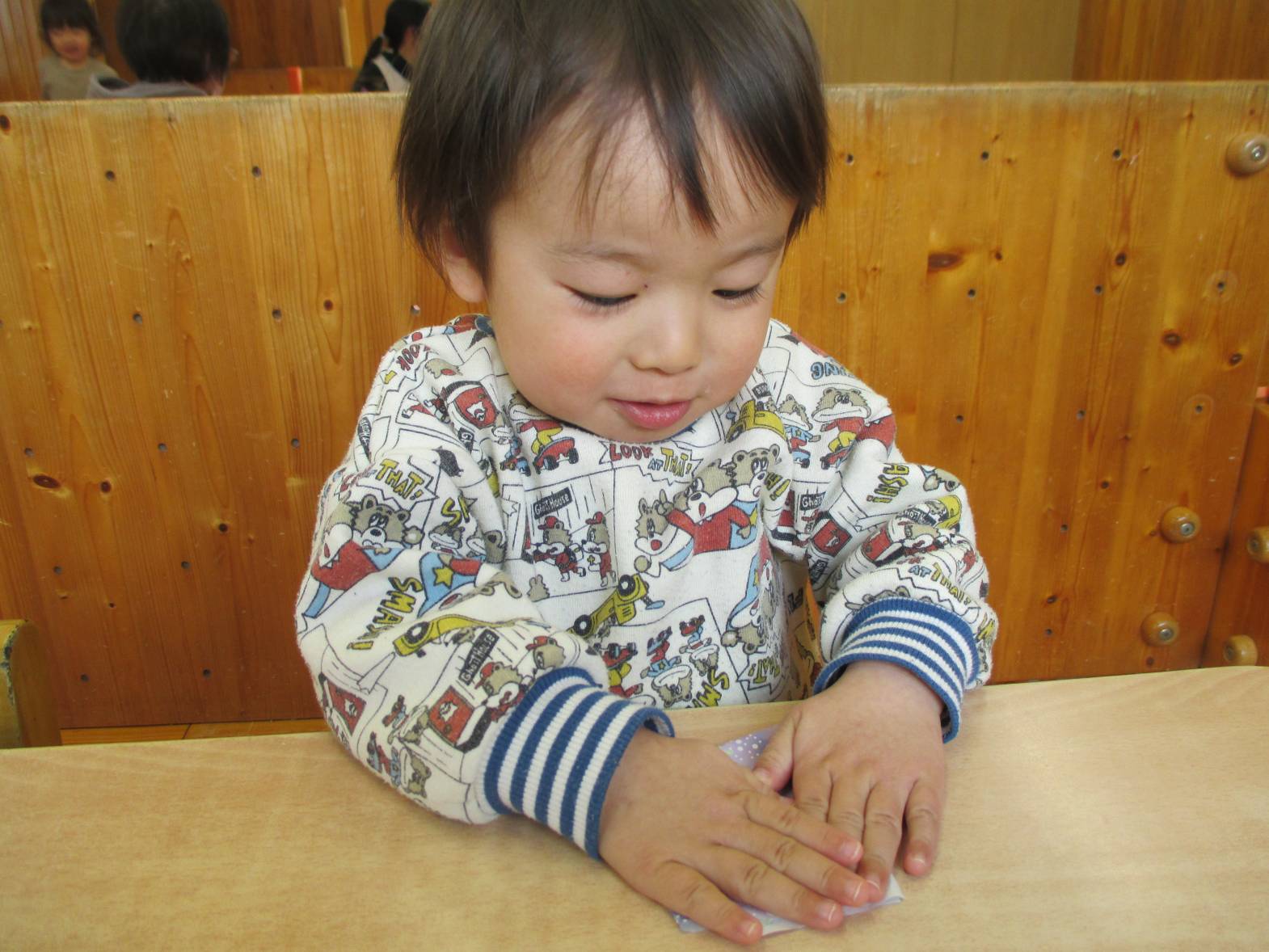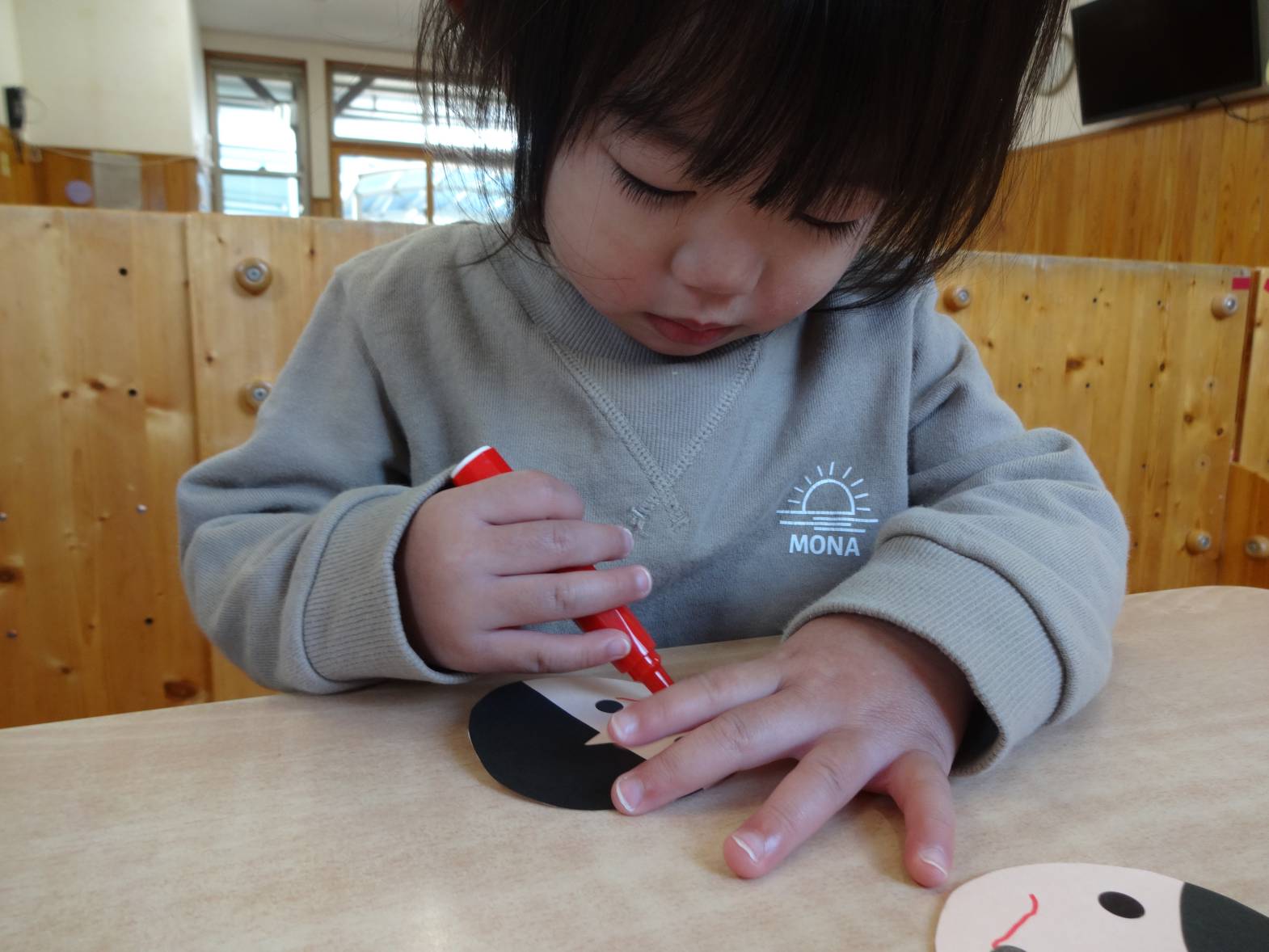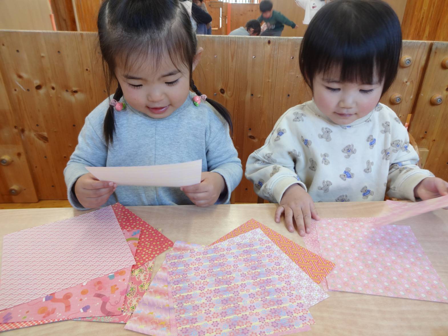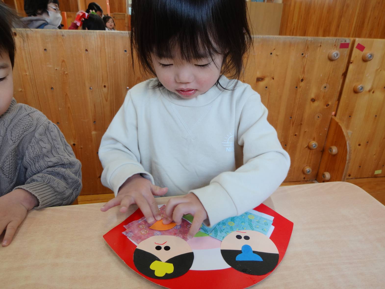 ひなまつり製作をしました。 タオルを上手に畳むことができるようになってきたので、折り紙を使った製作に挑戦しました! 好きな柄の折り紙を選び・・・ 「はんぶんこ、はんぶんこ」と言いながら力を込めて折る子どもたち。 目は小さなシールを貼り、口はペンでかいて顔を作りました。 そして見本を見ながらパーツを貼って完成!! 色んな表情のかわいいひな人形ができました。 できあがったお内裏様とお雛様を「パパ、ママ」と言いながら嬉しそうに見ていたこあら組さんです!