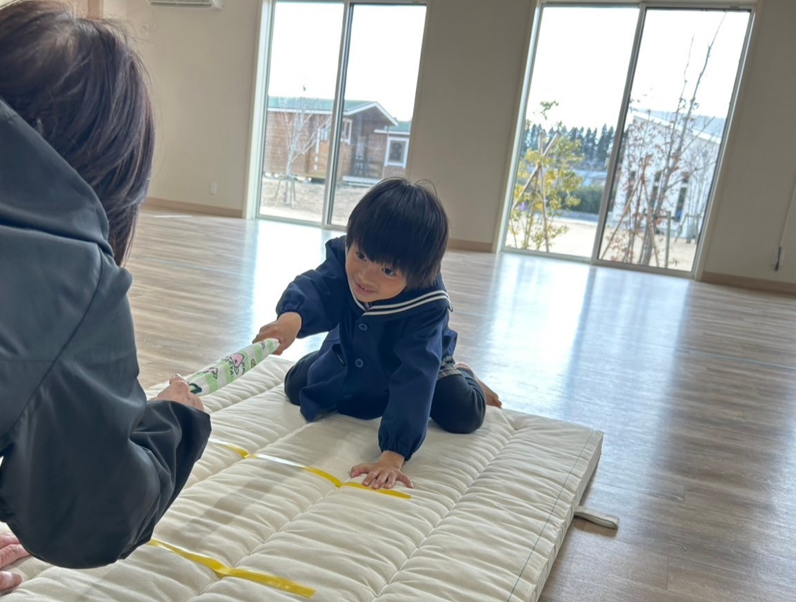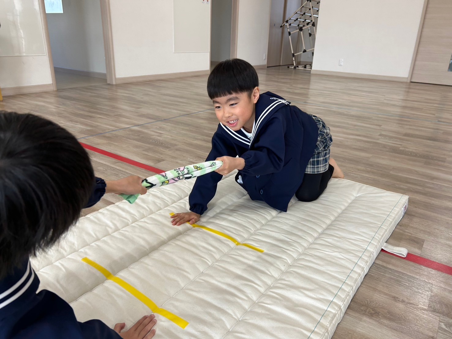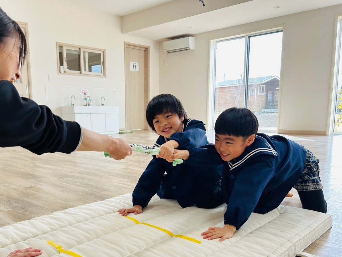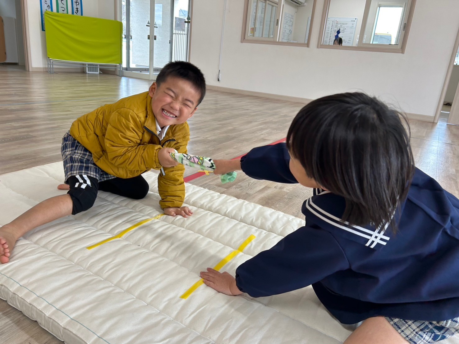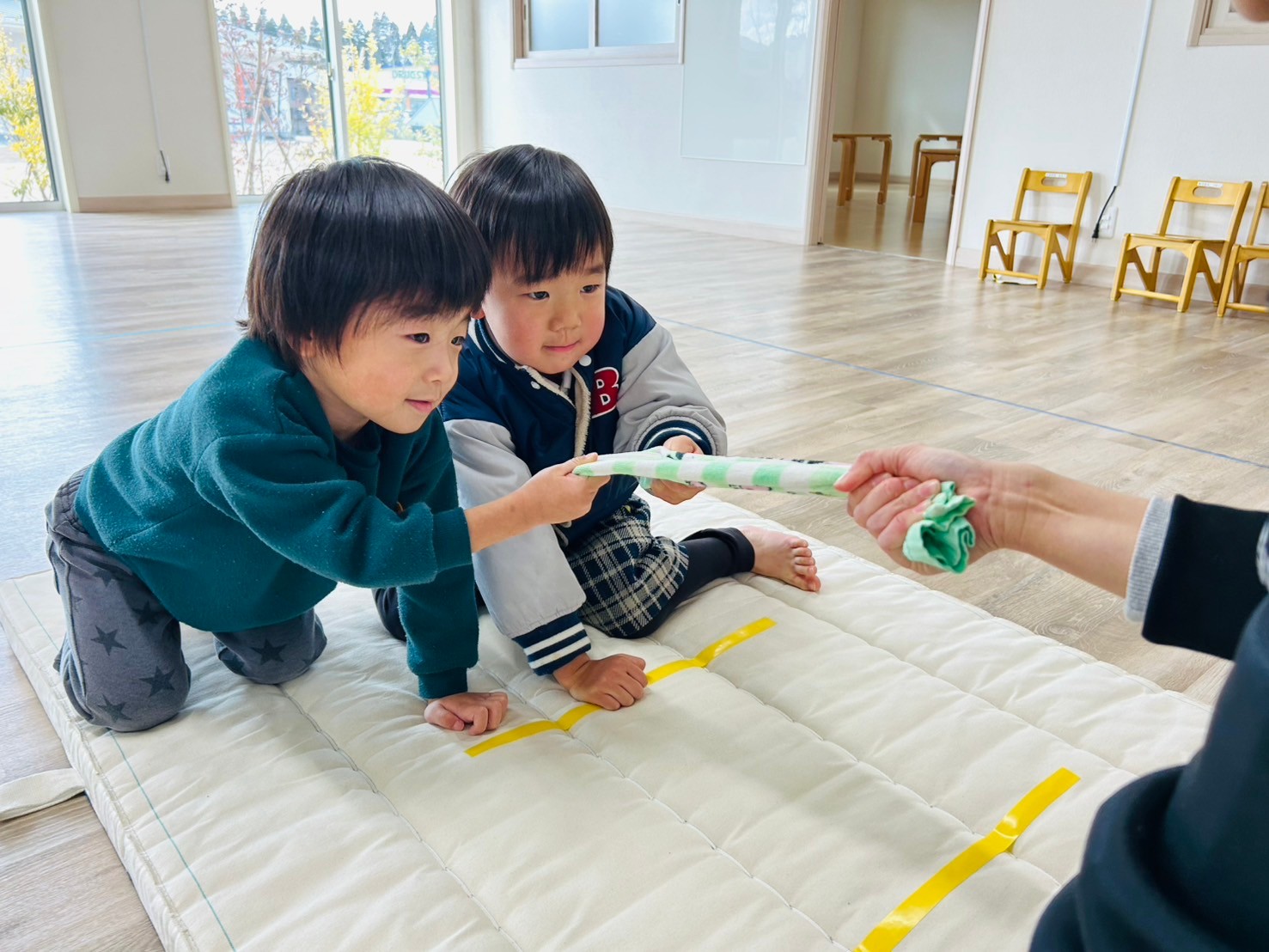 初めは四つ這いの姿勢を続けることが難しい子どもたちでしたが、「いぬのポーズだよ!」と声を掛けることで姿勢を意識してタオルを持つことができていました!