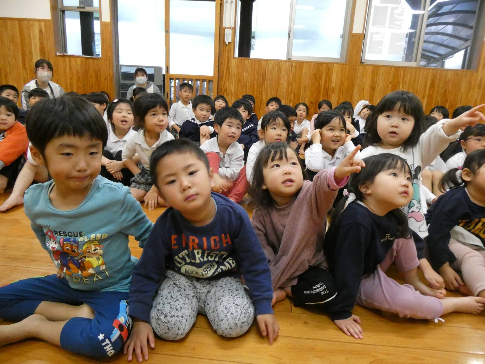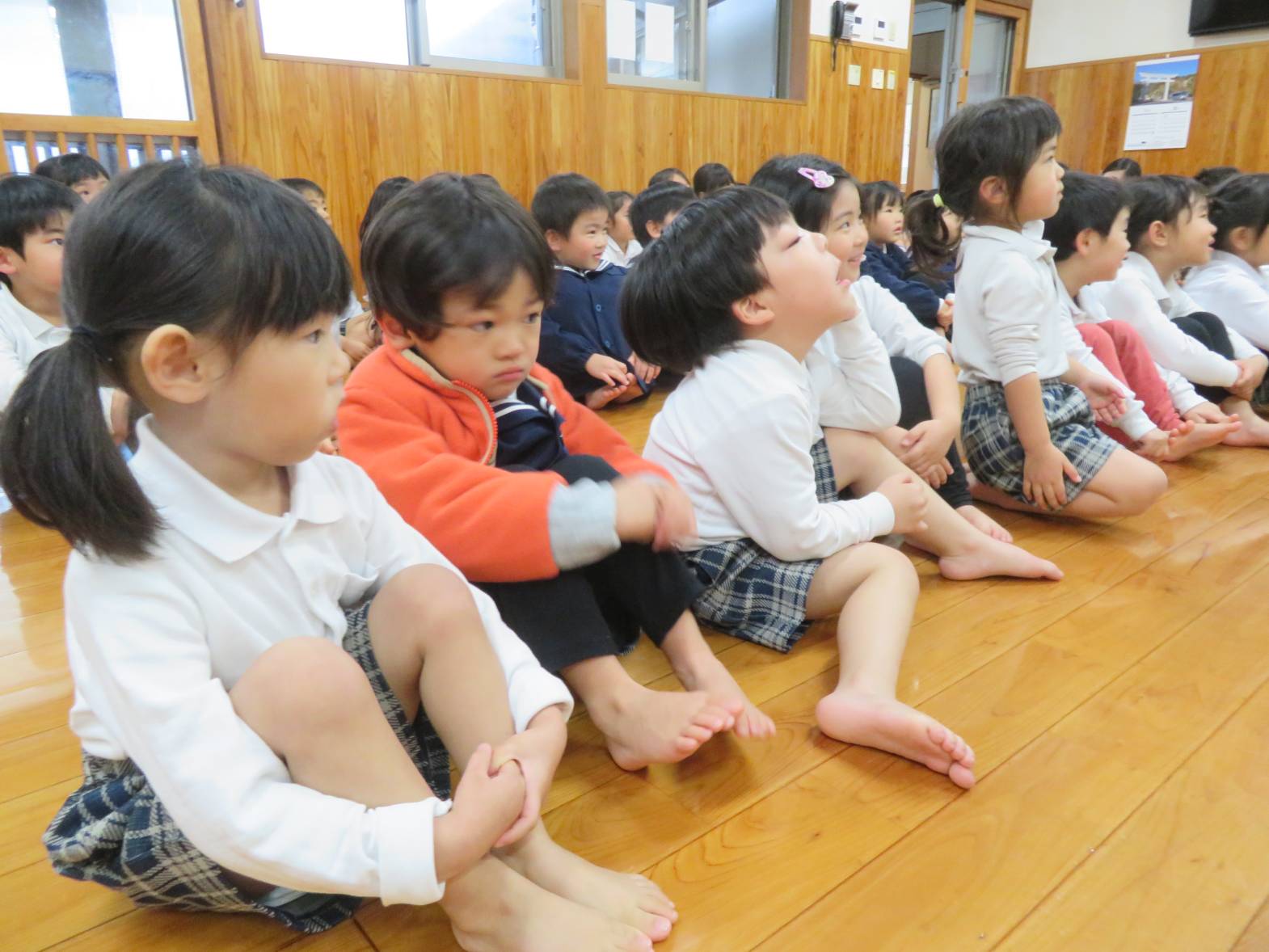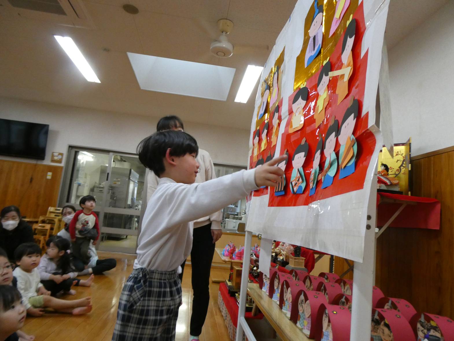 ひなまつりの由来を聞いたり、クイズに答えたりする子どもたち。